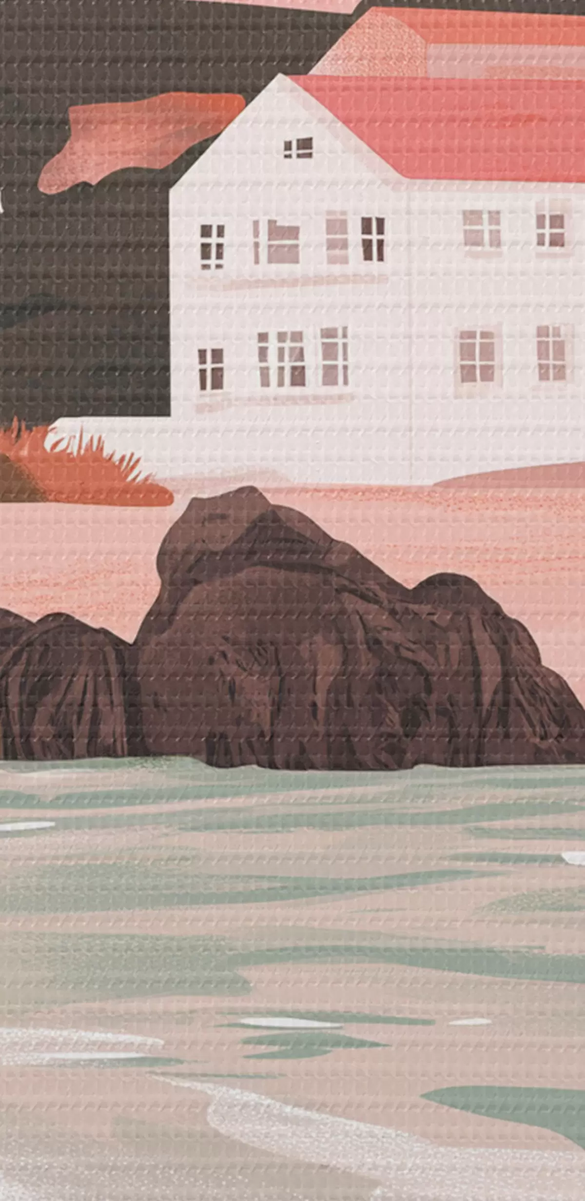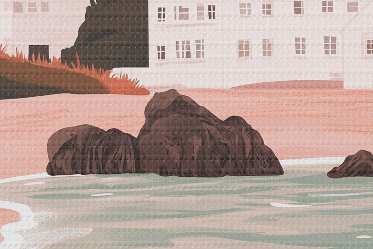 Attēls Mājīga rozā pludmale ar baltām mājiņām un jūras gliemežvākiem Nr r44713