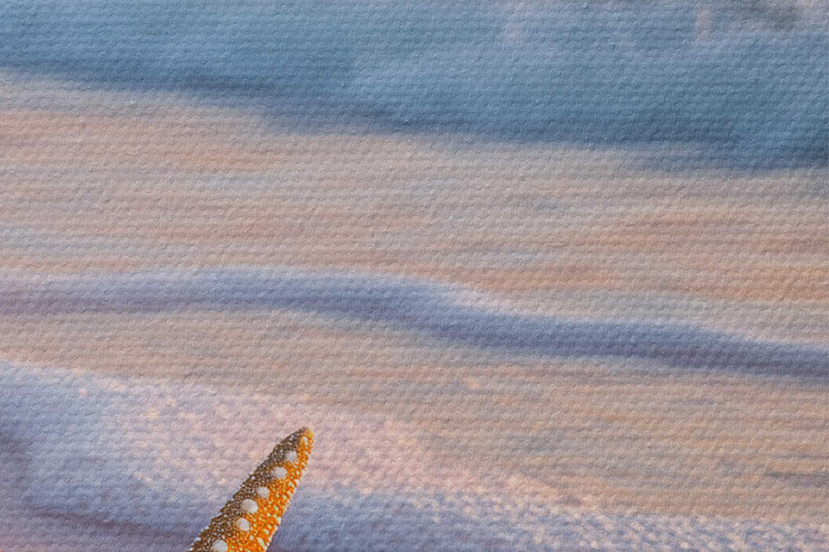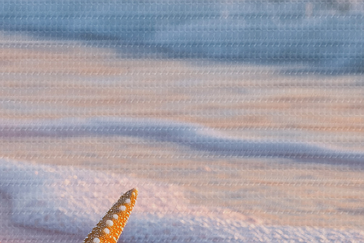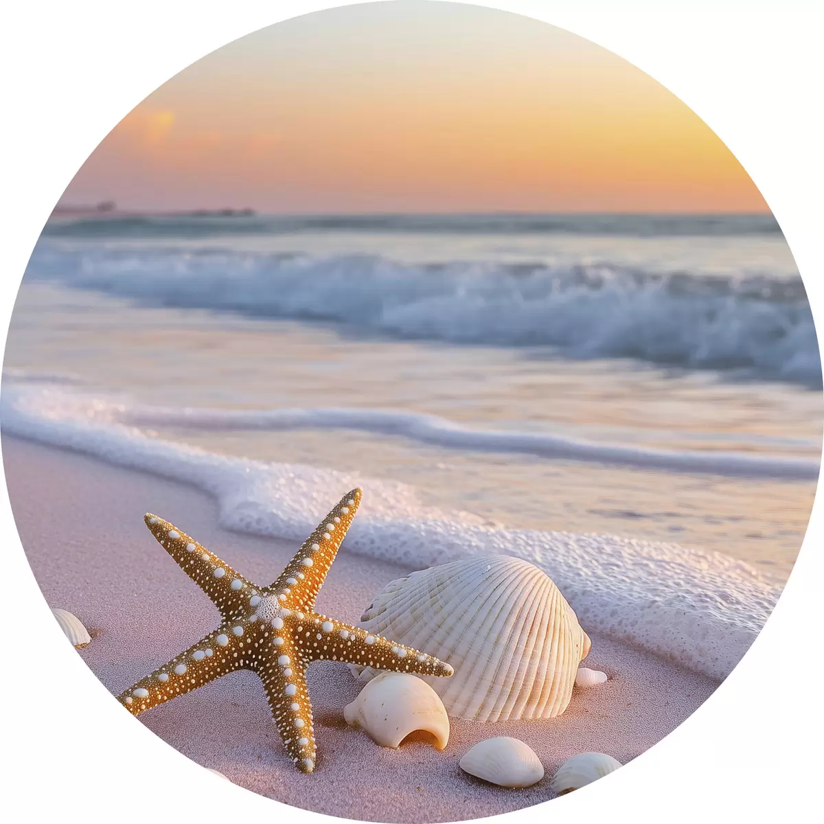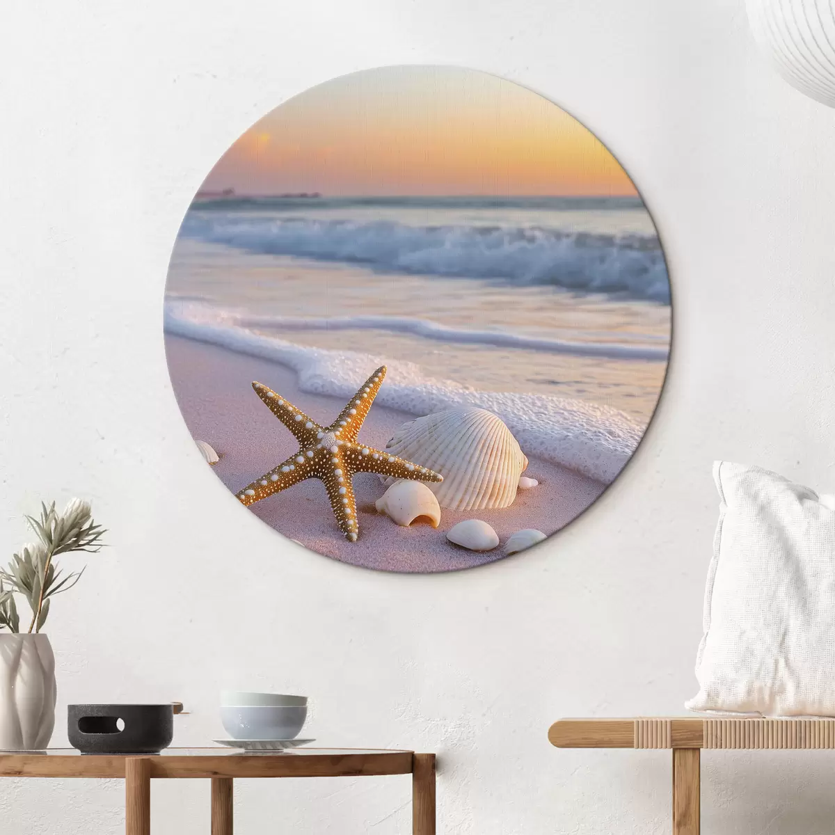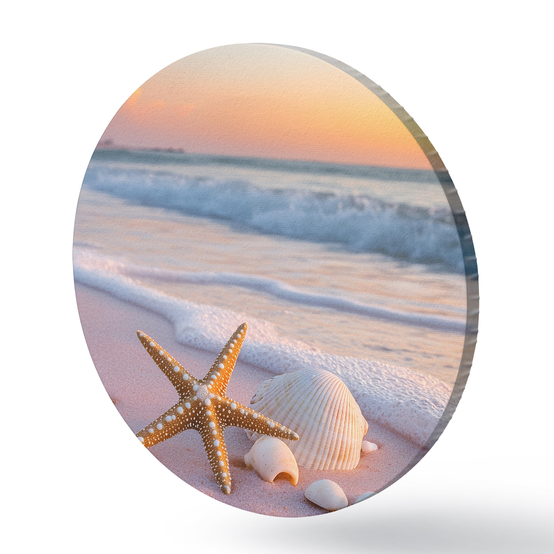 Apaļas gleznas Jūras piekraste ar jūras zvaigznēm, gliemežvākiem un viļņiem r44714