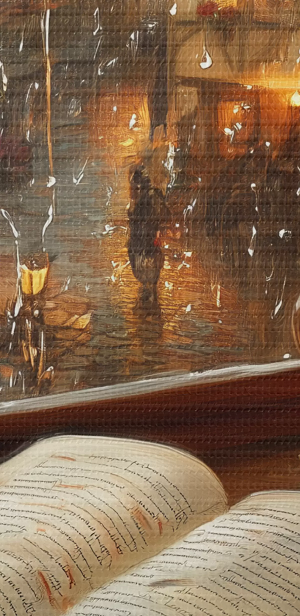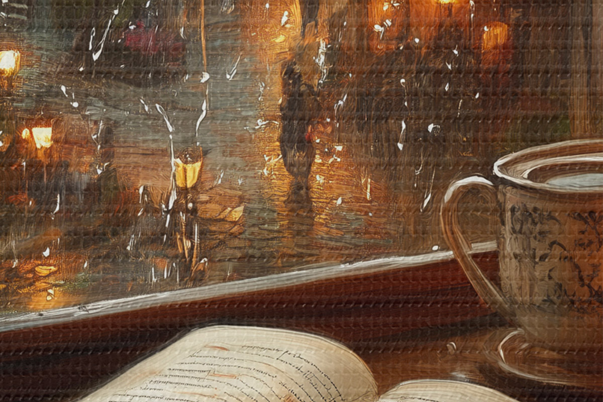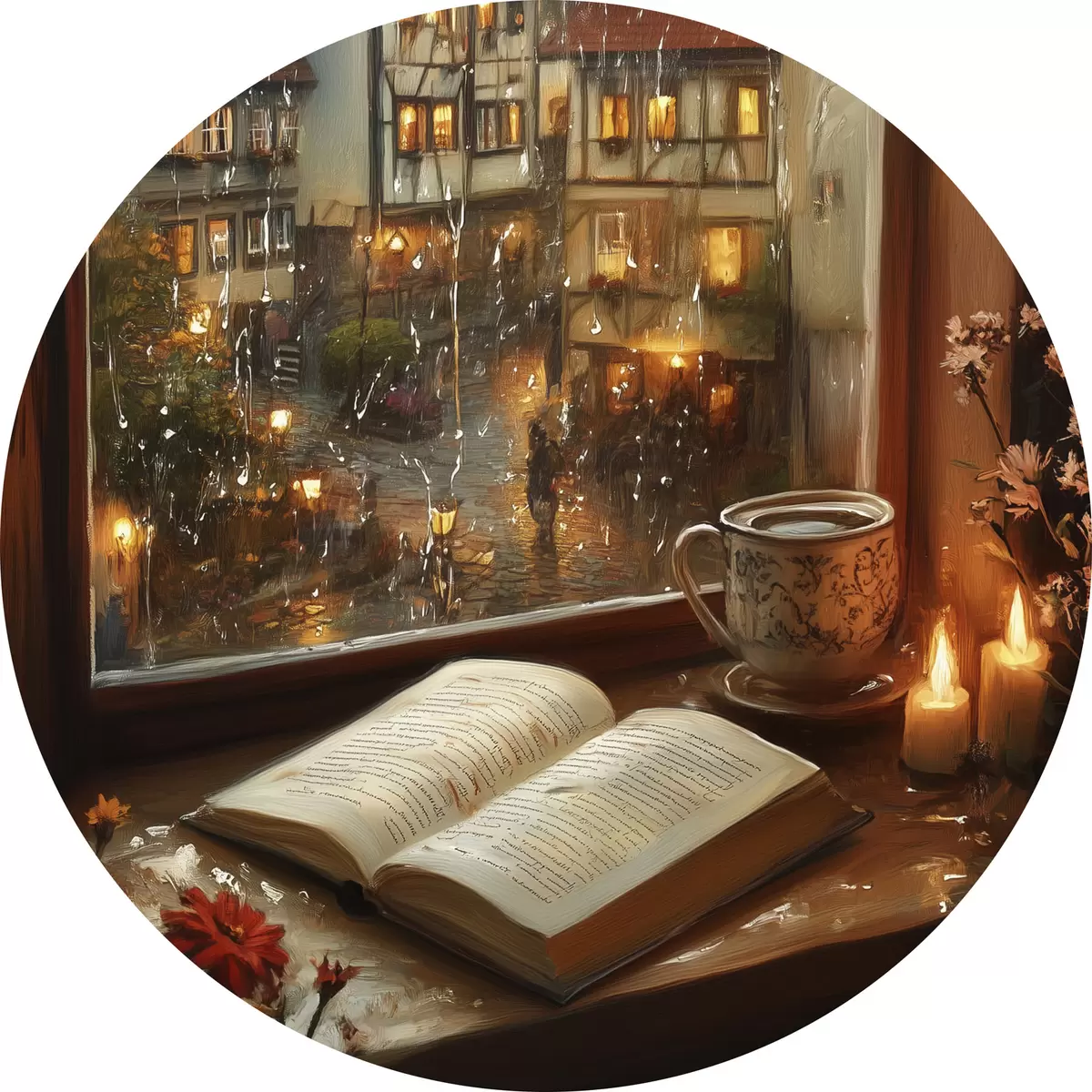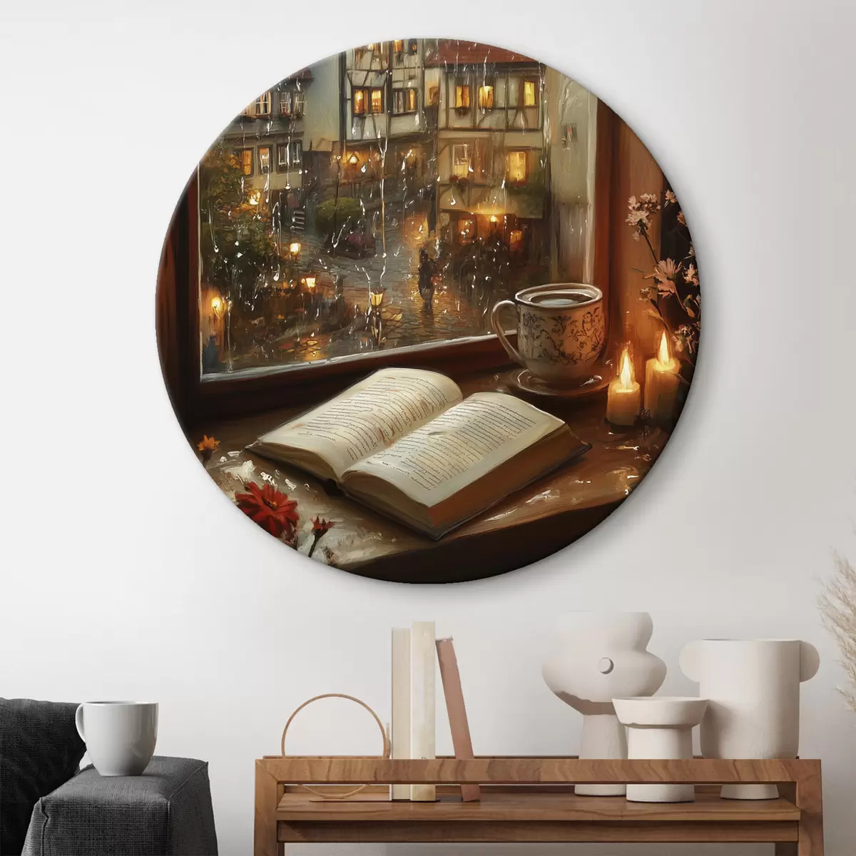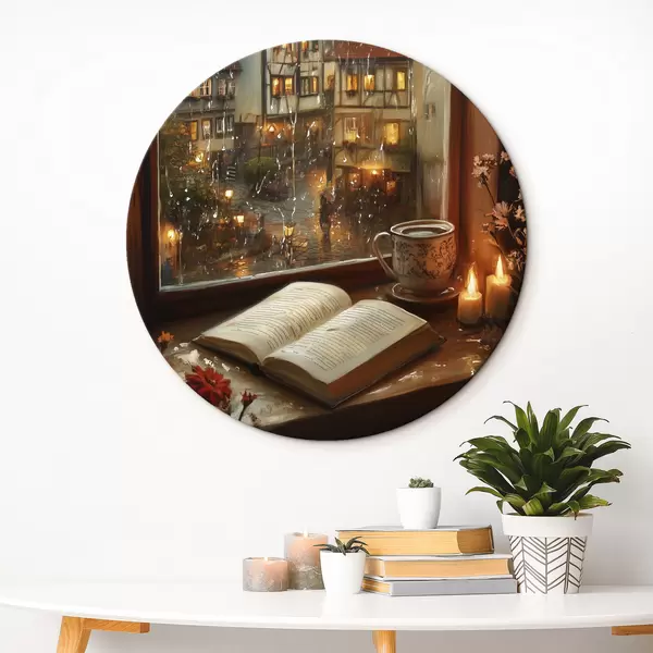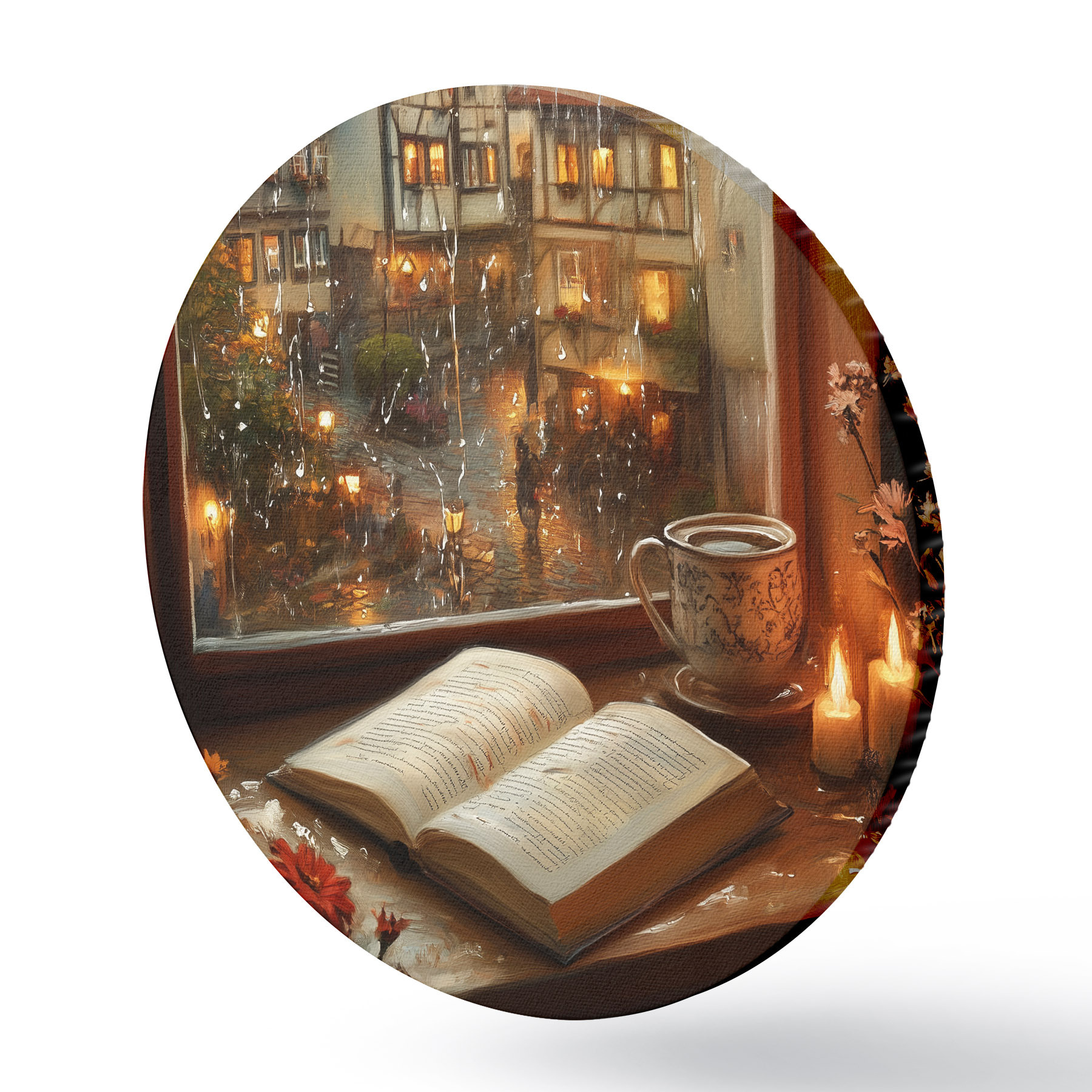 Apaļas gleznas Grāmata uz palodzes, sveces, lietaina diena, mājīgs r44722