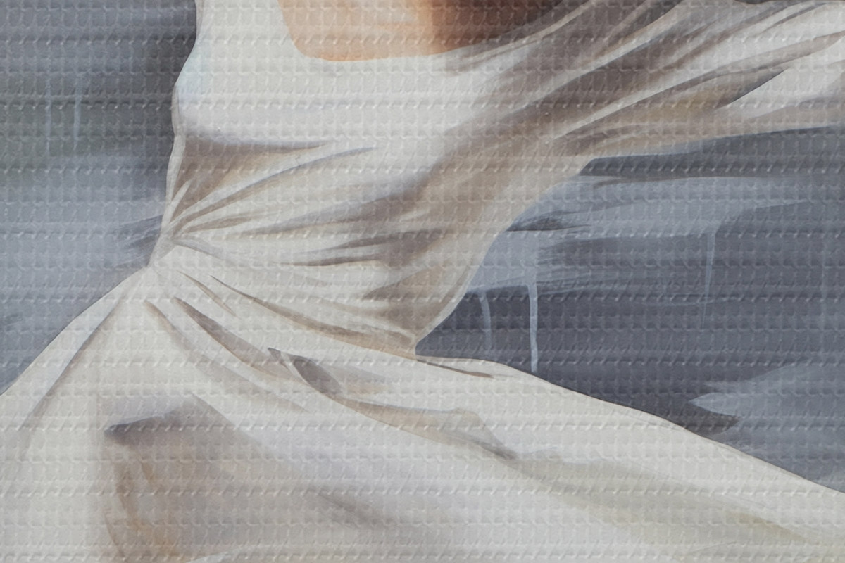 Smalkais diegu pinums uz šī audekla atgādina profesionālu mākslinieku audeklu virsmu.