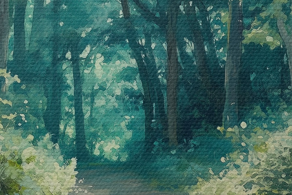 Attēls Zaļš mežs ar kokiem un saules gaismu Nr r44784