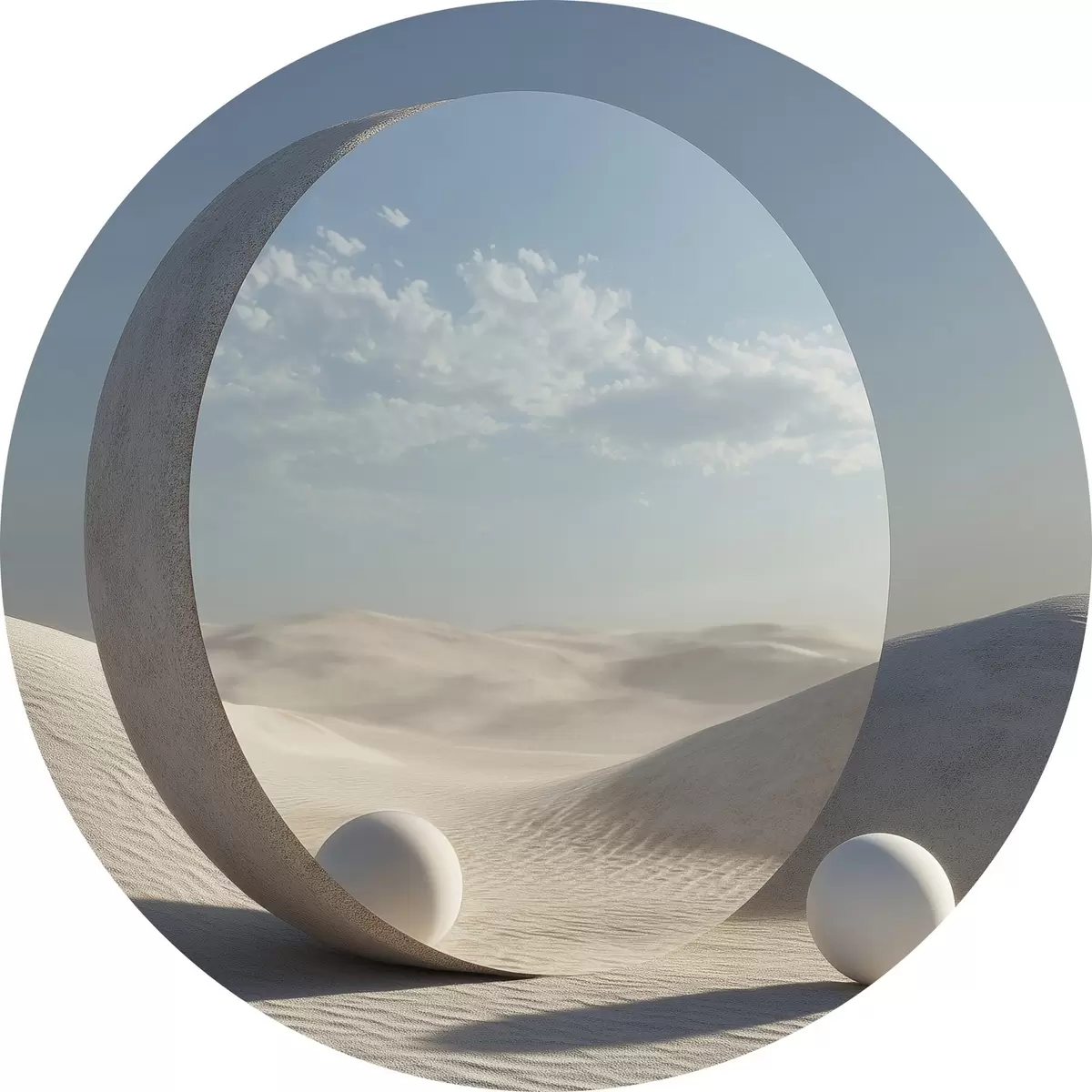 Attēls Sirreāla tuksneša ainava ar apaļu spoguli, kas atspoguļo debesis un mēnesi Nr r44792