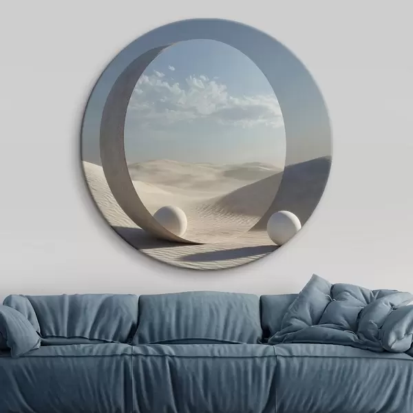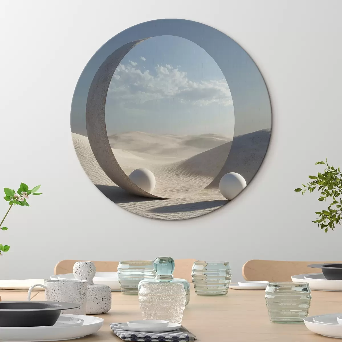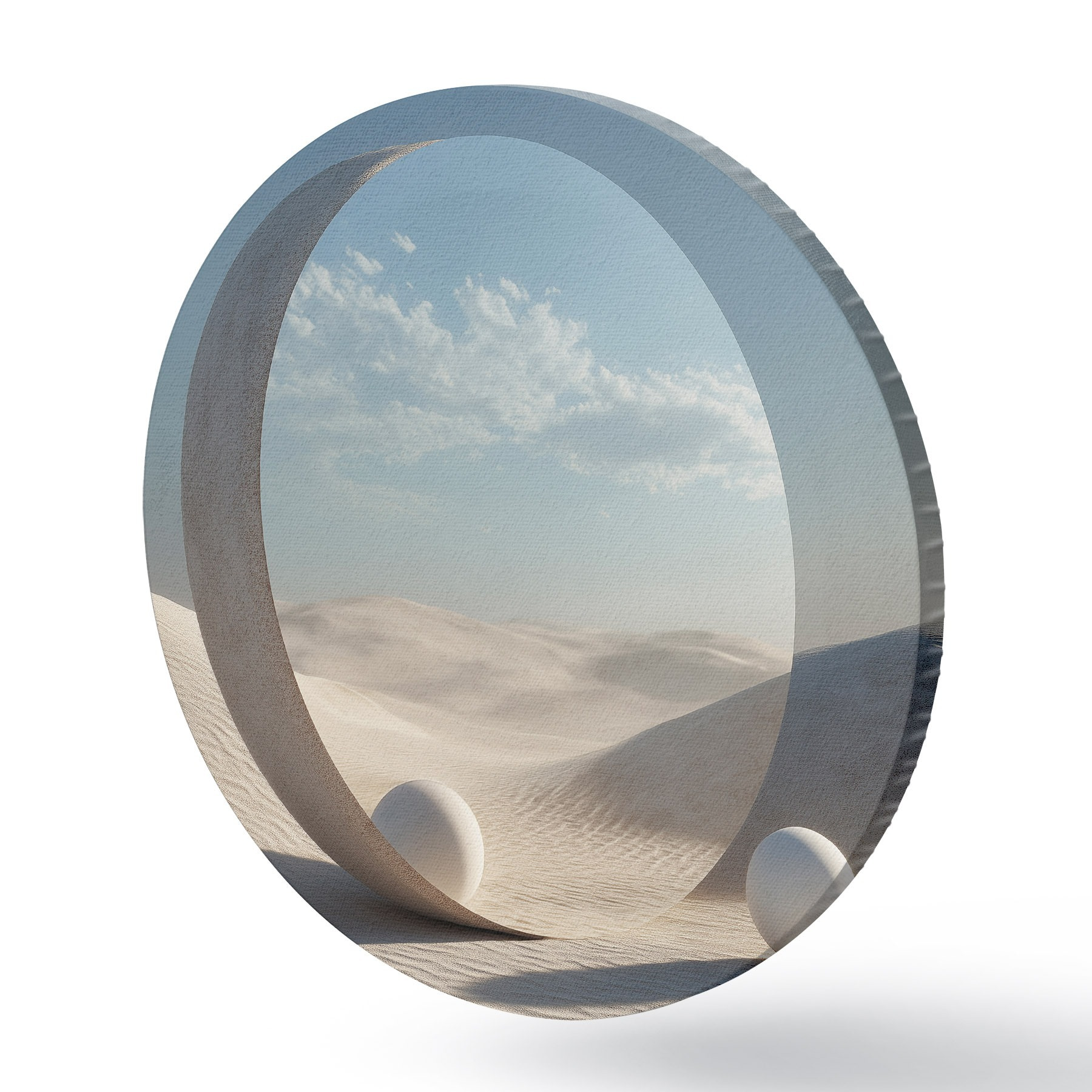 Apaļas gleznas Sirreāla tuksneša ainava ar apaļu spoguli, kas atspoguļo debesis un mēnesi r44792