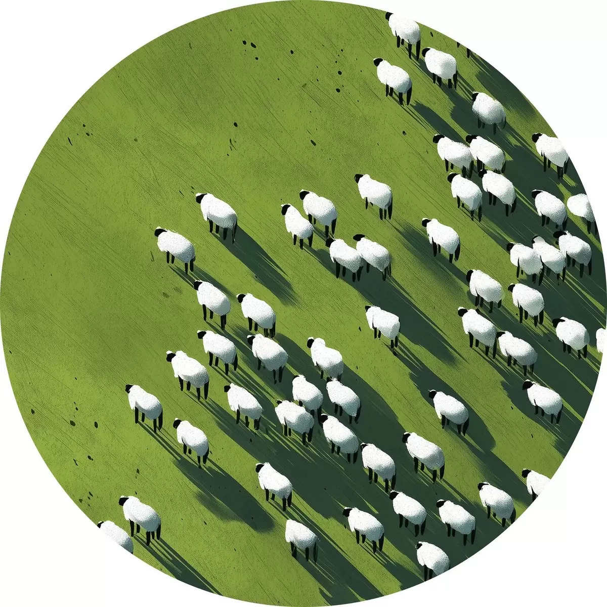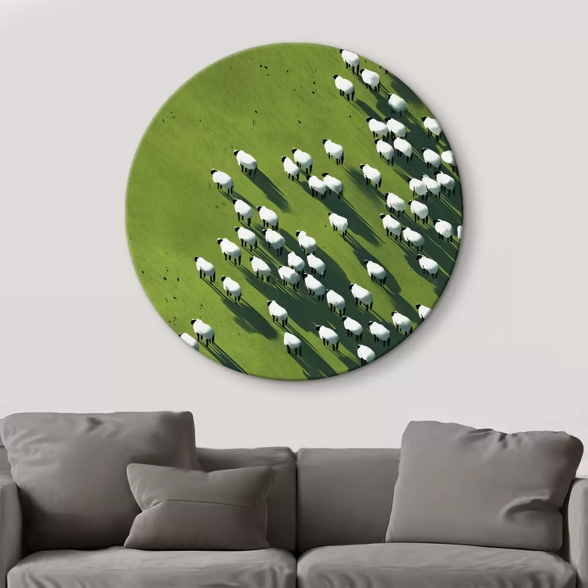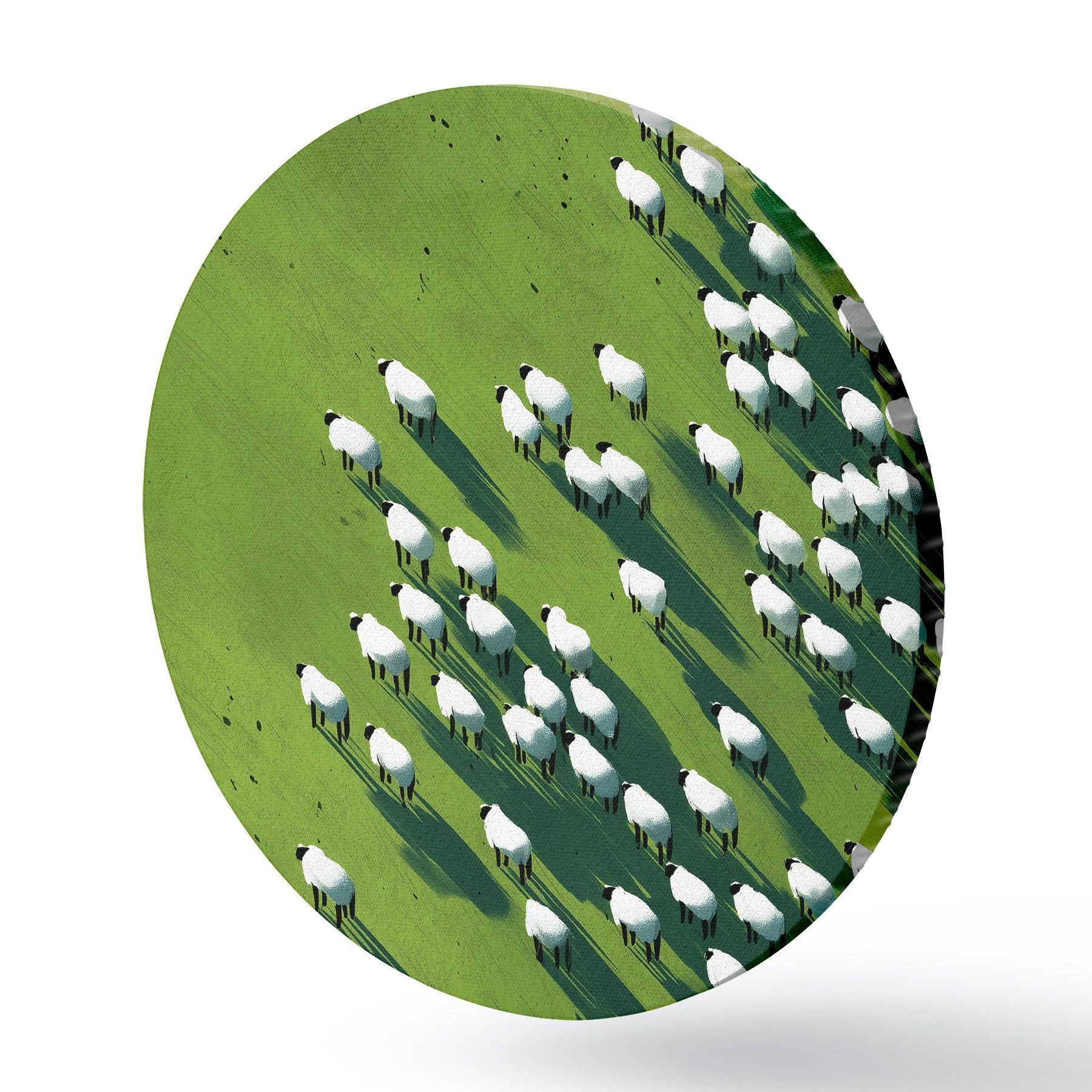 Apaļas gleznas Zaļš lauks ar aitu ganāmpulku, abstrakcija, skats no gaisa r44793