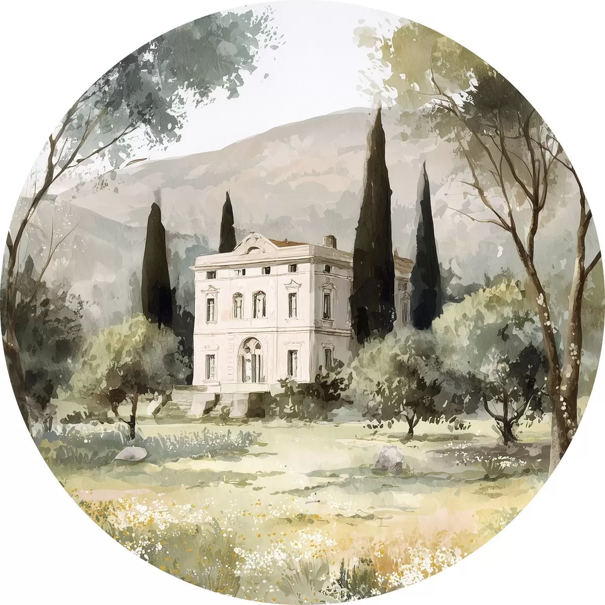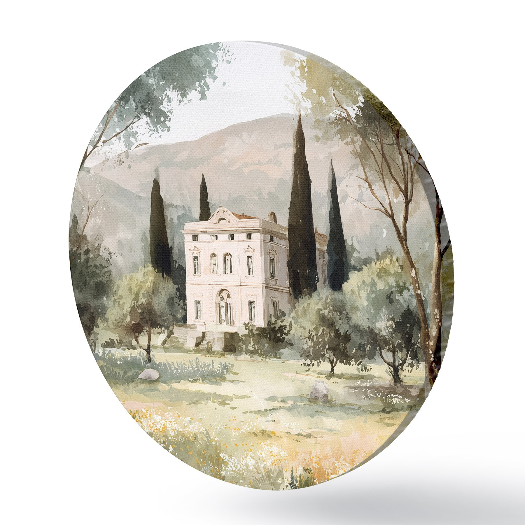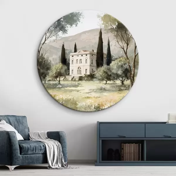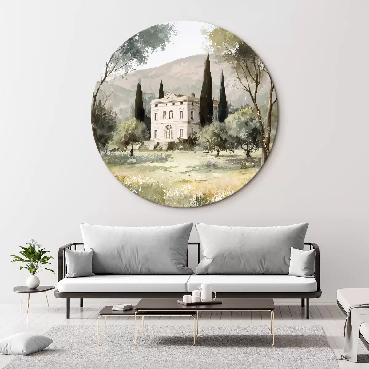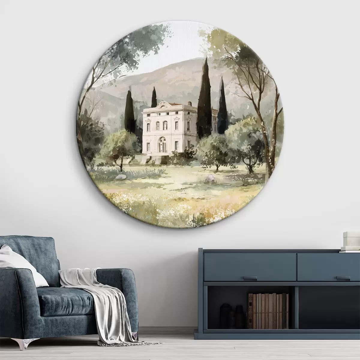 Apaļas gleznas Vidusjūras ciemats ar baltu māju dārza ielokā r44796