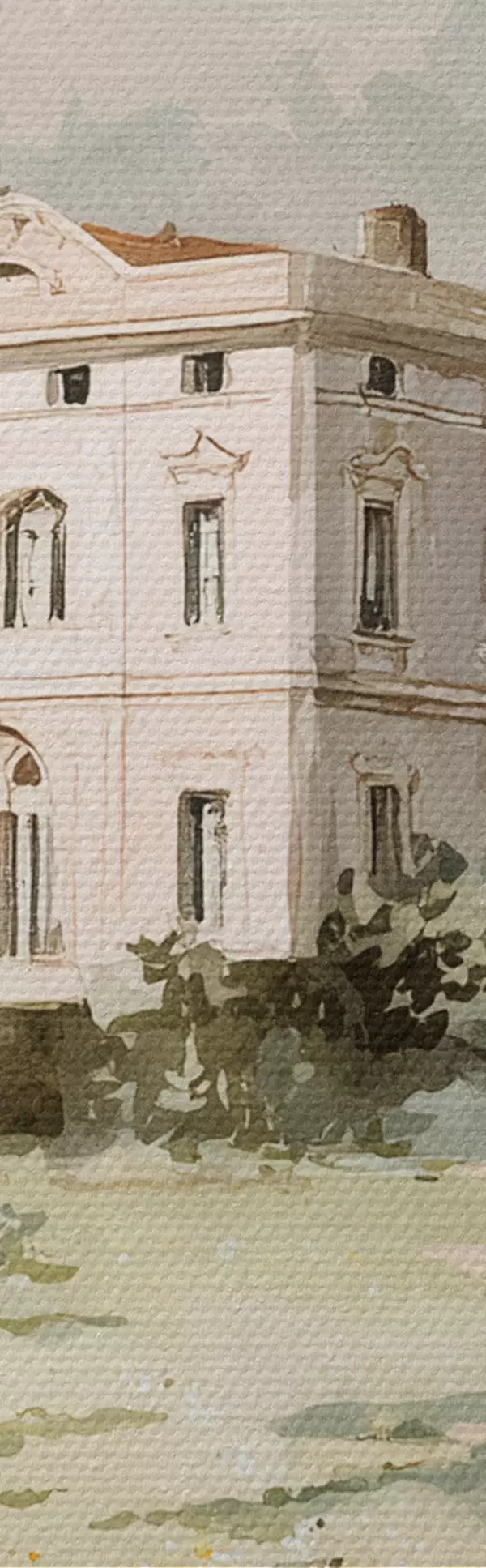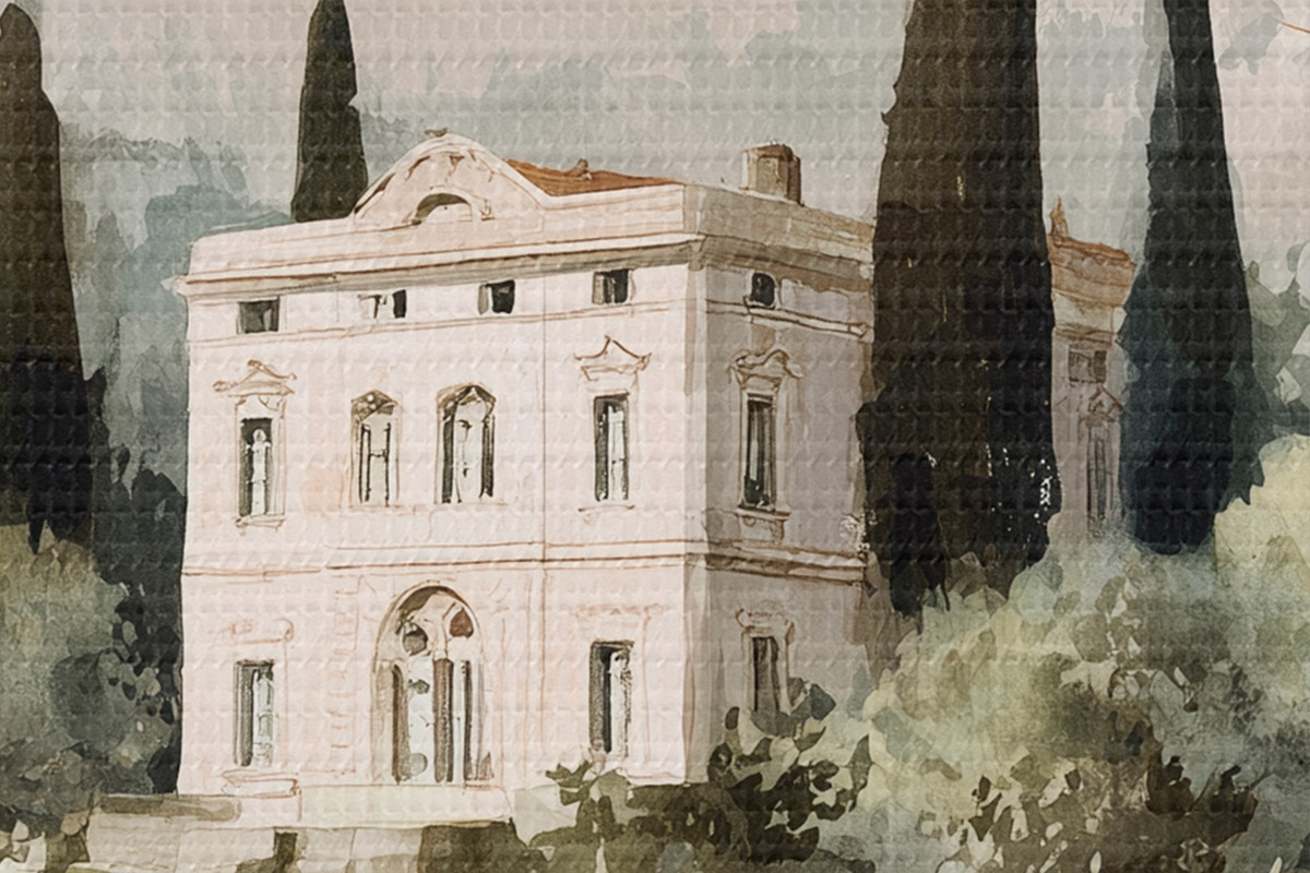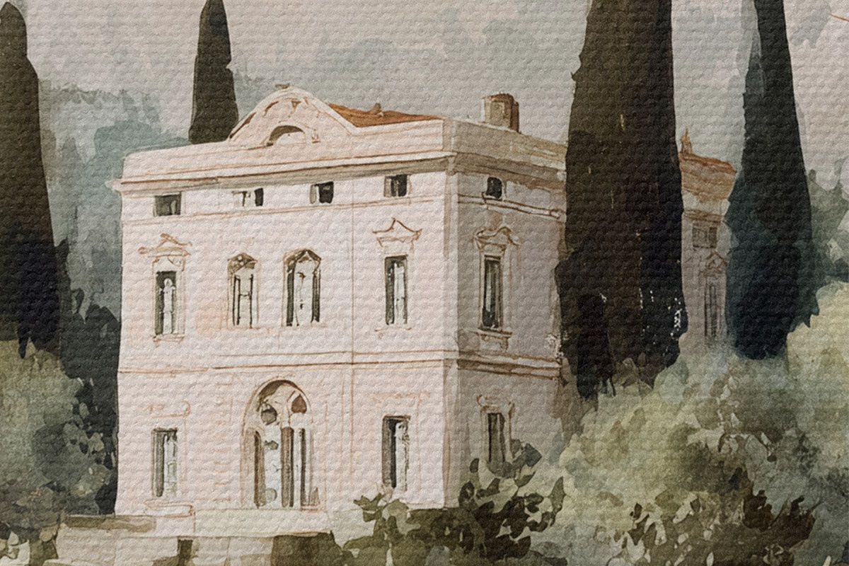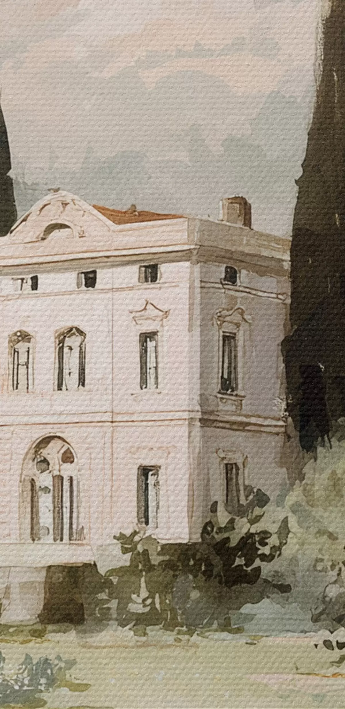 Apaļas gleznas Vidusjūras ciemats ar baltu māju dārza ielokā r44796