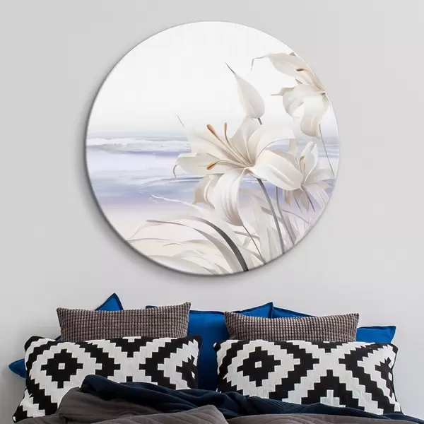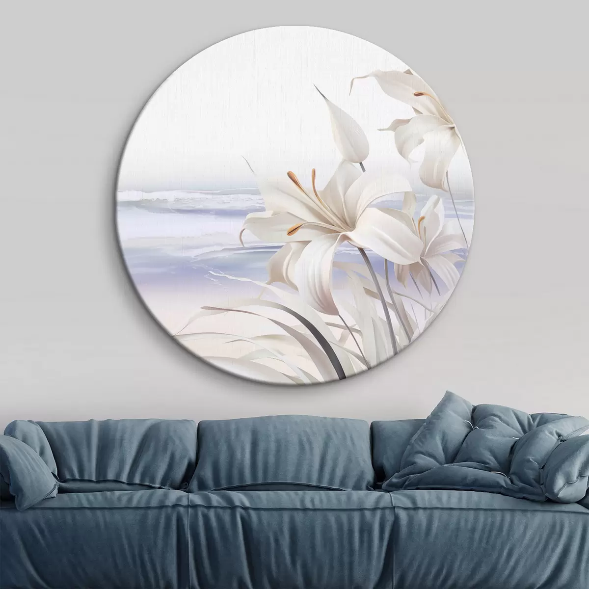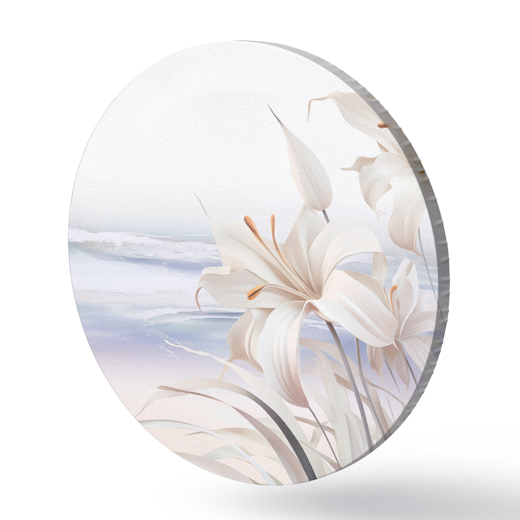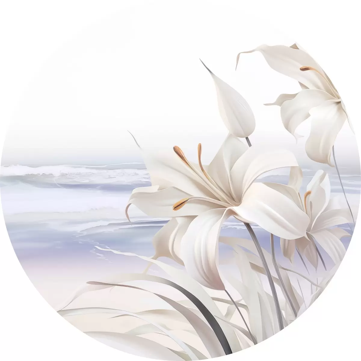 Apaļas gleznas Baltas lilijas ar oranžiem augļlapiņām un garām lapām pludmalē ar mīkstiem viļņiem fonā, pasteļtoņos r44850