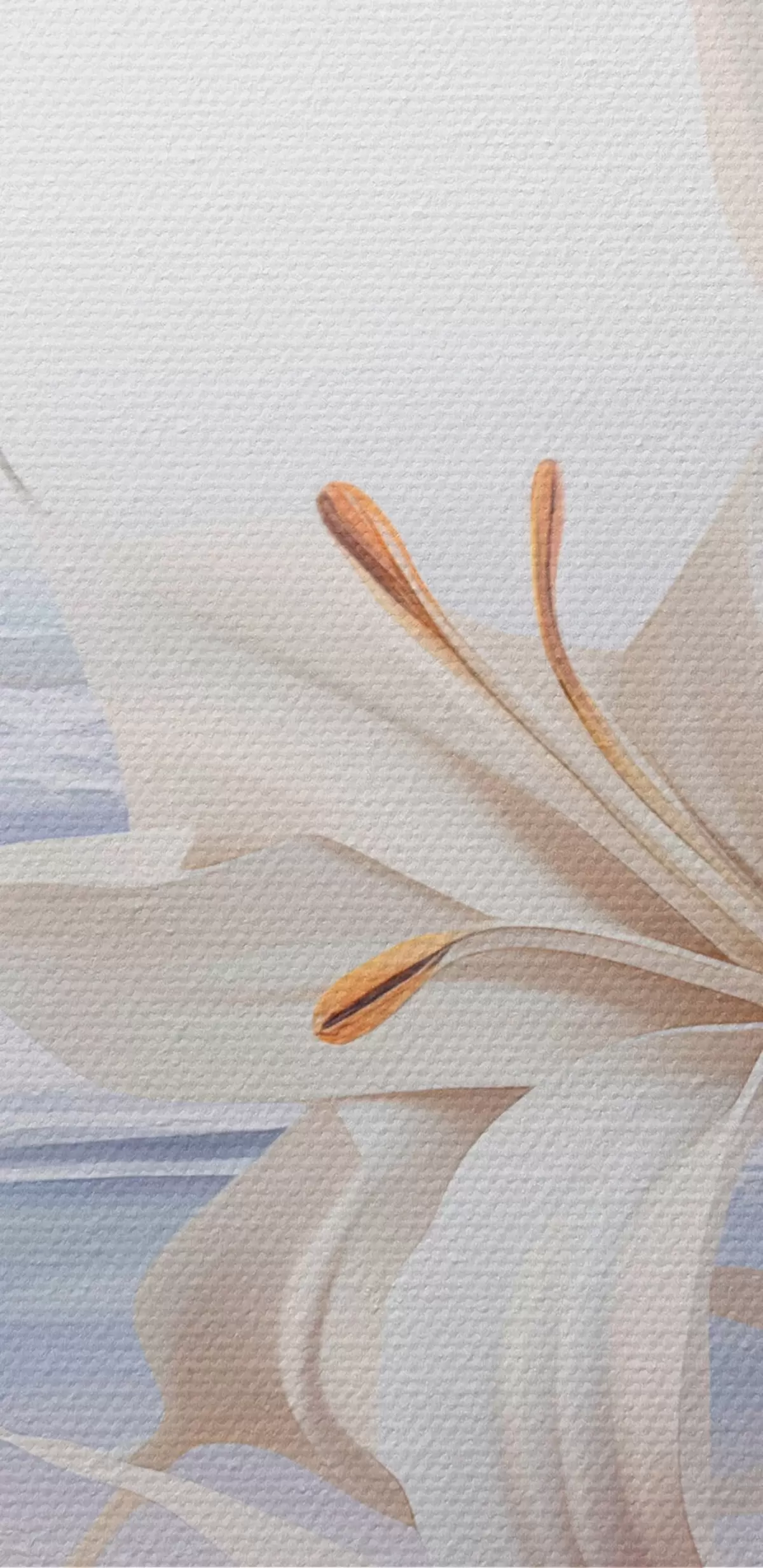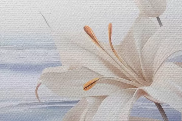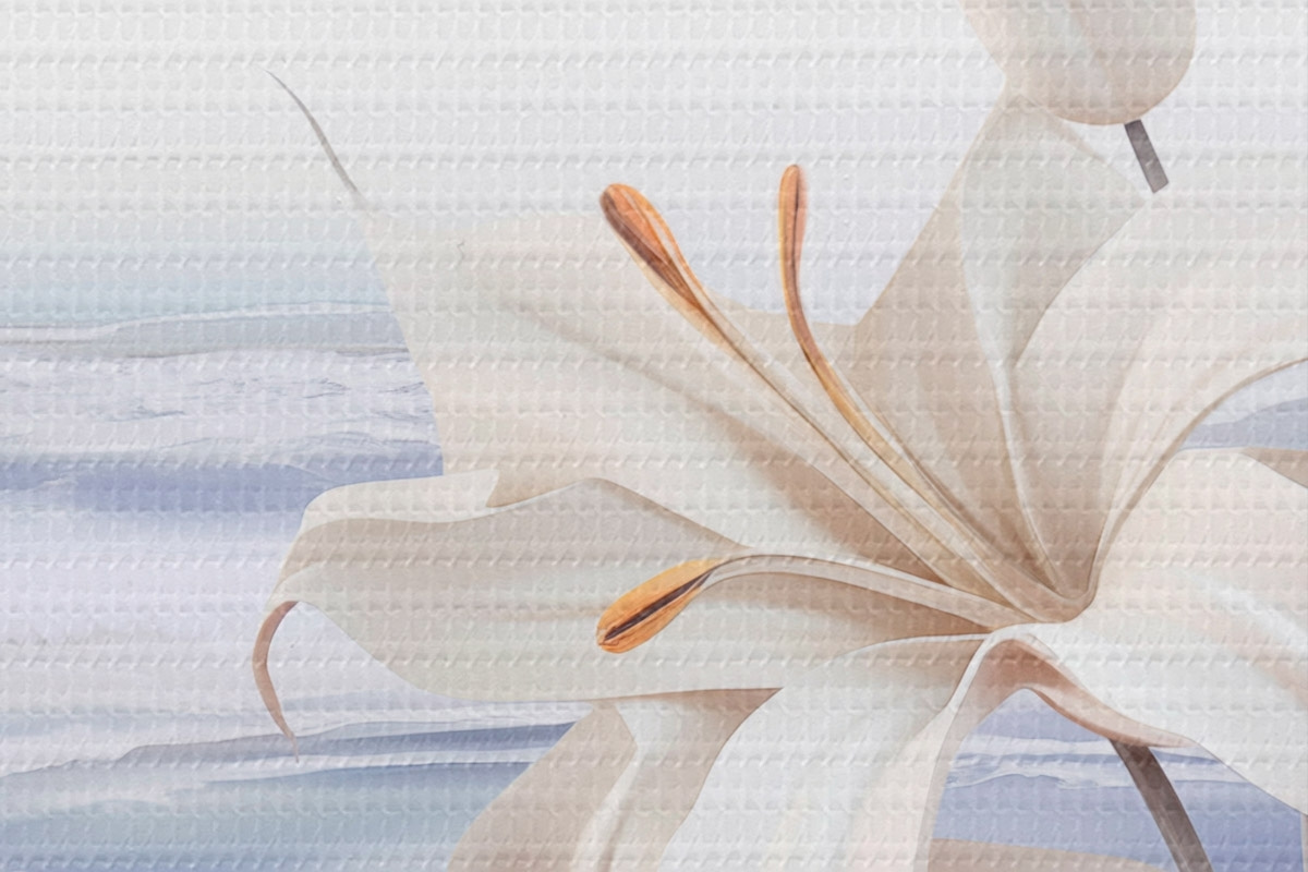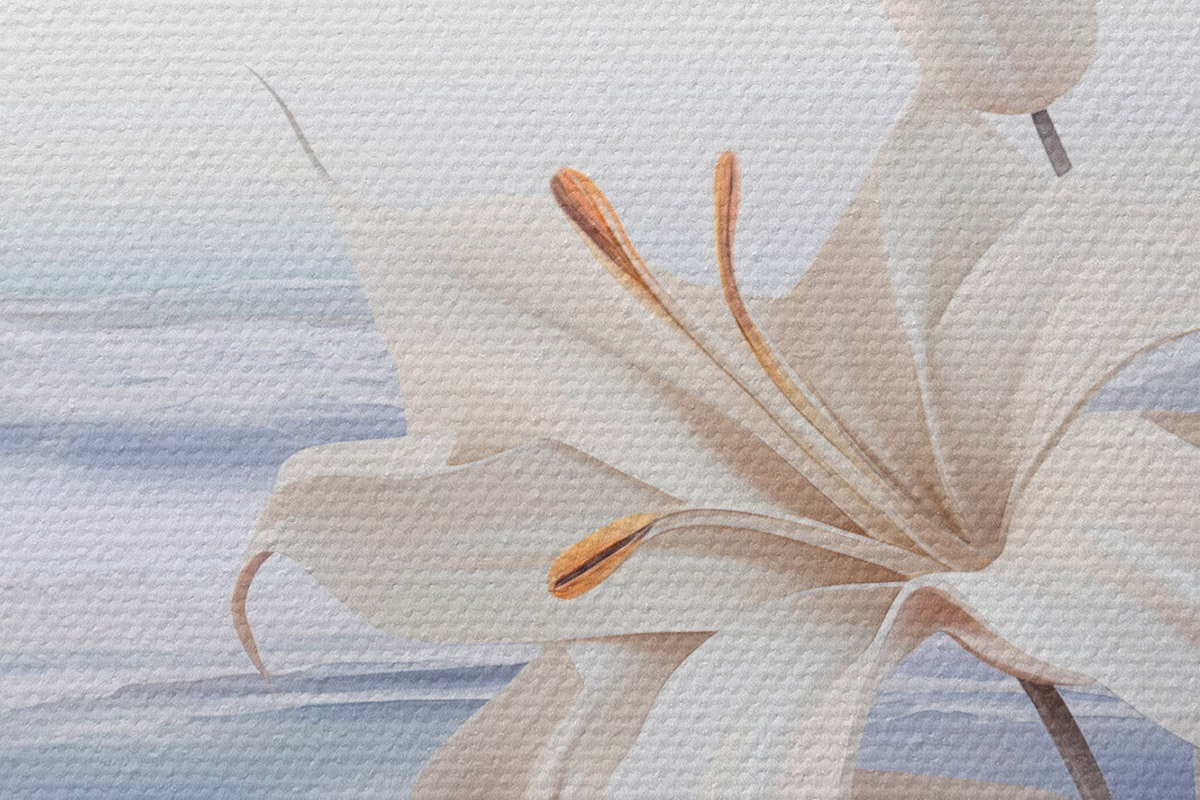 Attēls Baltas lilijas ar oranžiem augļlapiņām un garām lapām pludmalē ar mīkstiem viļņiem fonā, pasteļtoņos Nr r44850