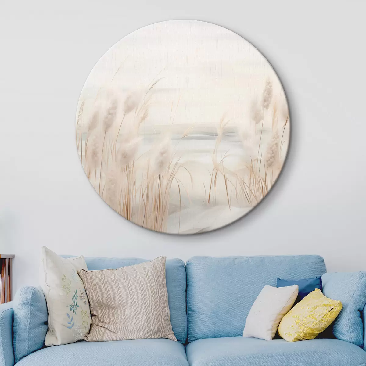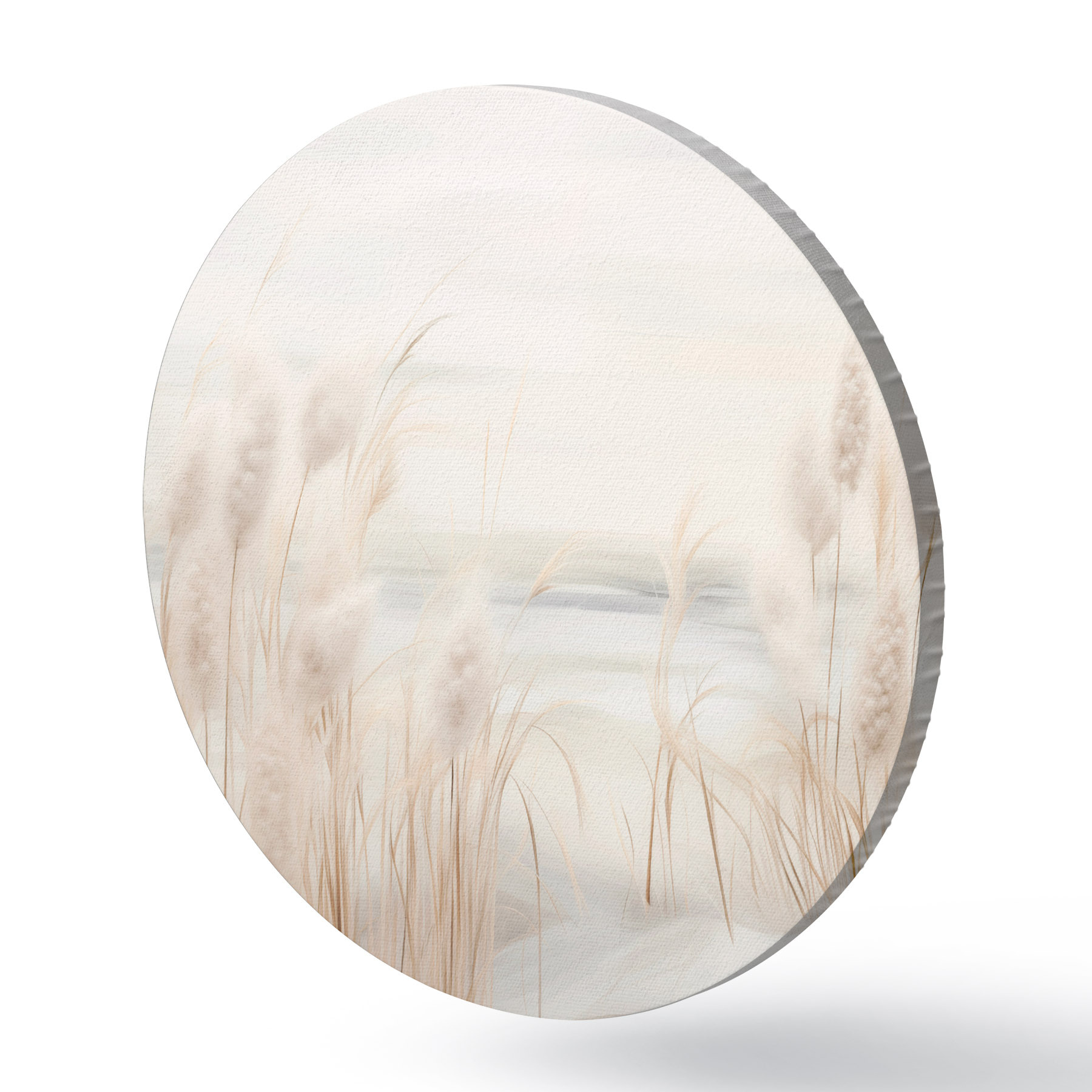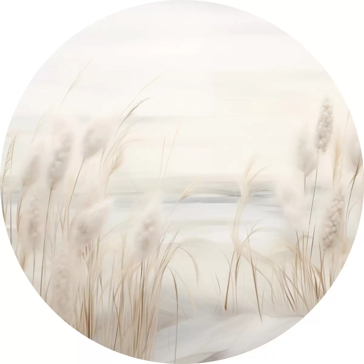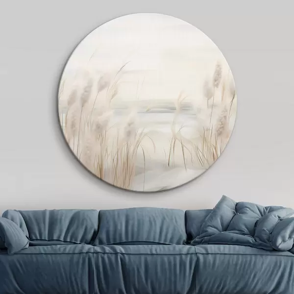 Apaļas gleznas Priekšplānā smilškrāsas niedres ar sēklu galviņām, mīkstas un maigas, neskaidrs fons un gaišas debesis r44851