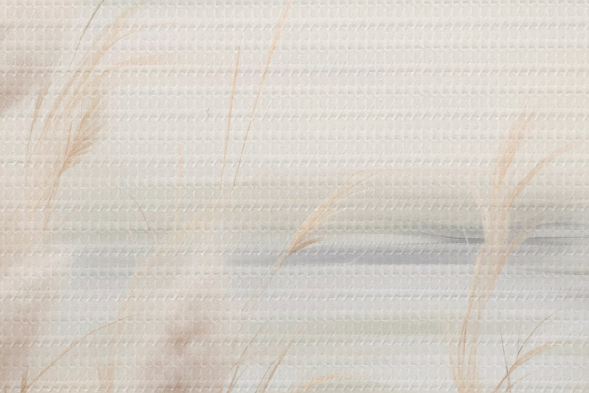 Attēls Priekšplānā smilškrāsas niedres ar sēklu galviņām, mīkstas un maigas, neskaidrs fons un gaišas debesis Nr r44851