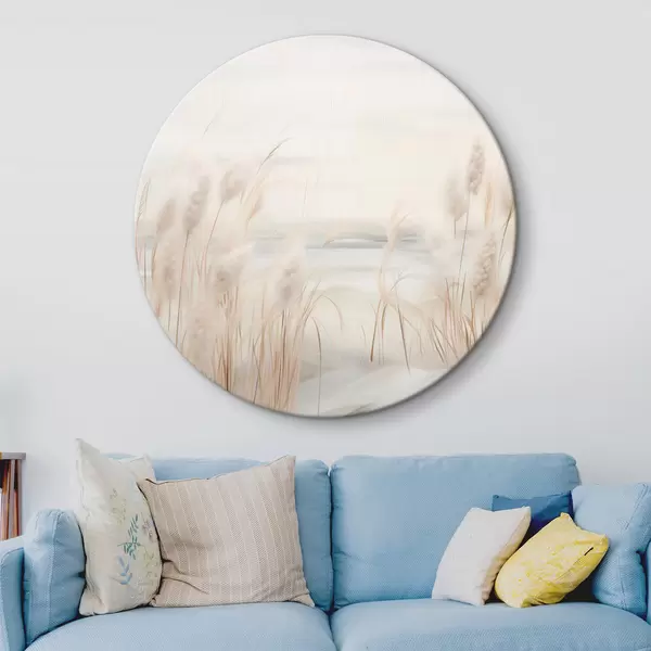 Apaļas gleznas Priekšplānā smilškrāsas niedres ar sēklu galviņām, mīkstas un maigas, neskaidrs fons un gaišas debesis r44851