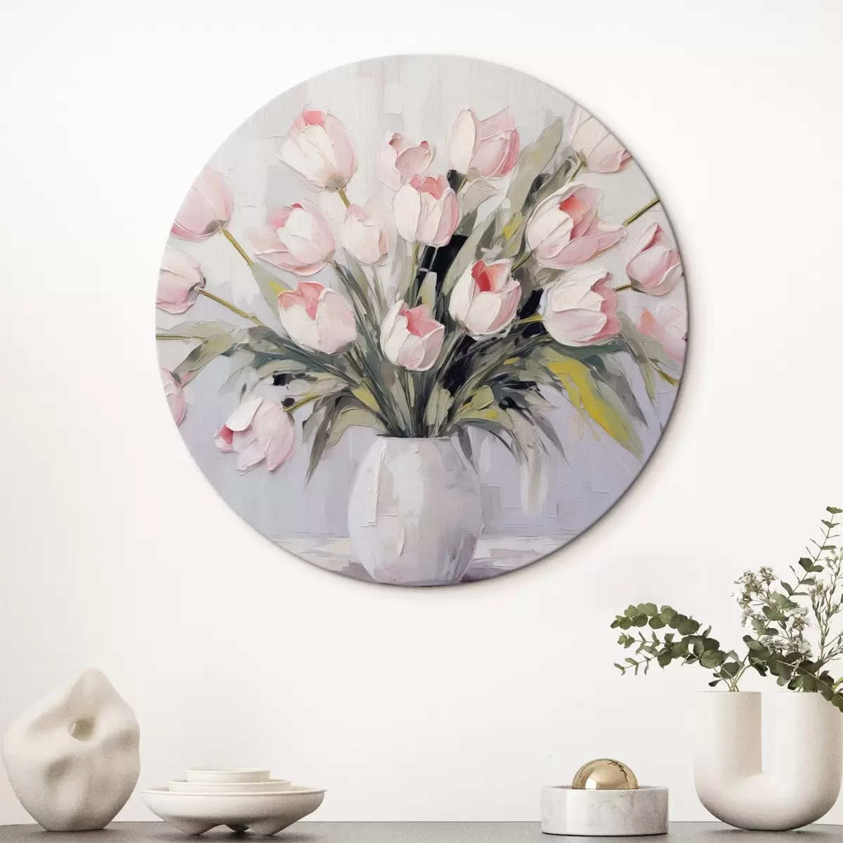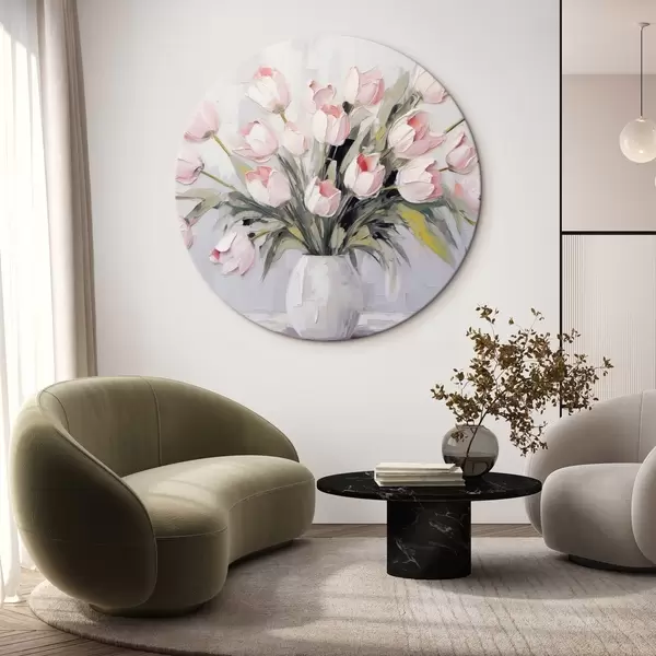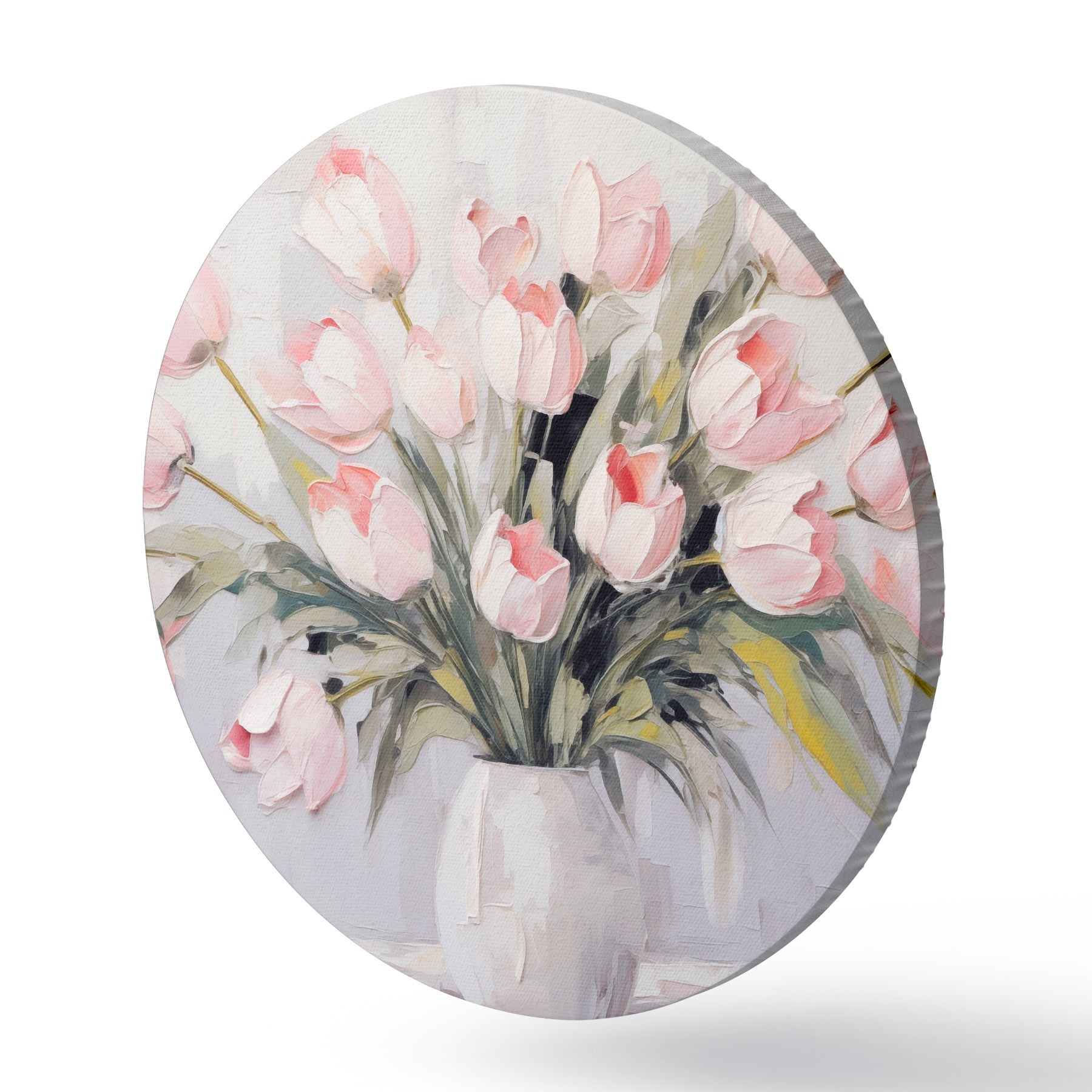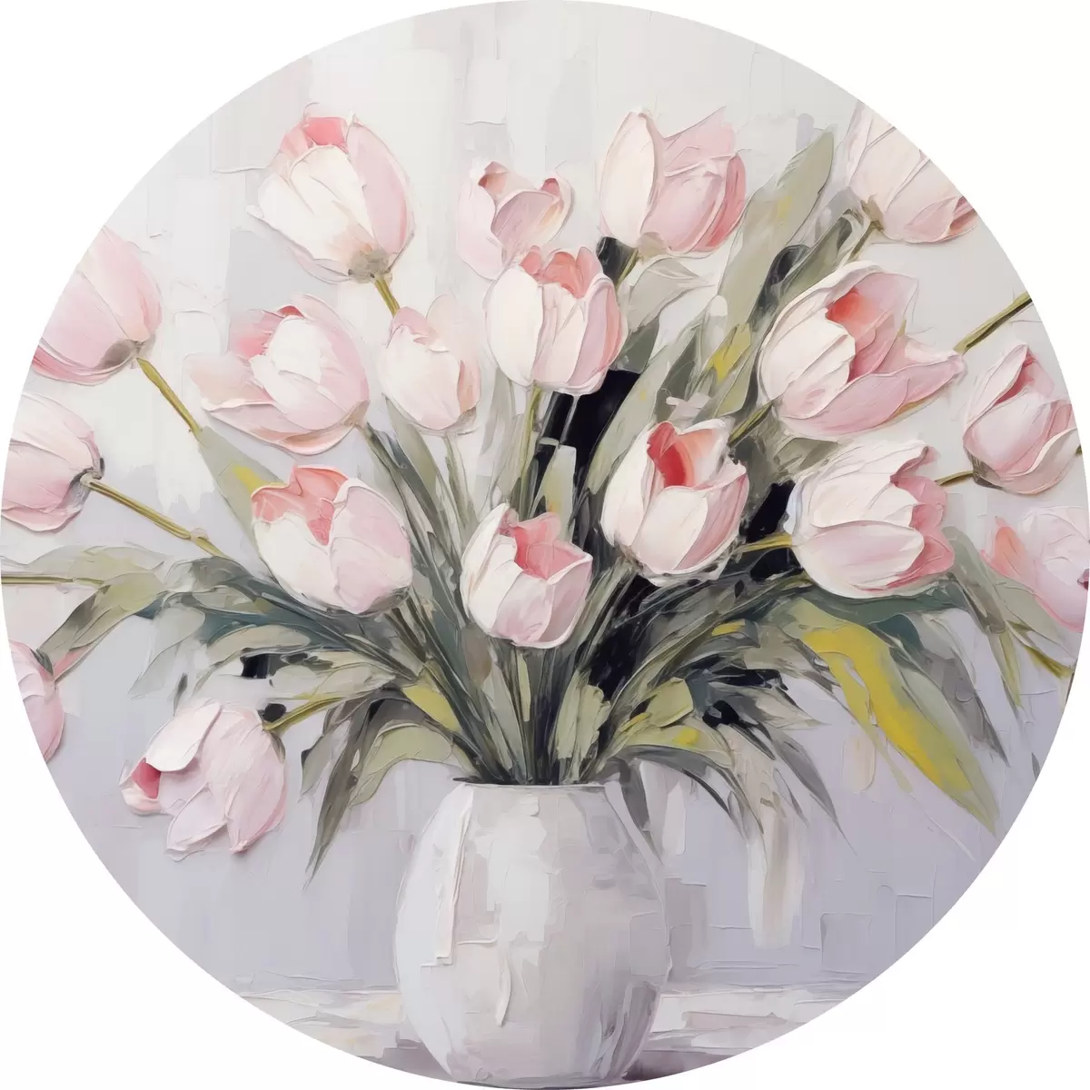 Apaļas gleznas Vāze ar rozā tulpēm, zaļas lapas, gaiši pelēks fons , eļļas glezna, biezi triepieni ar otu r44852