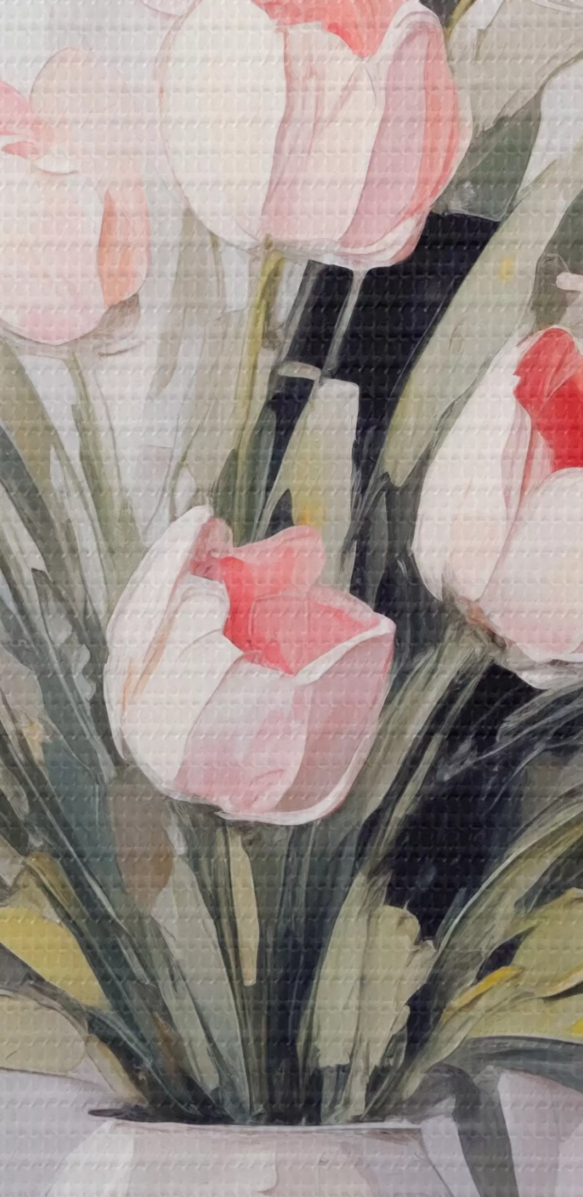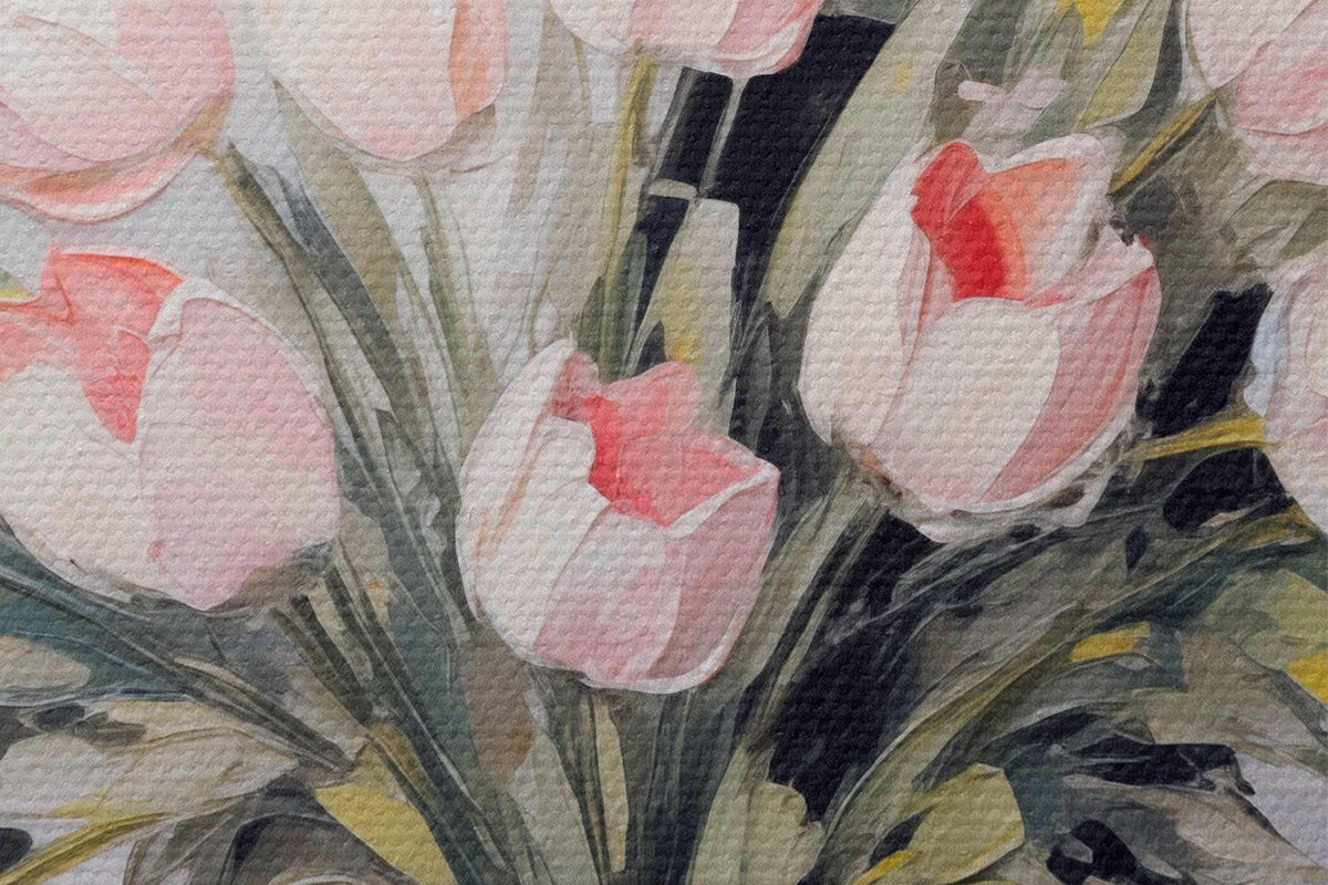 Attēls Vāze ar rozā tulpēm, zaļas lapas, gaiši pelēks fons , eļļas glezna, biezi triepieni ar otu Nr r44852