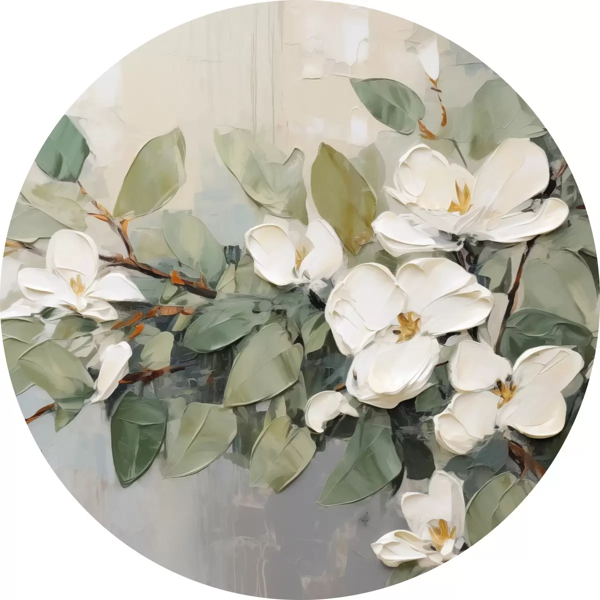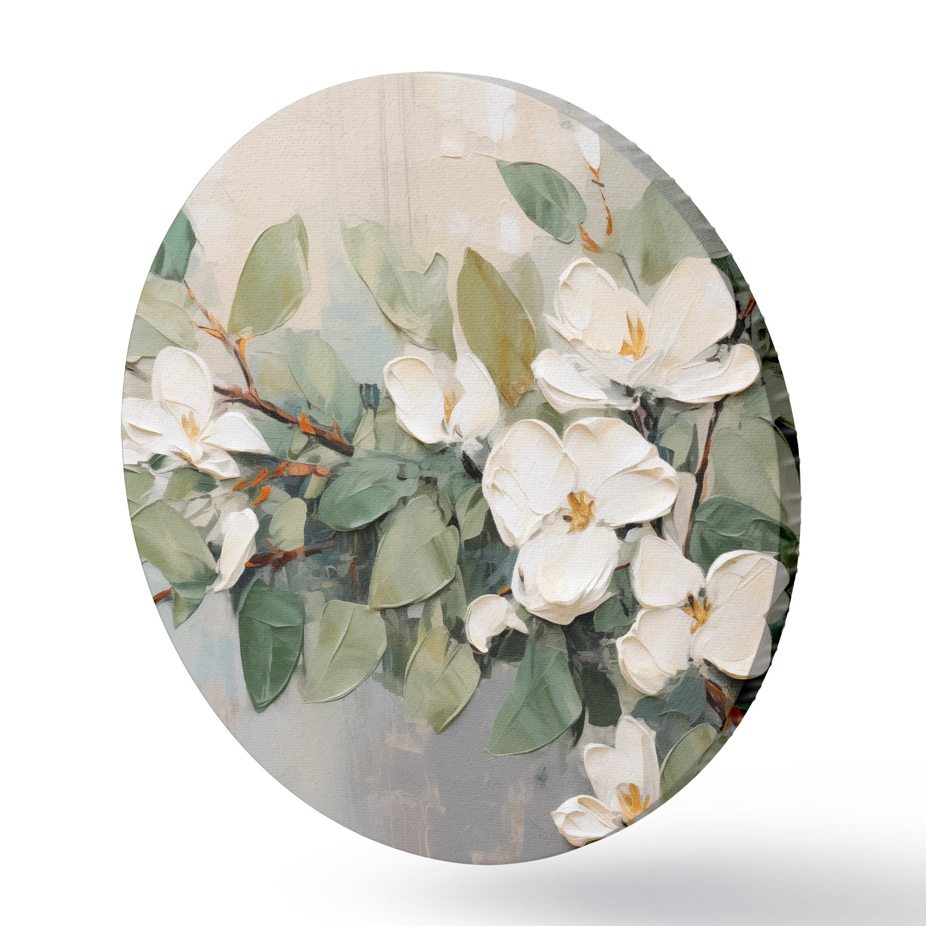 Apaļas gleznas Magnolijas ziedi ar zaļām lapām uz zara, impasto tekstūras stils, maiga krāsu palete r44853