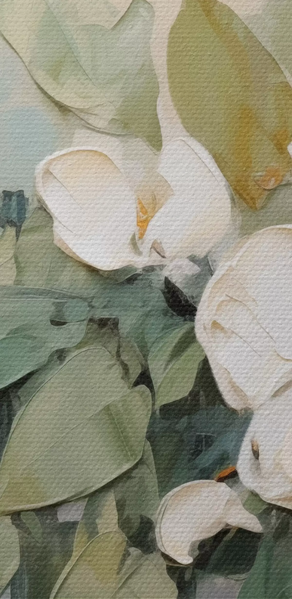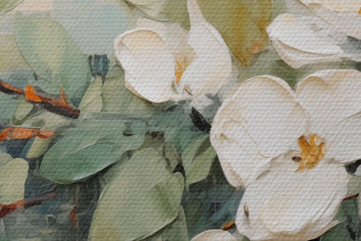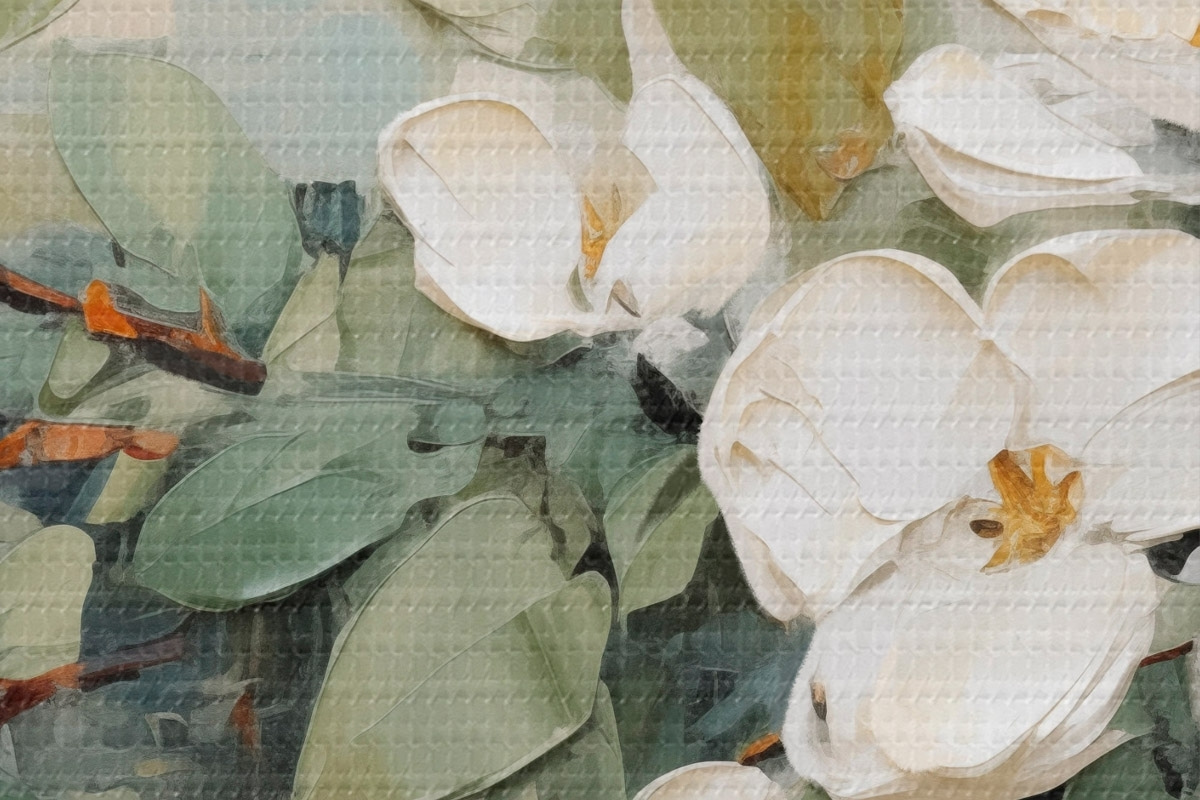 Attēls Magnolijas ziedi ar zaļām lapām uz zara, impasto tekstūras stils, maiga krāsu palete Nr r44853