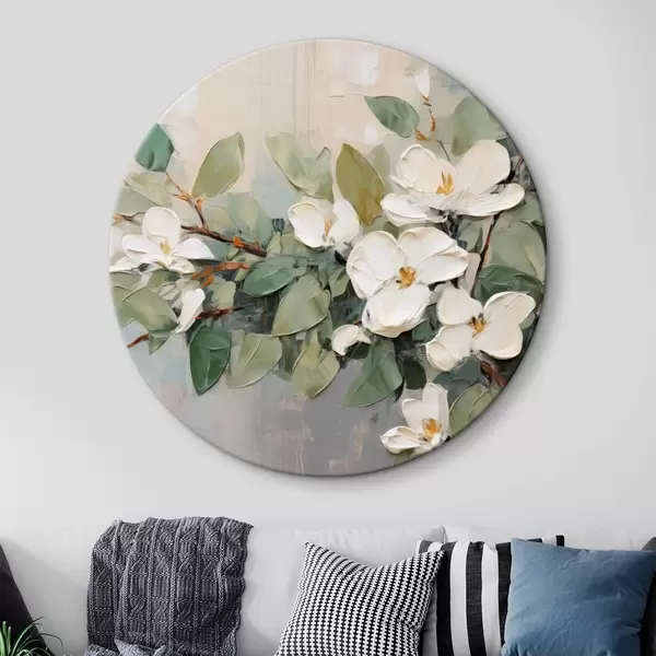 Apaļas gleznas Magnolijas ziedi ar zaļām lapām uz zara, impasto tekstūras stils, maiga krāsu palete r44853