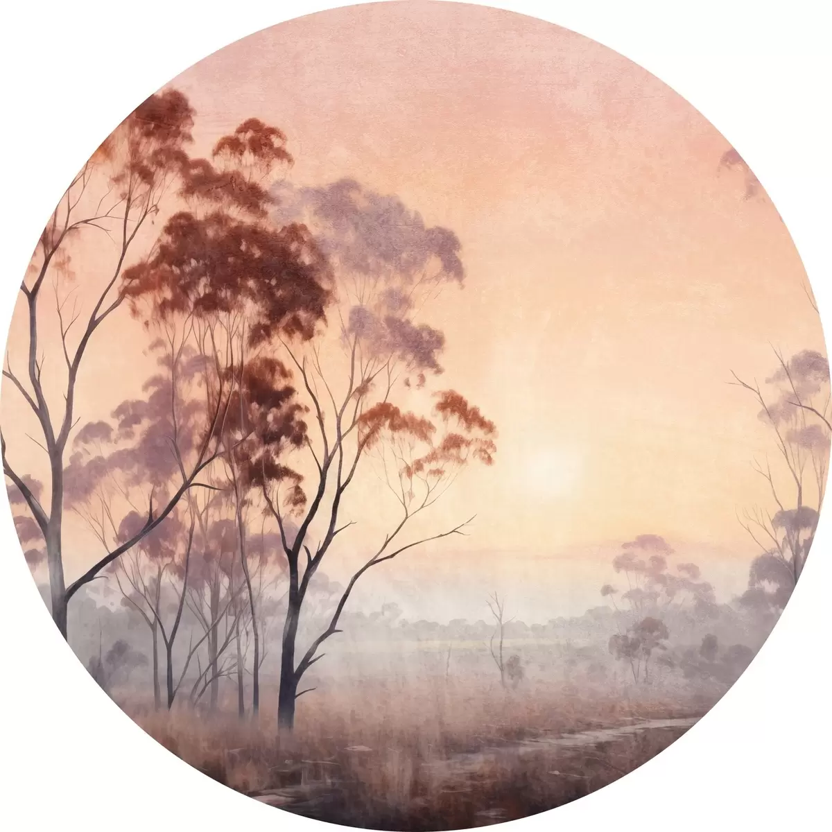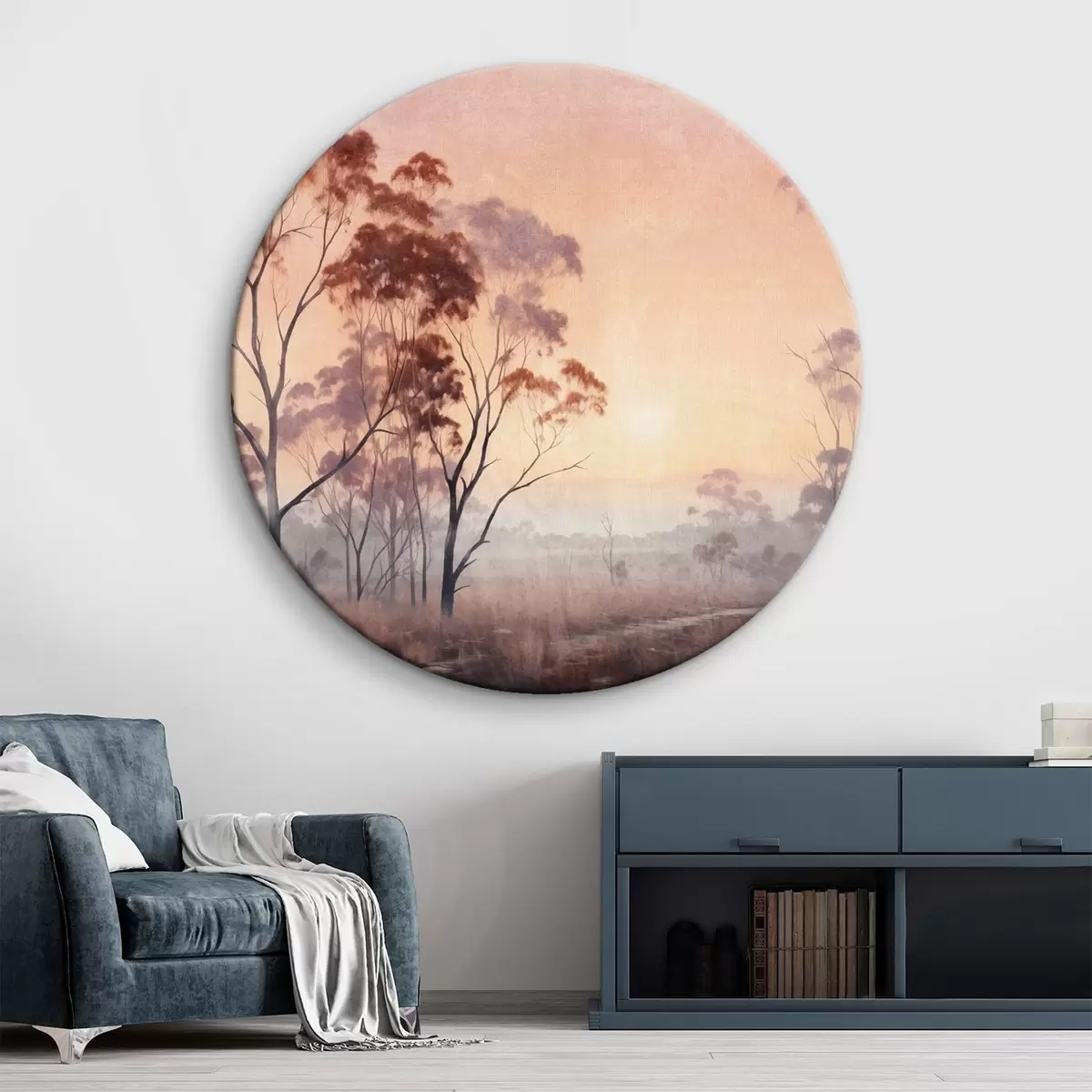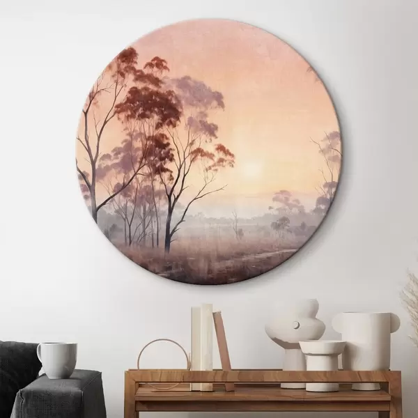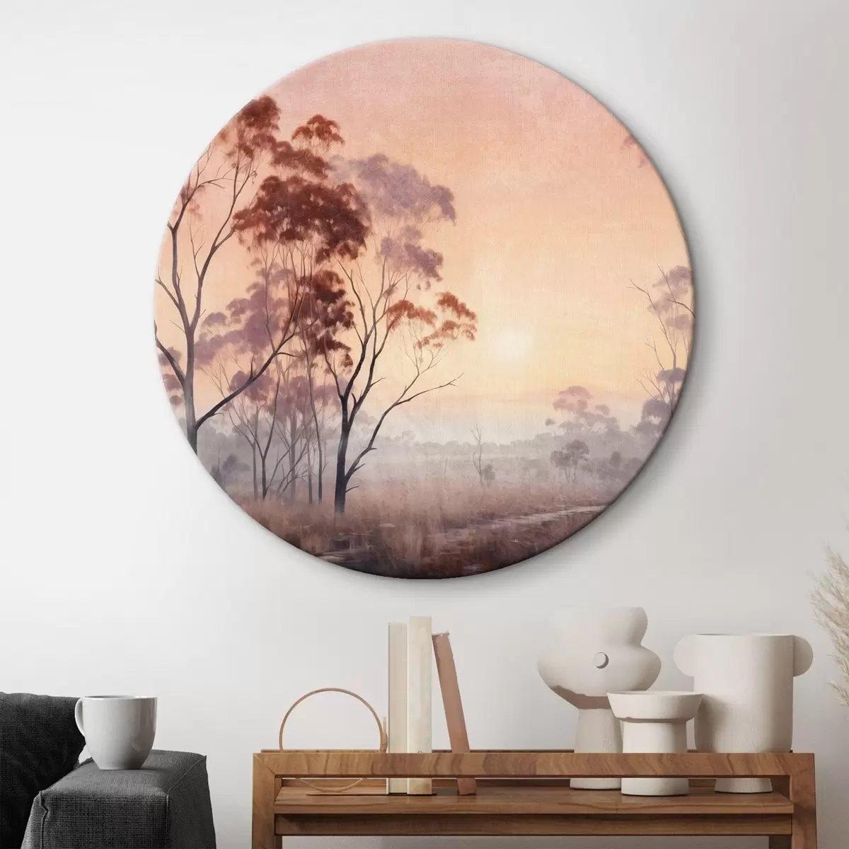Apaļas gleznas Ainavu glezna, kurā attēlots lauks ar augstu zāli un kokiem, fonā redzama saule r44854