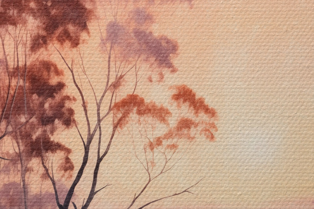 Attēls Ainavu glezna, kurā attēlots lauks ar augstu zāli un kokiem, fonā redzama saule Nr r44854
