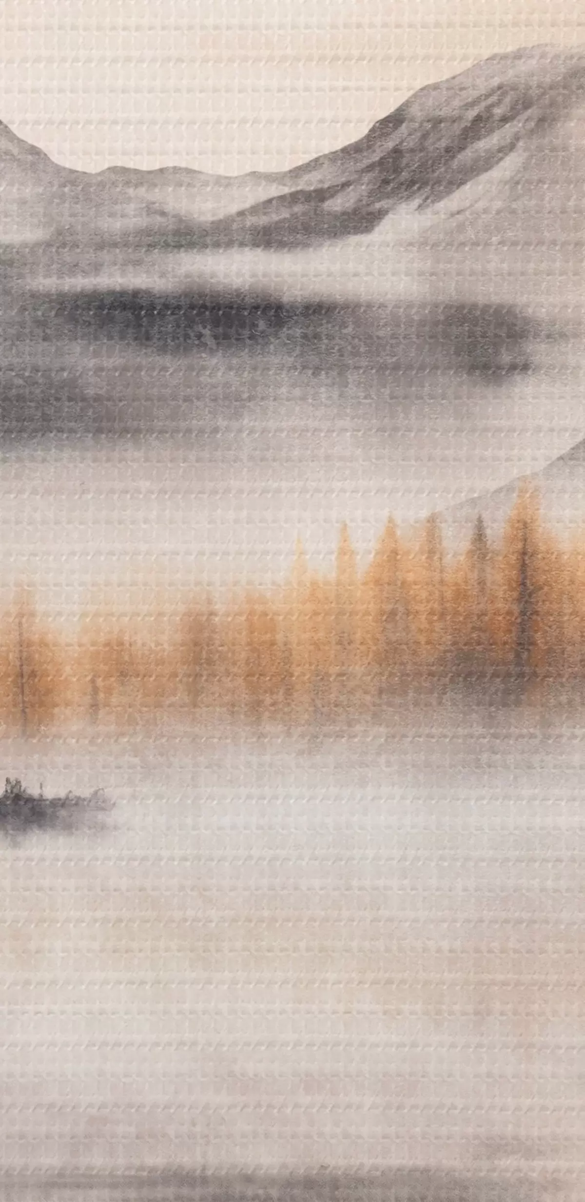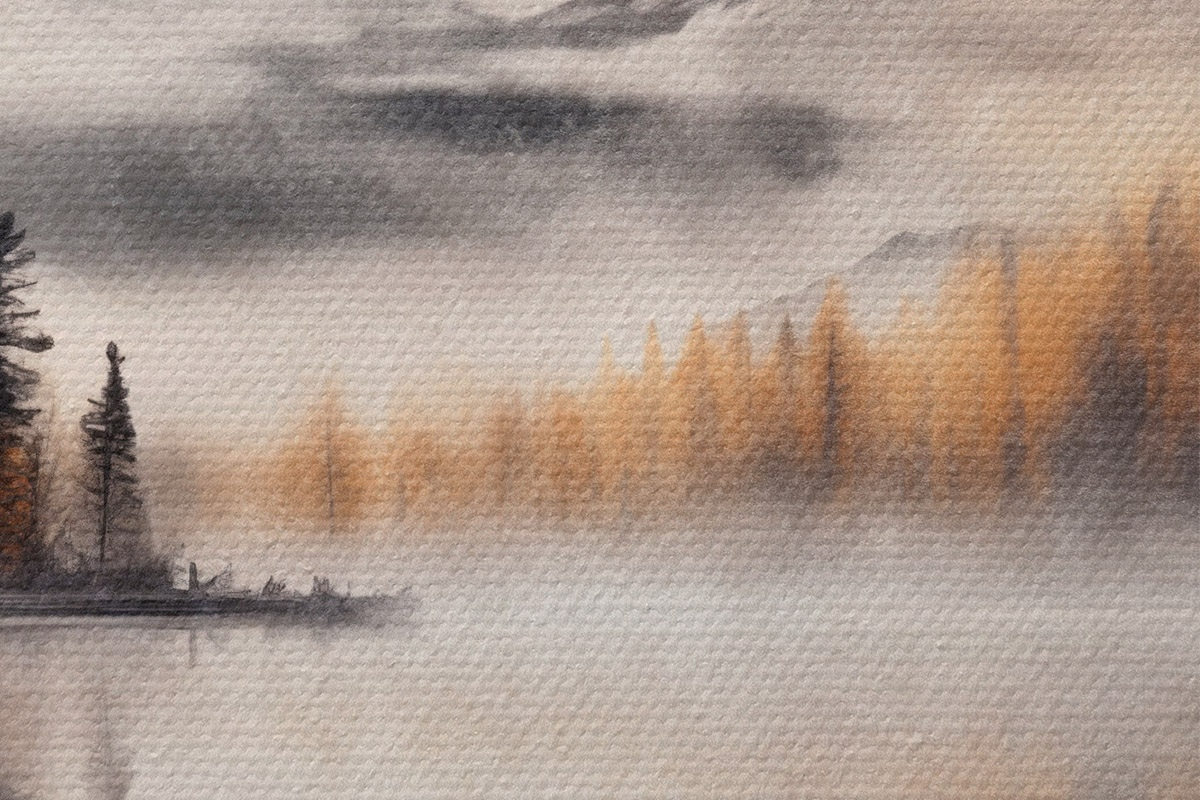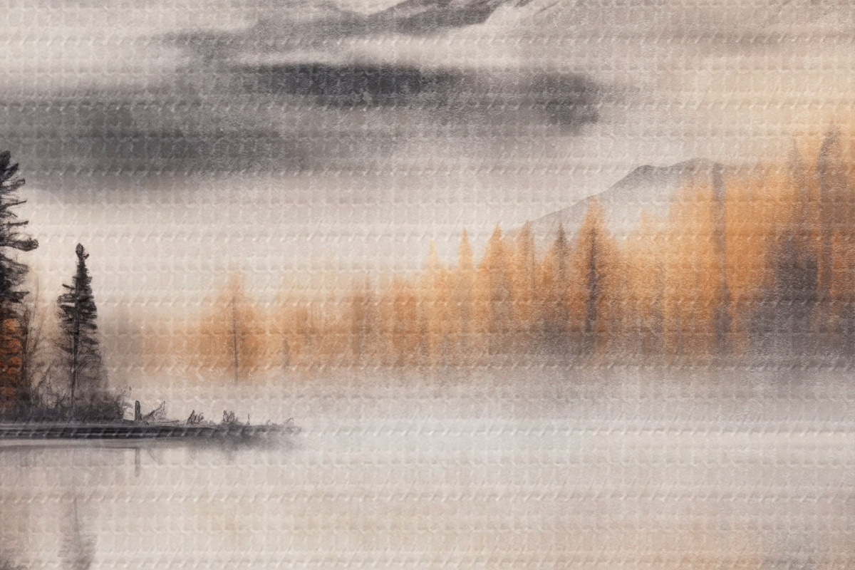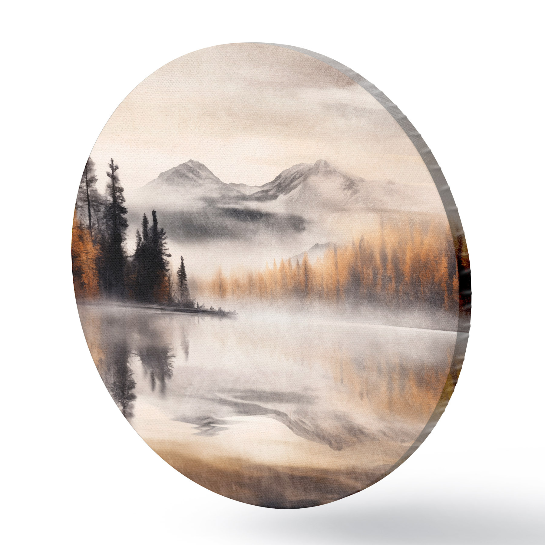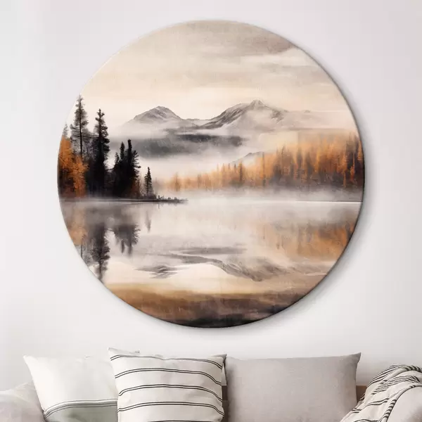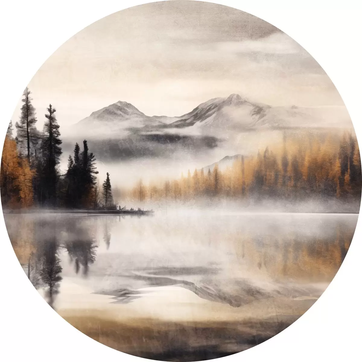 Apaļas gleznas Miglaina ezera ainava ar priežu kokiem un kalniem, mākoņaini pelēkas debesis r44856