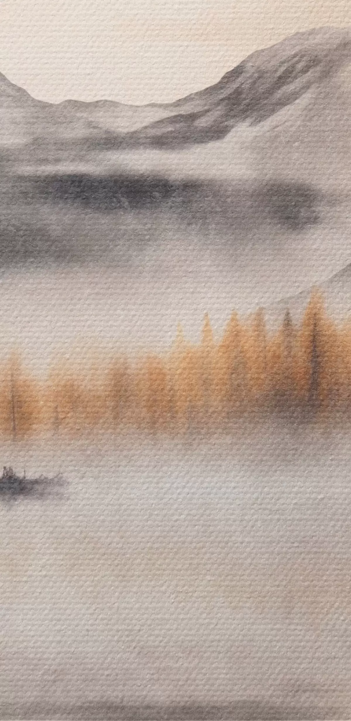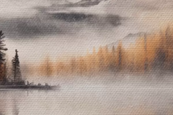 Attēls Miglaina ezera ainava ar priežu kokiem un kalniem, mākoņaini pelēkas debesis Nr r44856