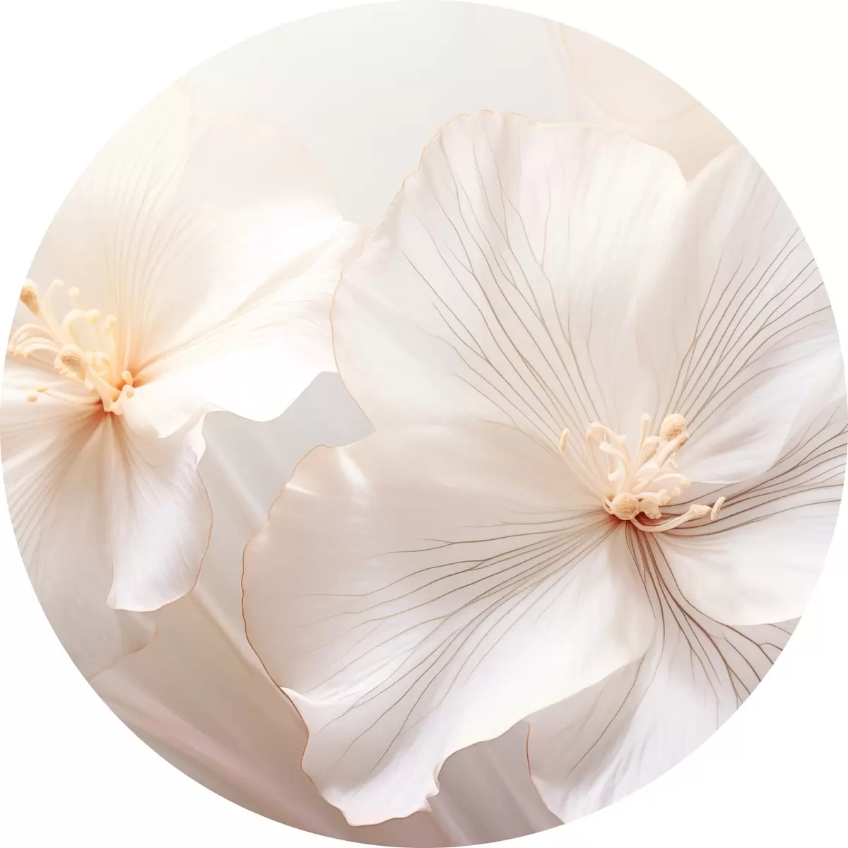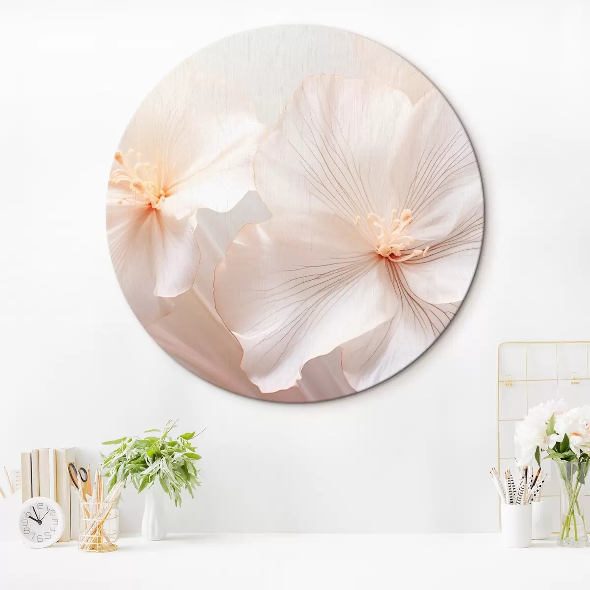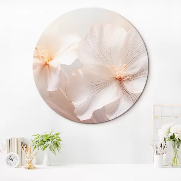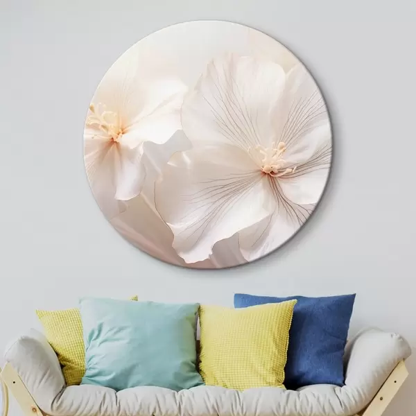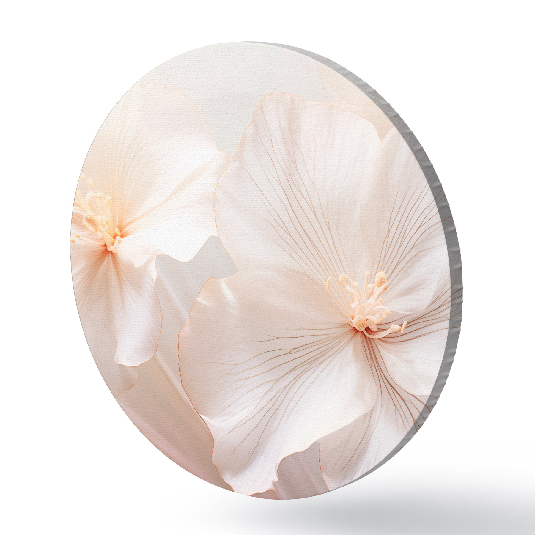 Apaļas gleznas Smalki balti ziedi ar ziedlapiņām un maigiem, pasteļkrāsu centriem, kas rada sapņainu un ēterisku ziedu mākslu r44858