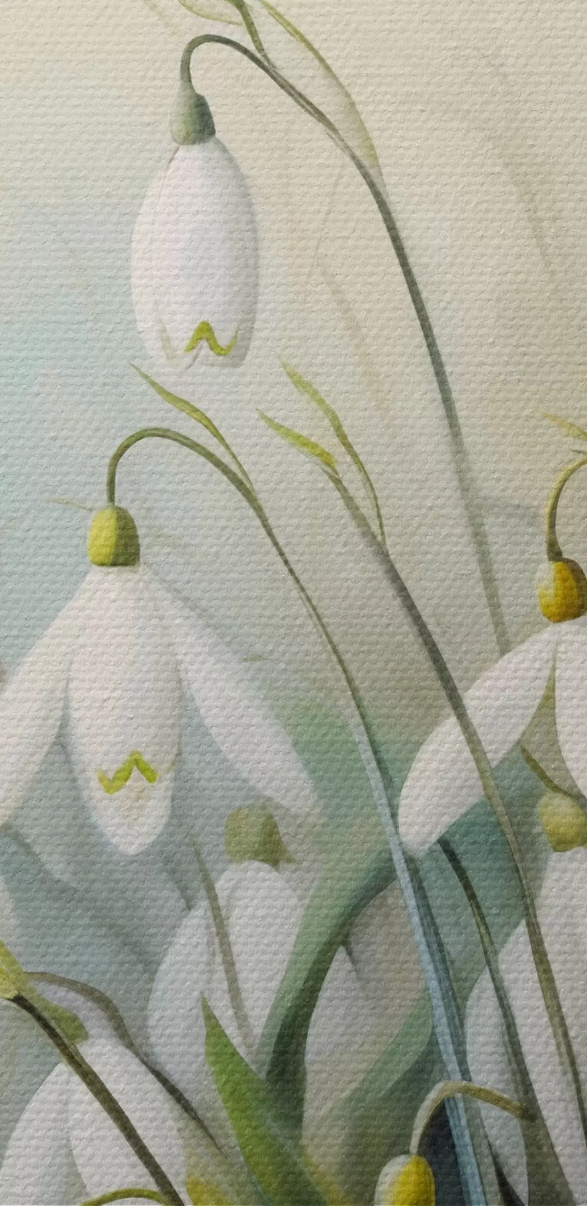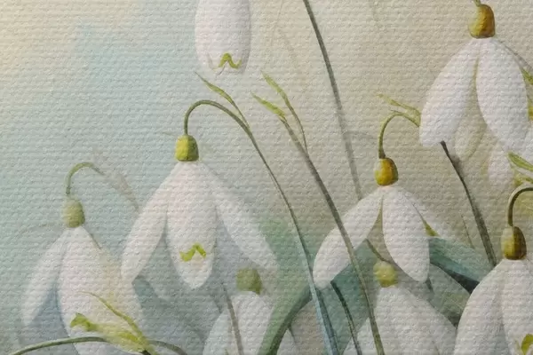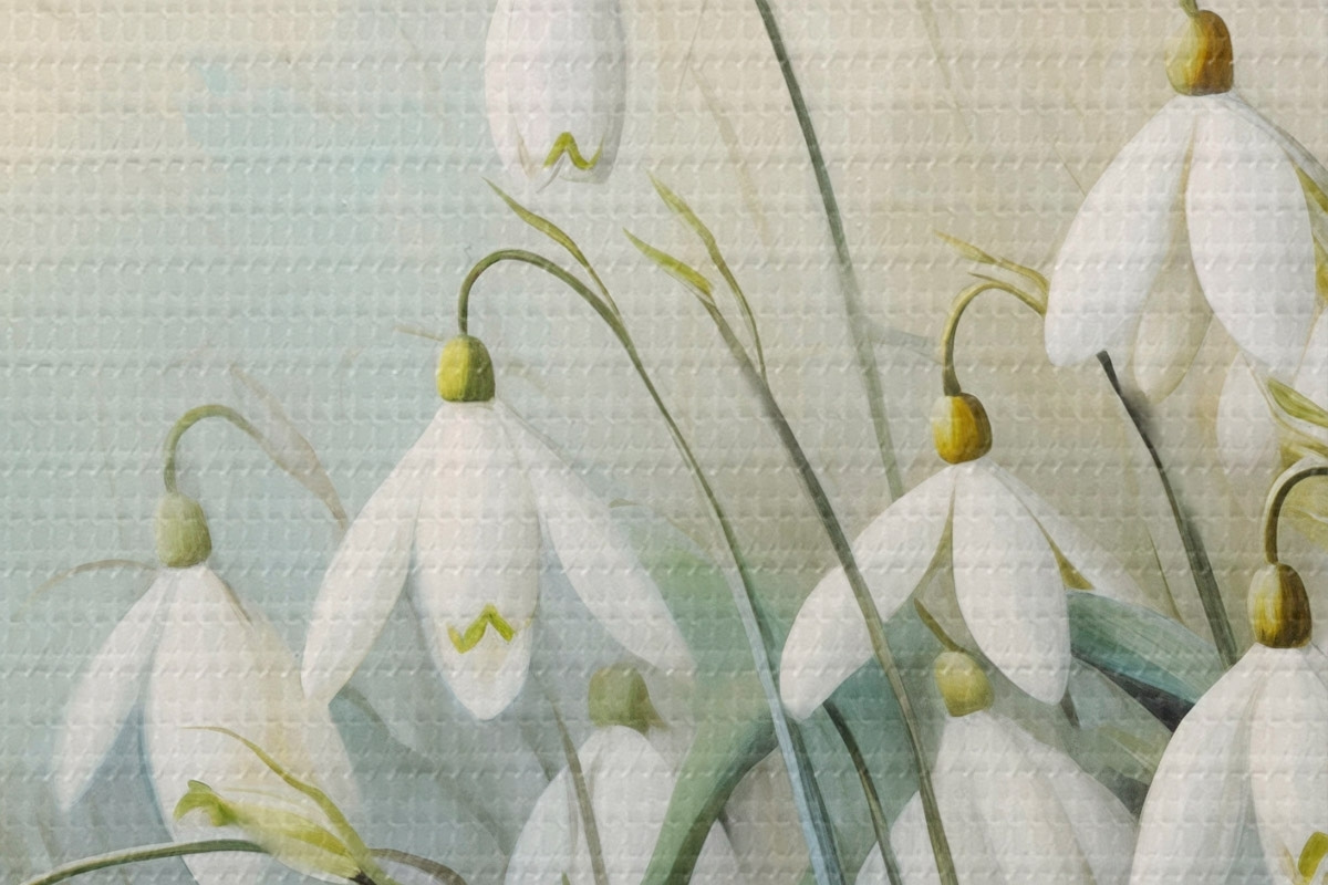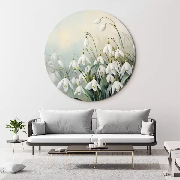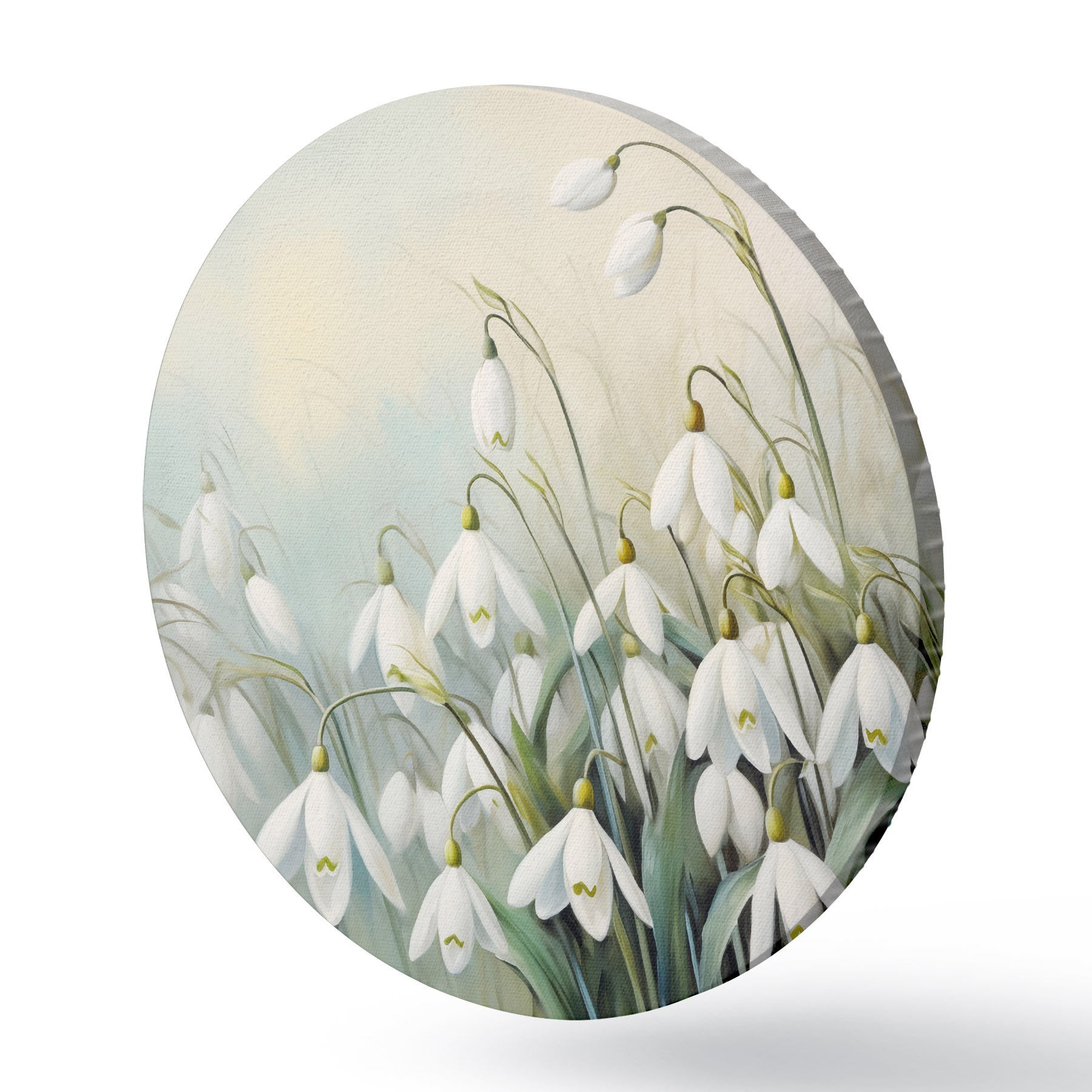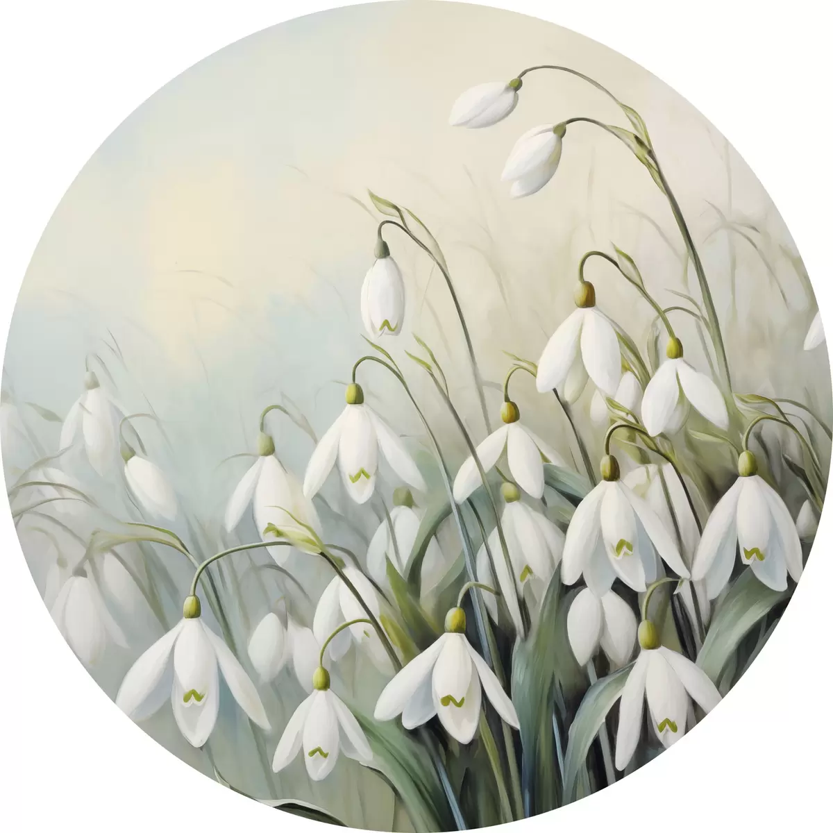 Apaļas gleznas Balti sniegpulkstenīšu ziedi ar ziliem un zaļiem kātiņiem un lapām, maigi triepieni, neskaidrs fons r44864