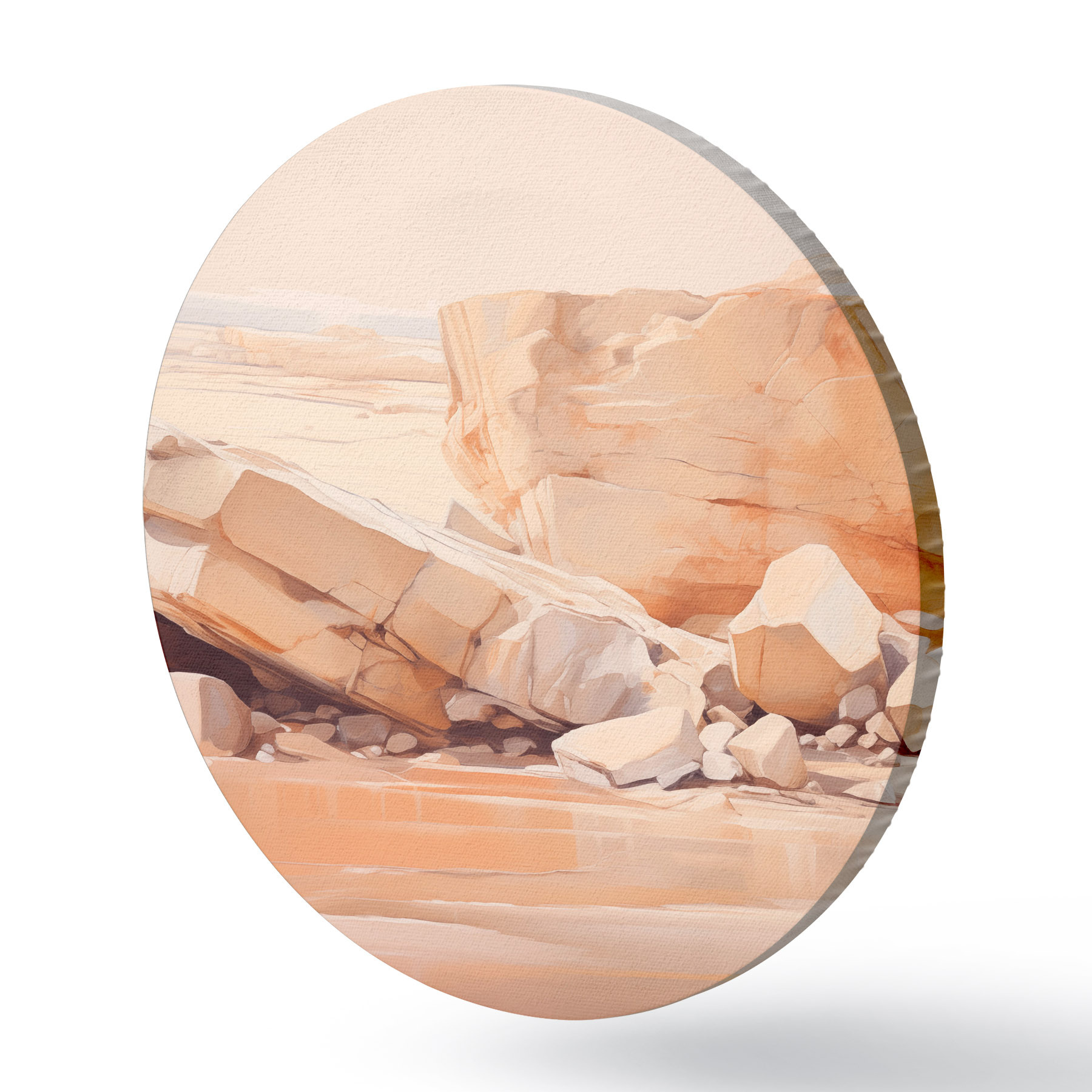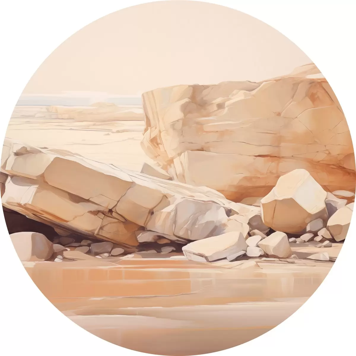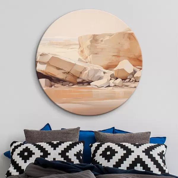 Apaļas gleznas Minimālistiska akmeņaina pludmales ainava ar lieliem gaiši brūniem laukakmeņiem un dzidru ūdeni r44865