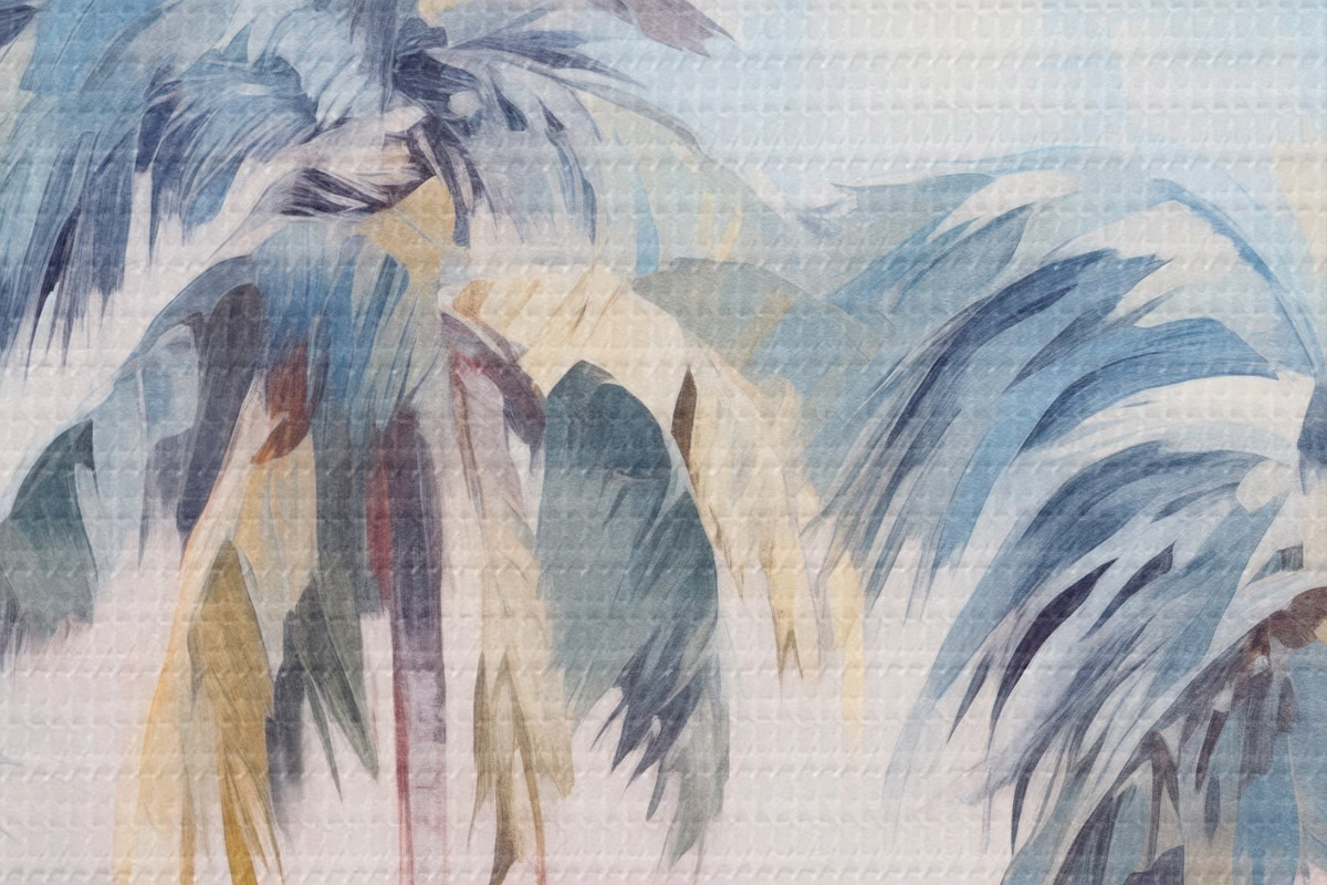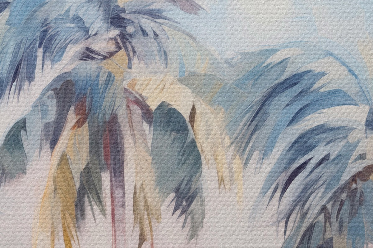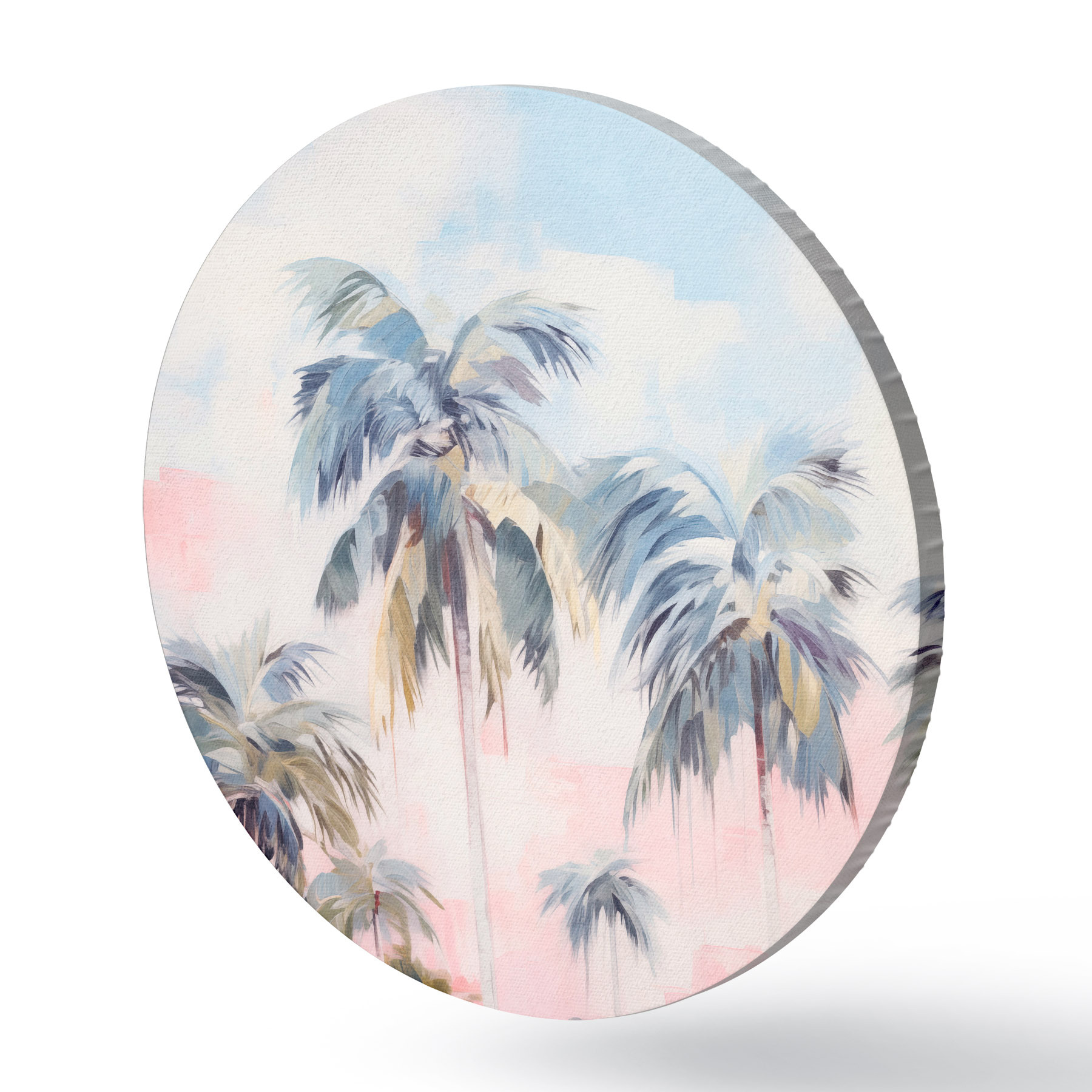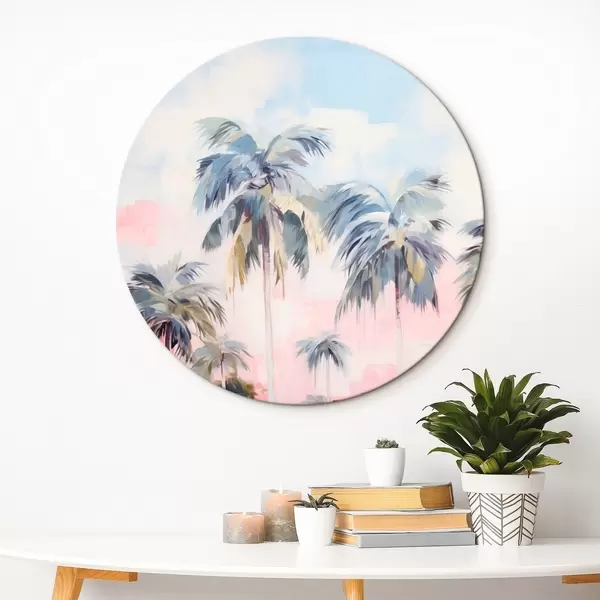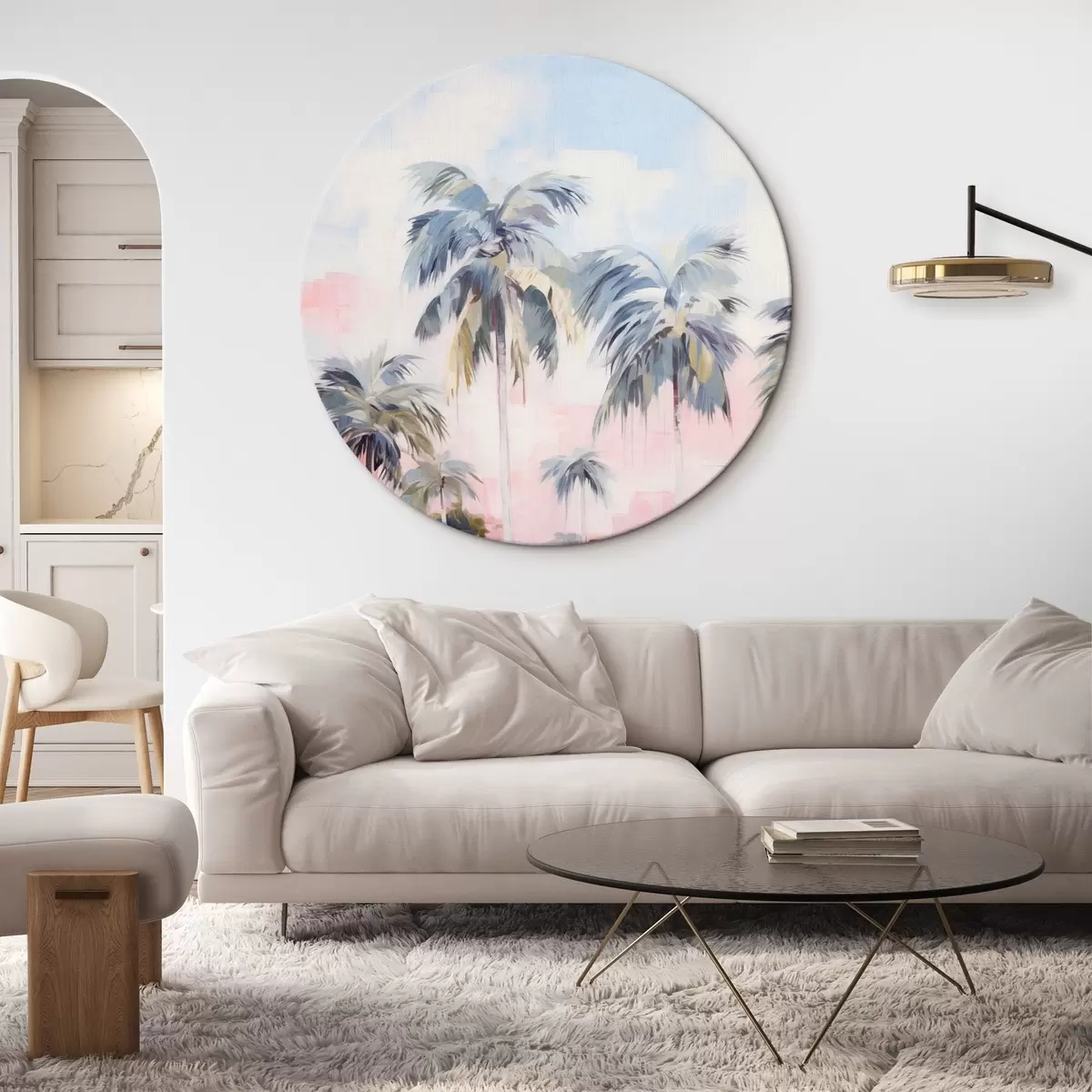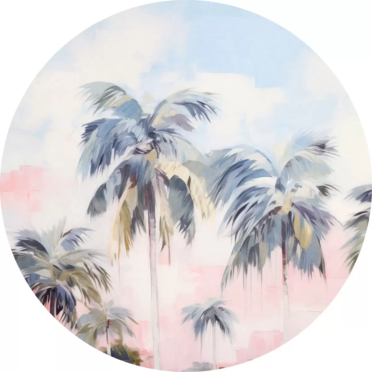 Apaļas gleznas Palmas ar pasteļkrāsas lapām un brūniem stumbriem, rozā un zilas debesis, tropu vide r44866