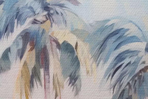 Attēls Palmas ar pasteļkrāsas lapām un brūniem stumbriem, rozā un zilas debesis, tropu vide Nr r44866