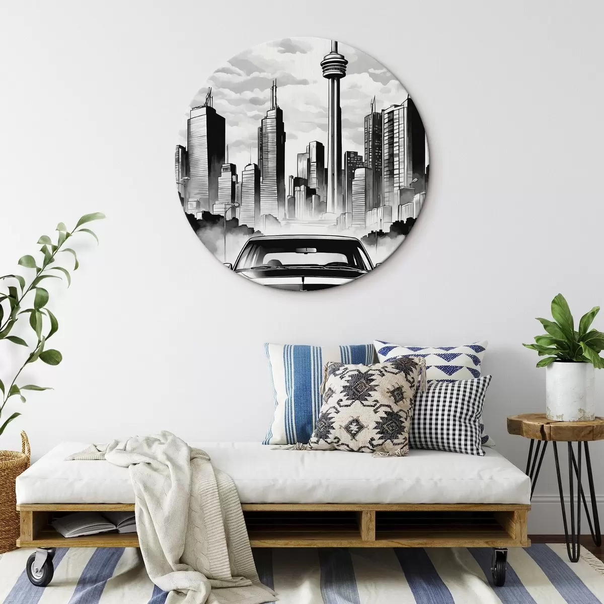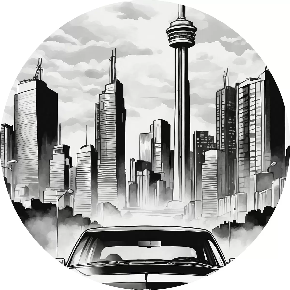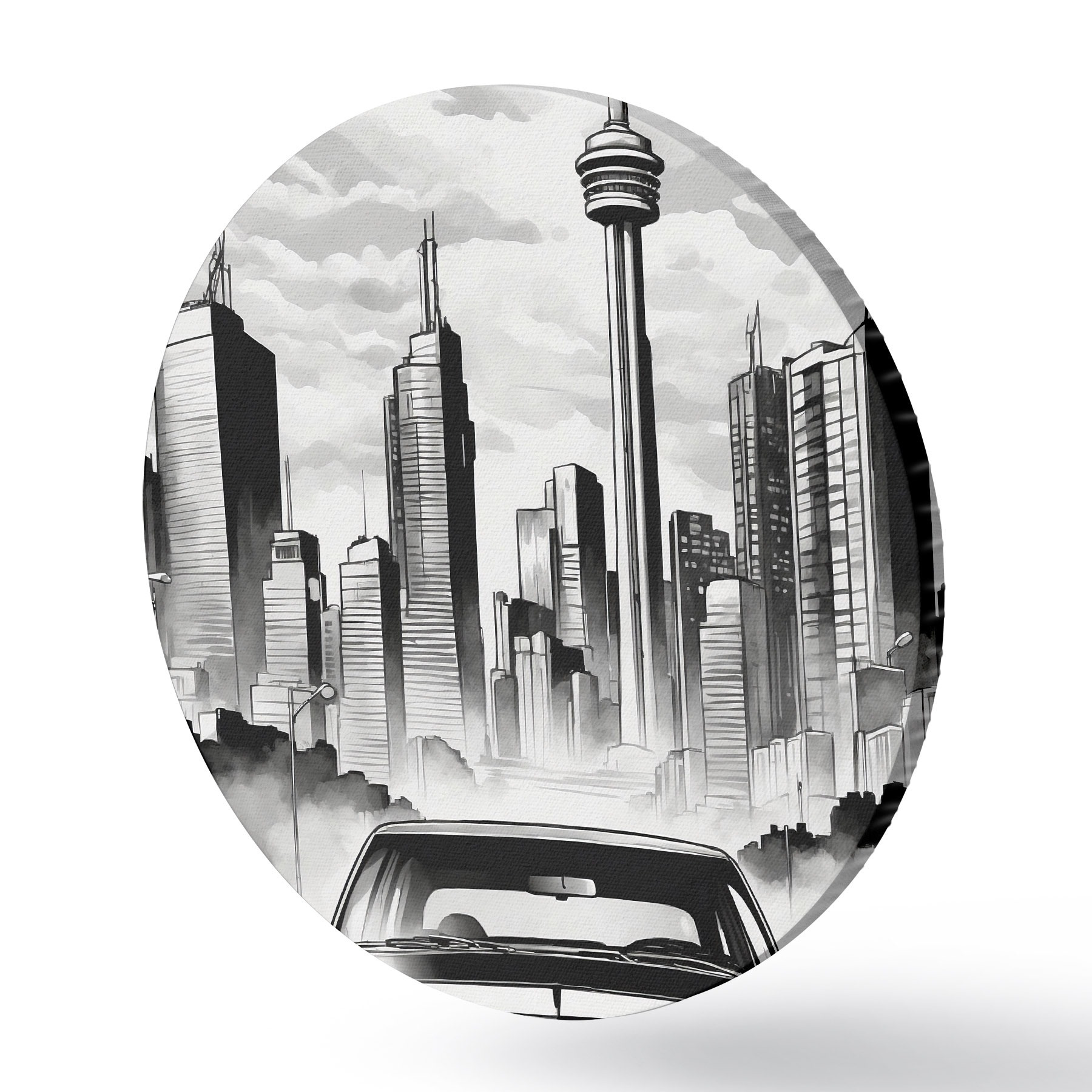 Apaļas gleznas Retro auto uz melnbaltās pilsētas ar debesskrāpjiem fona r44871