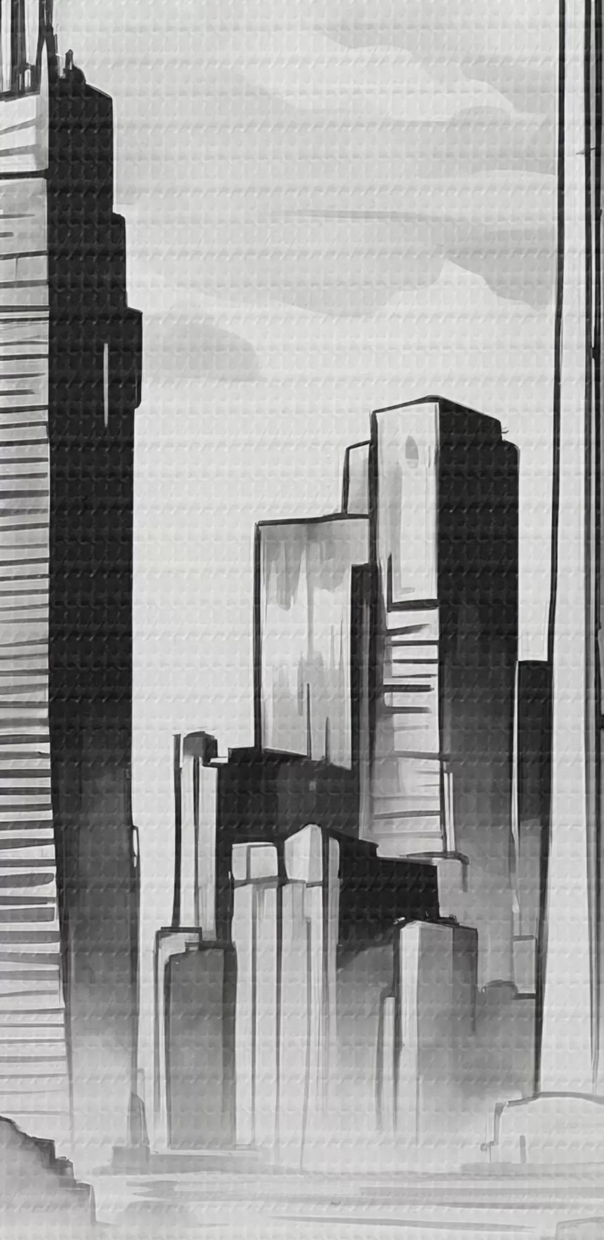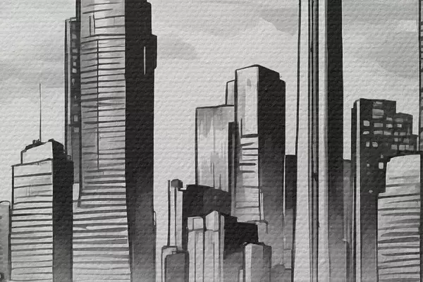 Attēls Retro auto uz melnbaltās pilsētas ar debesskrāpjiem fona Nr r44871