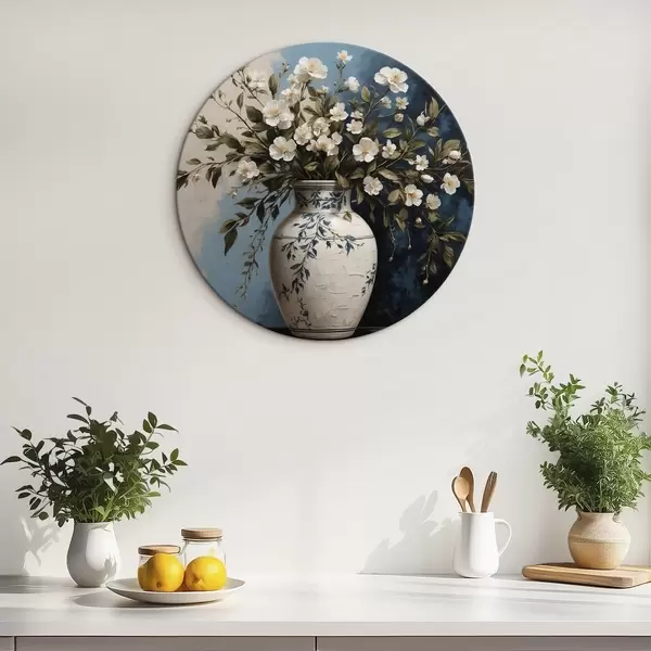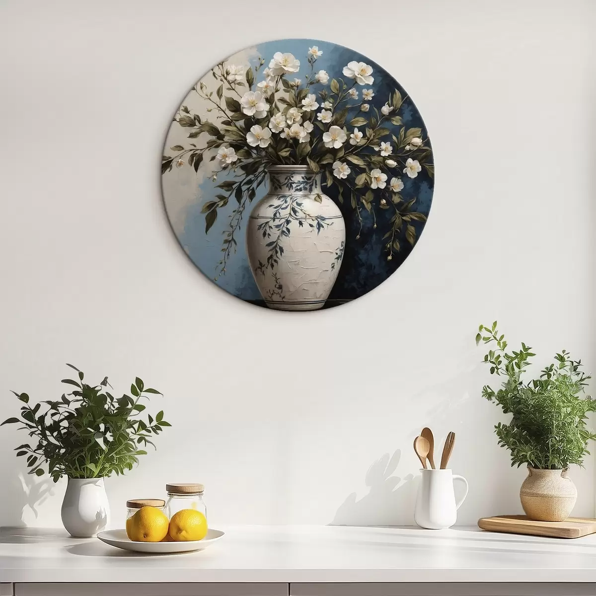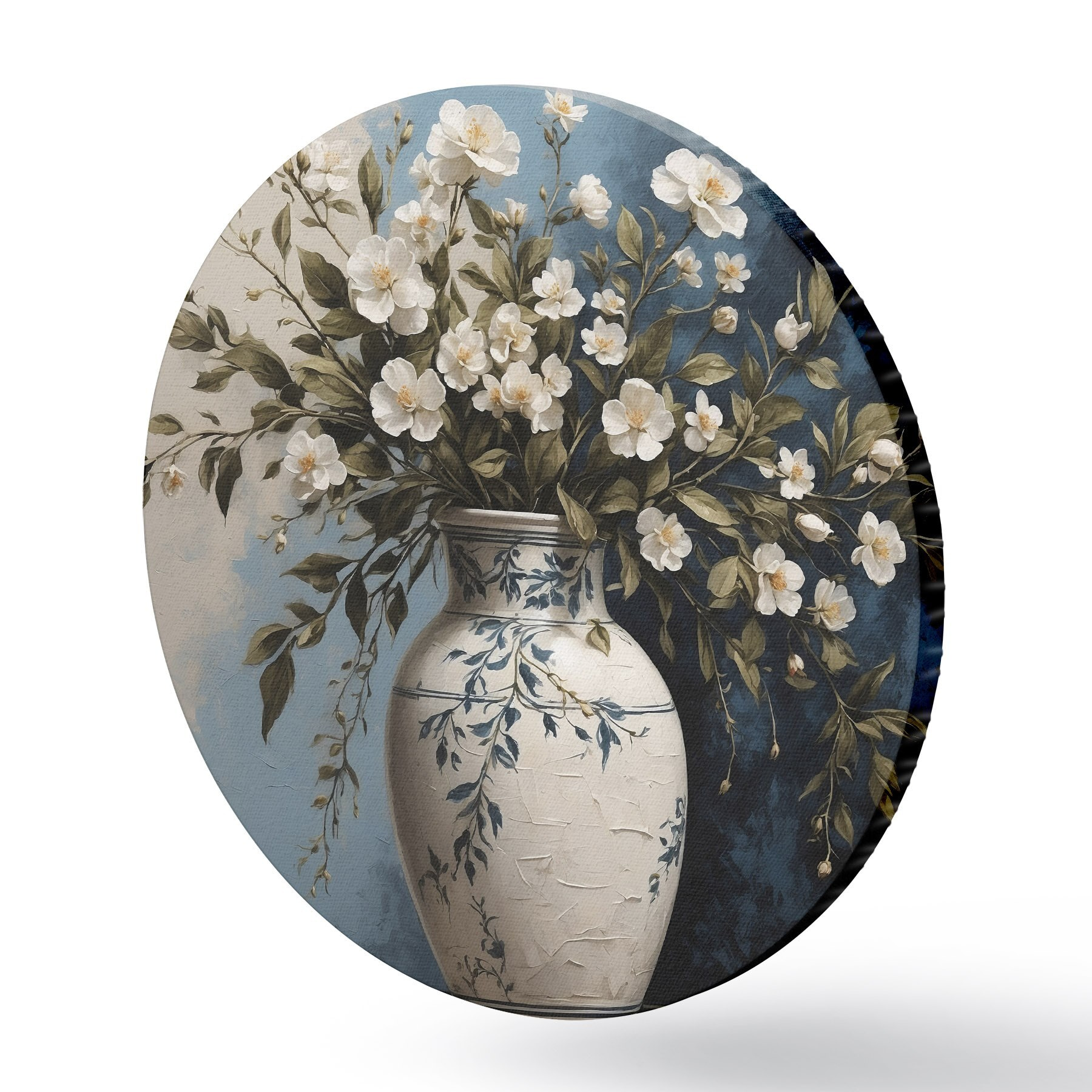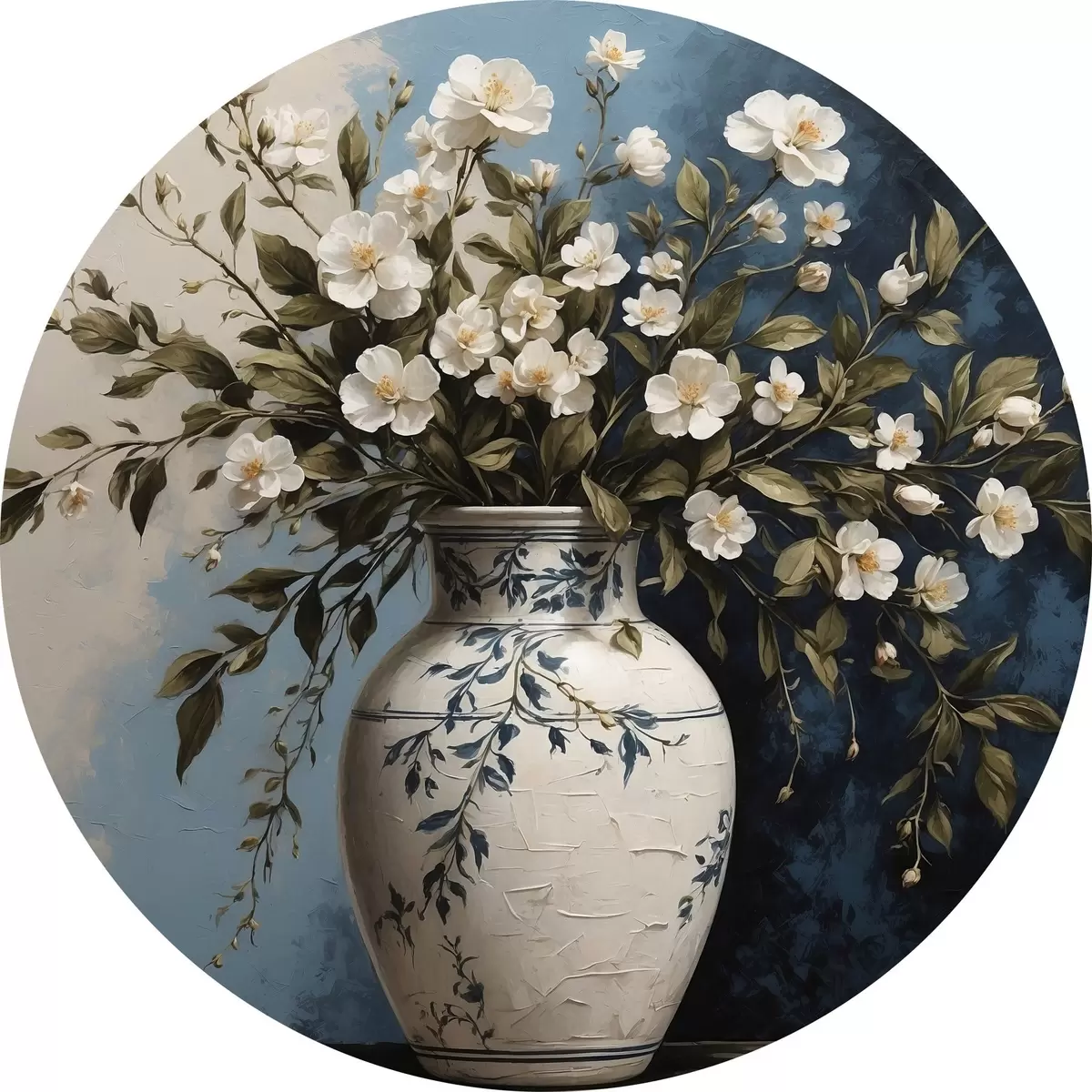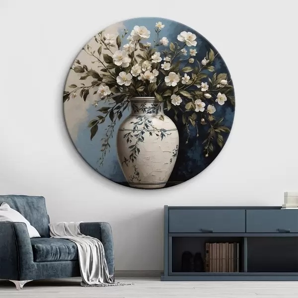 Apaļas gleznas Balti un dzelteni ziedi lielā vāzē uz zila fona r44893