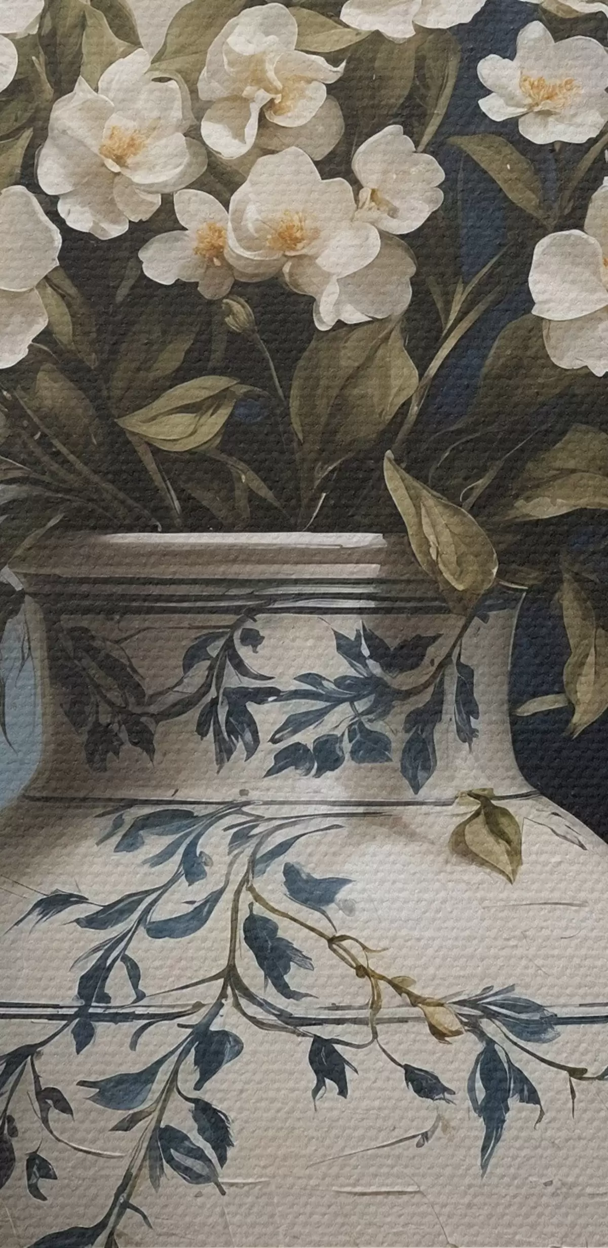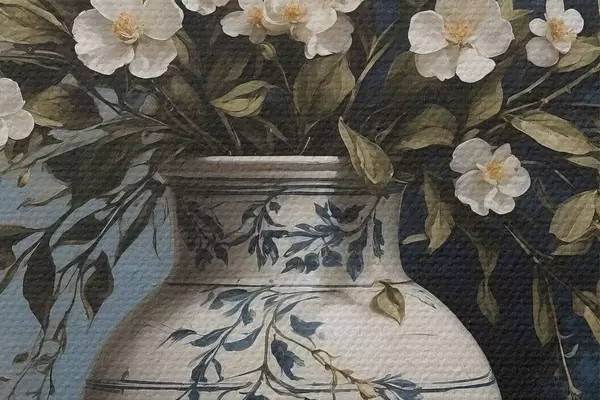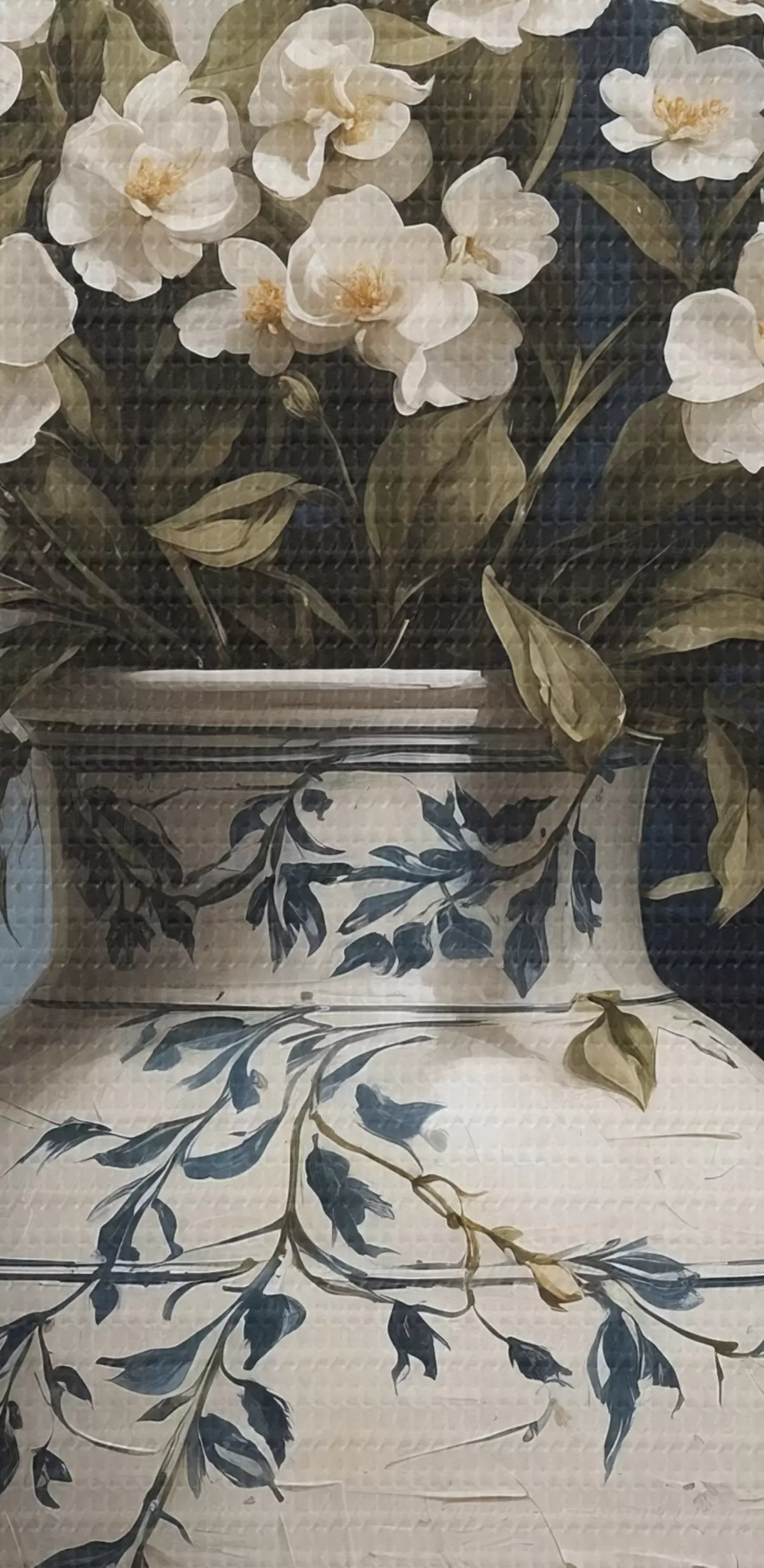 Attēls Balti un dzelteni ziedi lielā vāzē uz zila fona Nr r44893