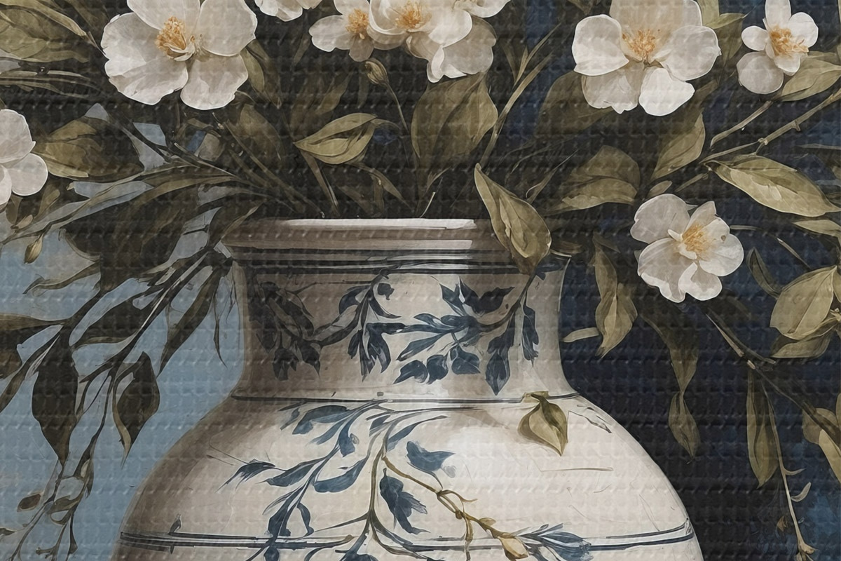 Smalkais diegu pinums uz šī audekla atgādina profesionālu mākslinieku audeklu virsmu.