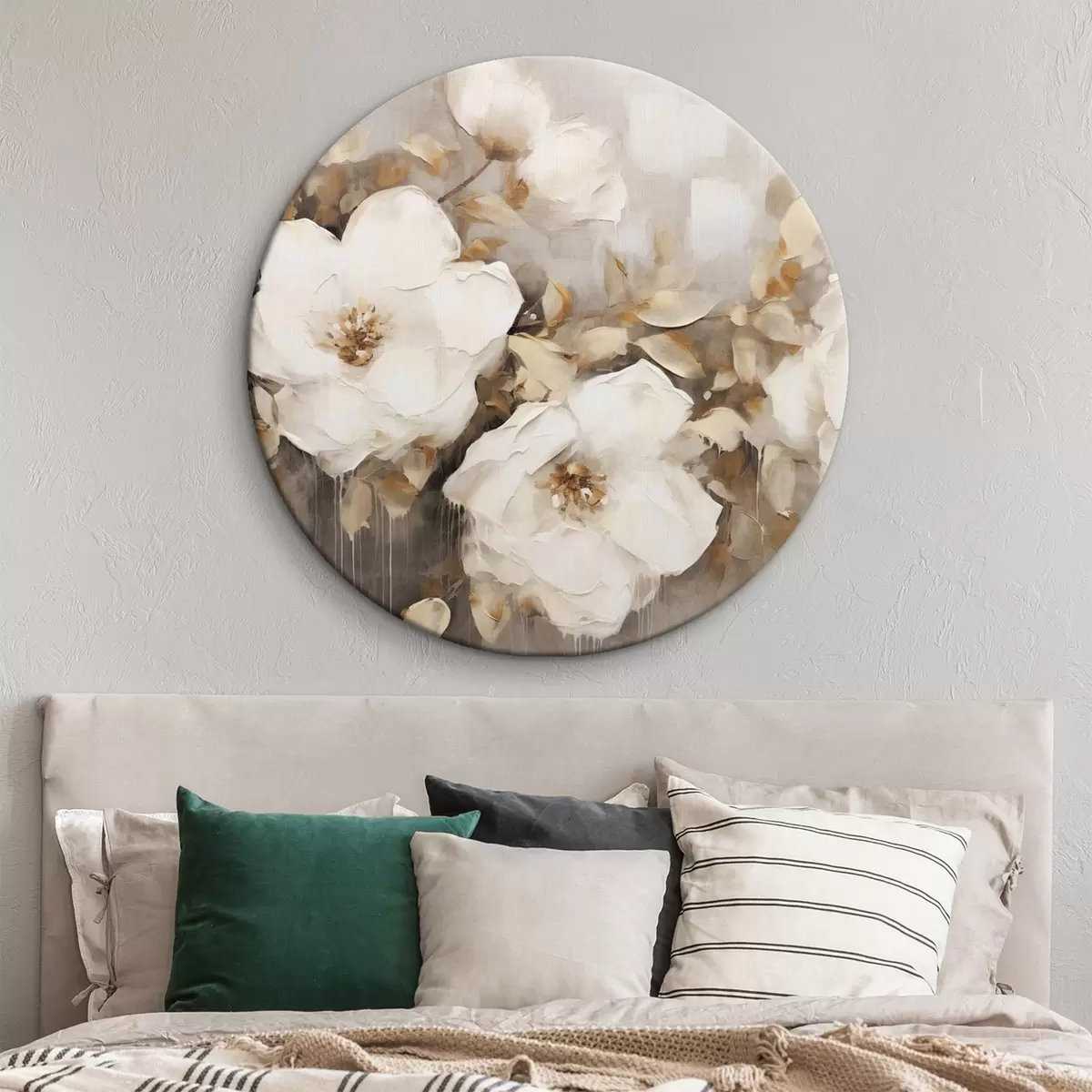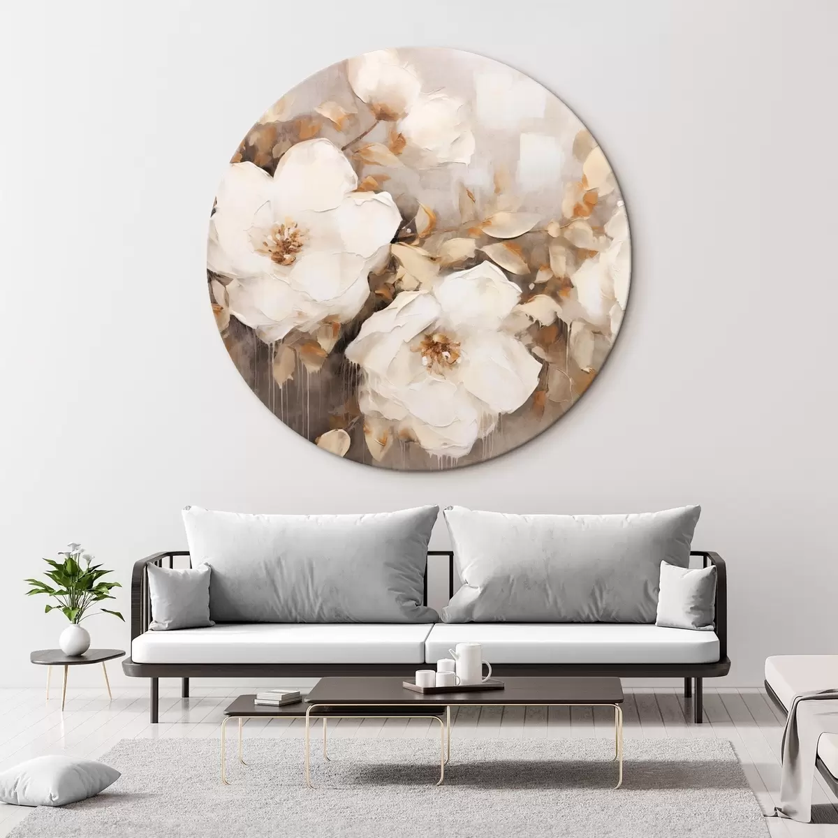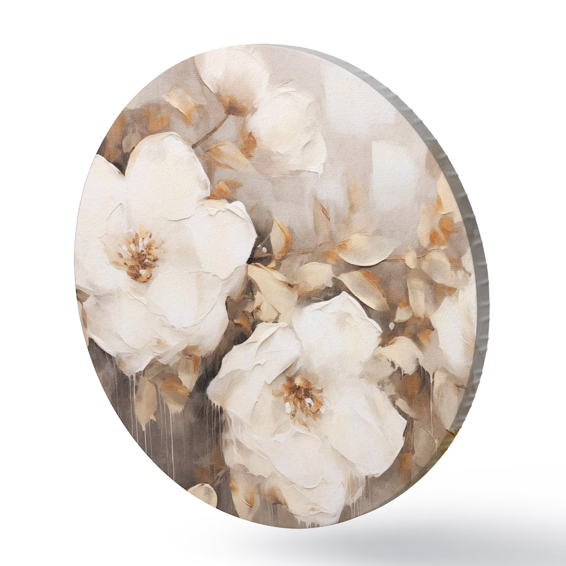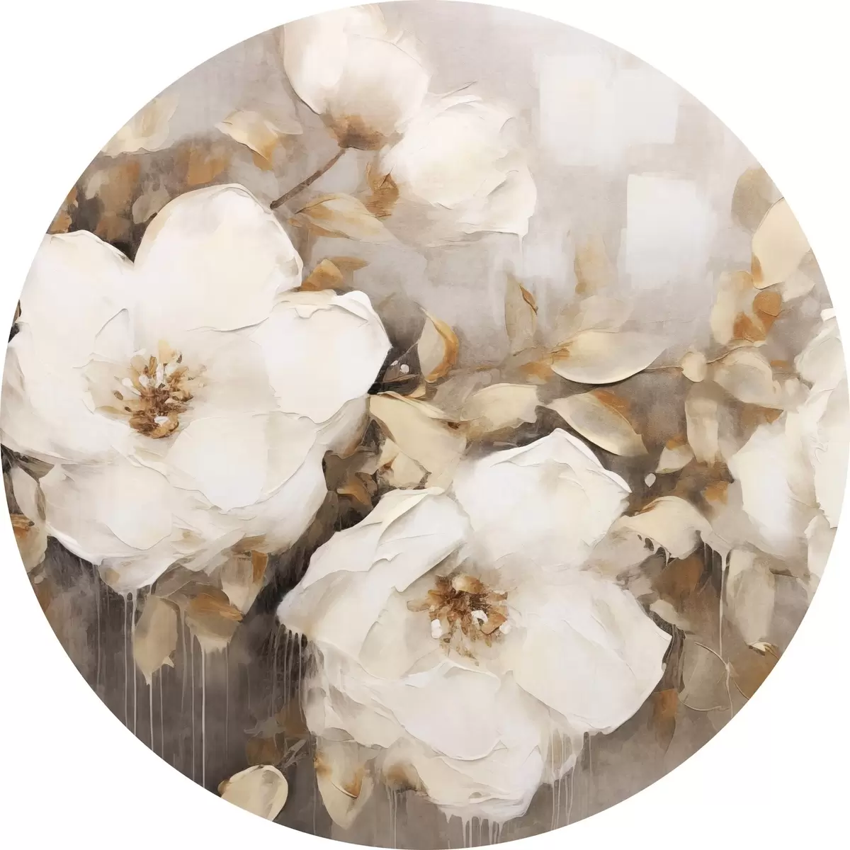 Apaļas gleznas Balti ziedi ar brūnām lapām smilškrāsas fona, eļļas glezna imitācija, ziedu kompozīcija, botāniskā māksla r44922