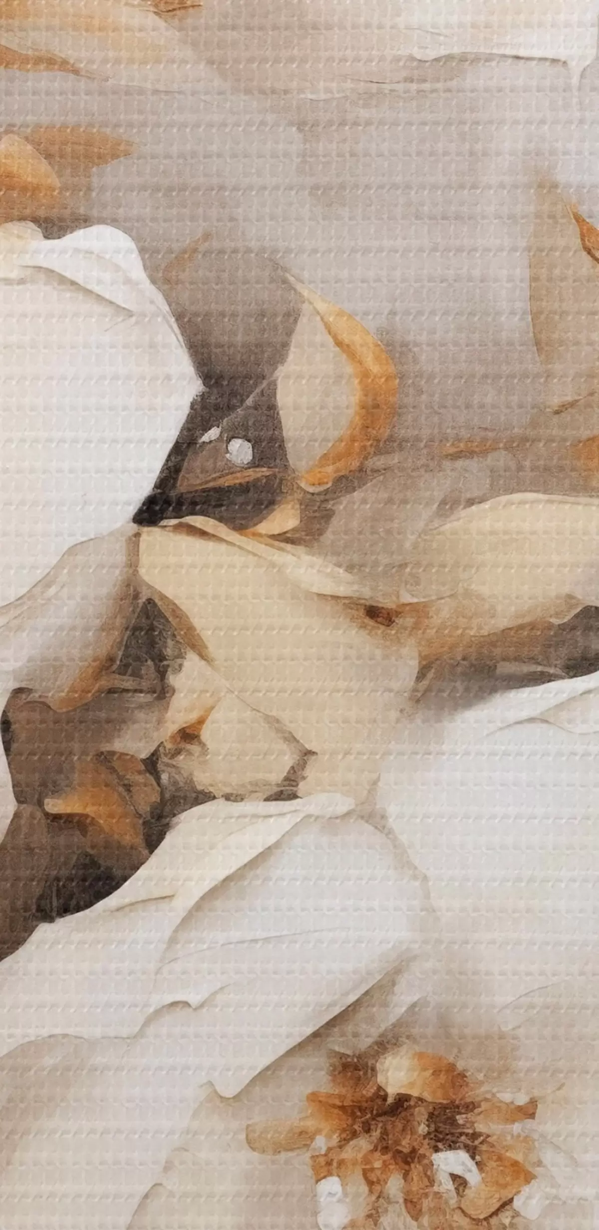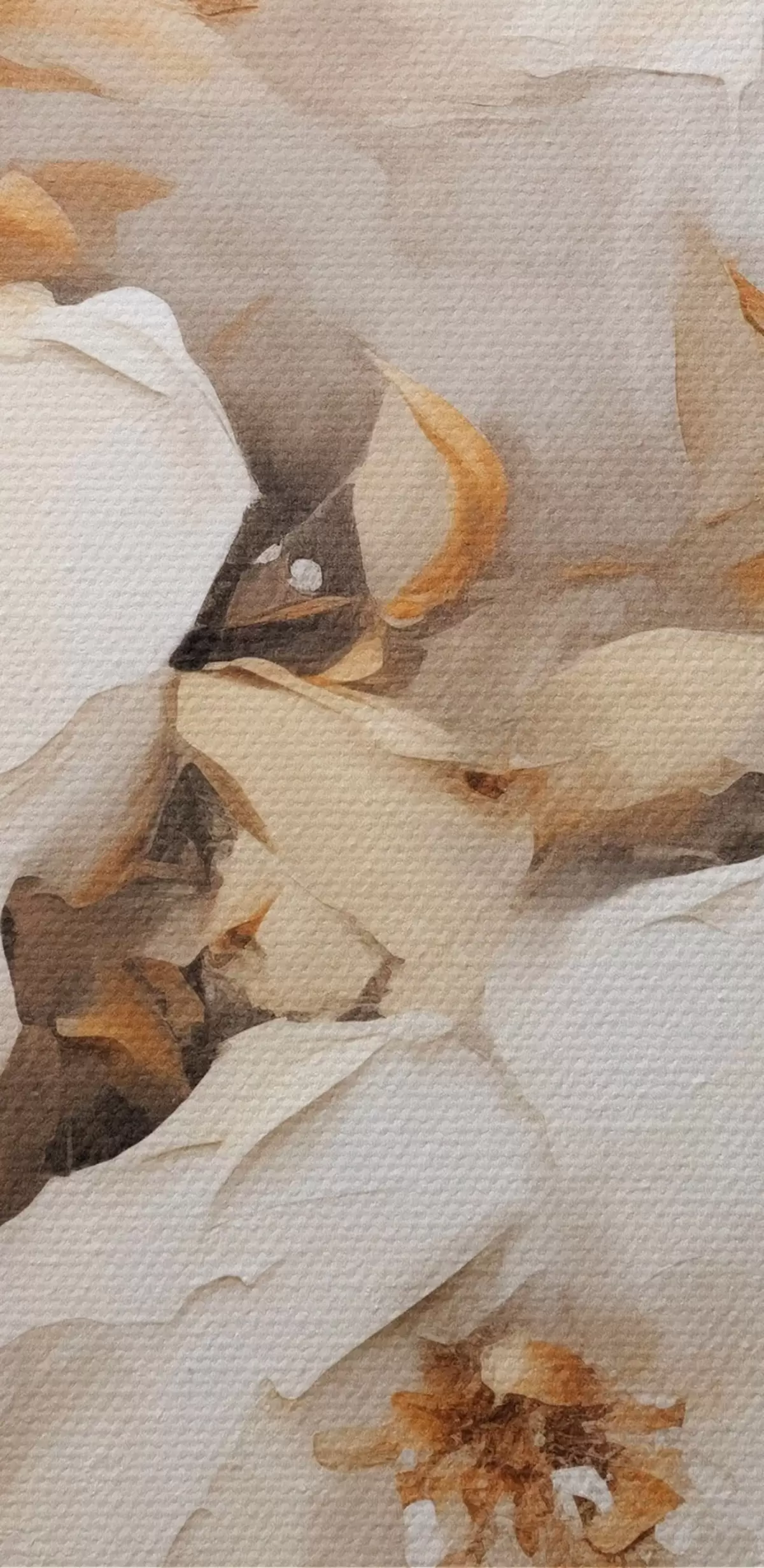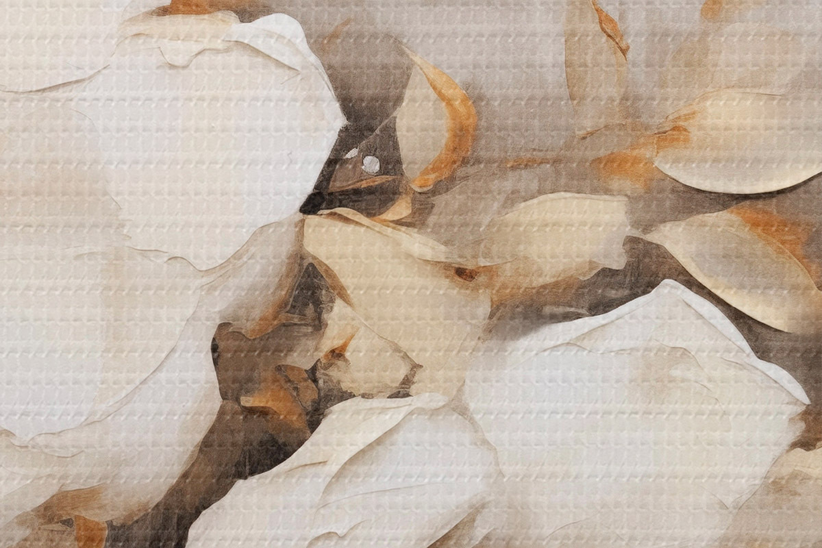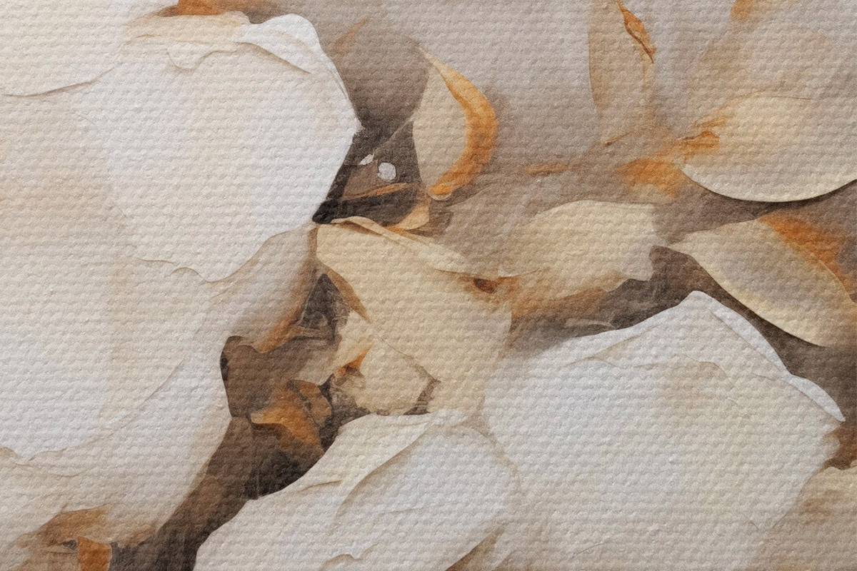 Attēls Balti ziedi ar brūnām lapām smilškrāsas fona, eļļas glezna imitācija, ziedu kompozīcija, botāniskā māksla Nr r44922