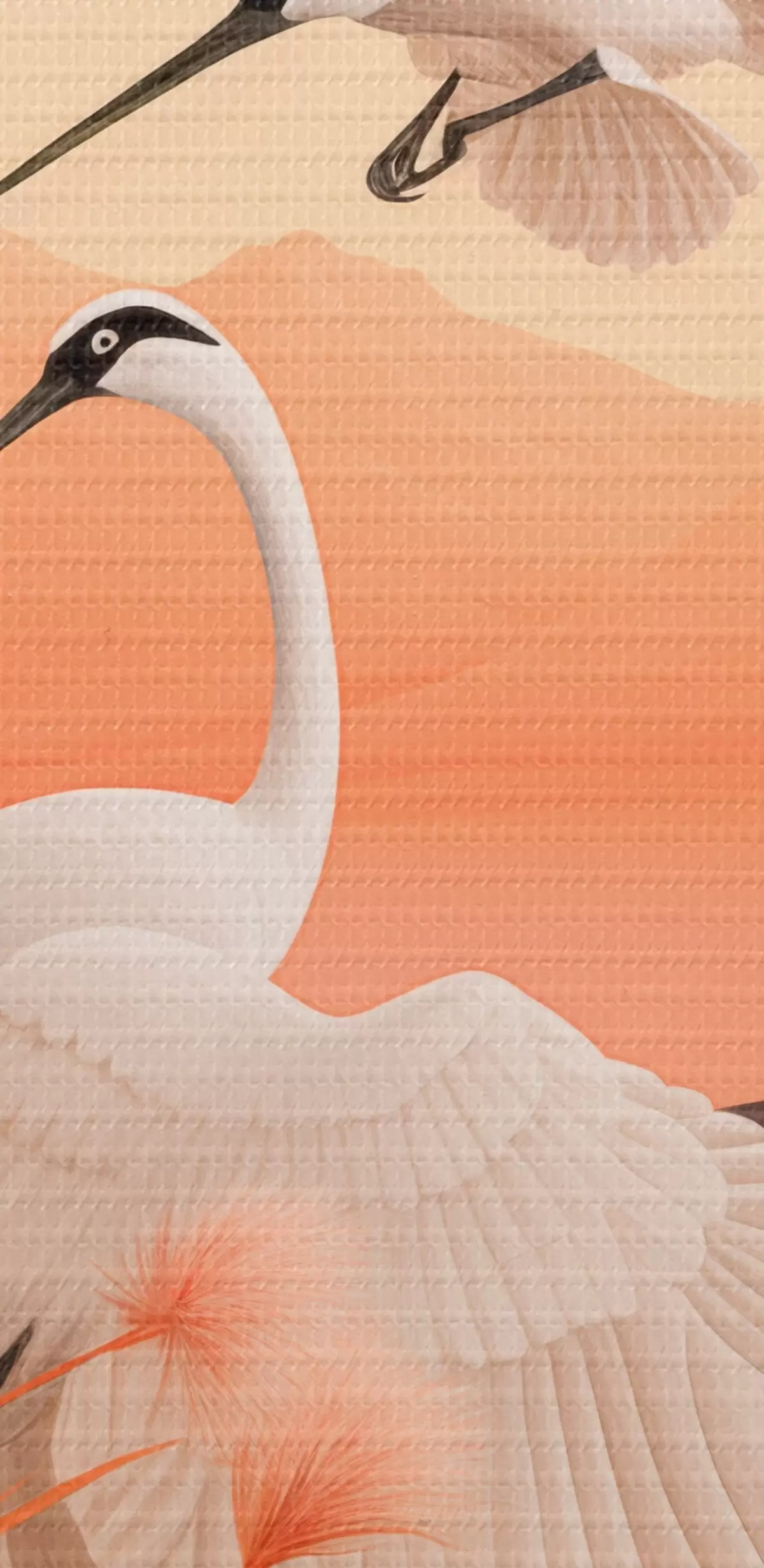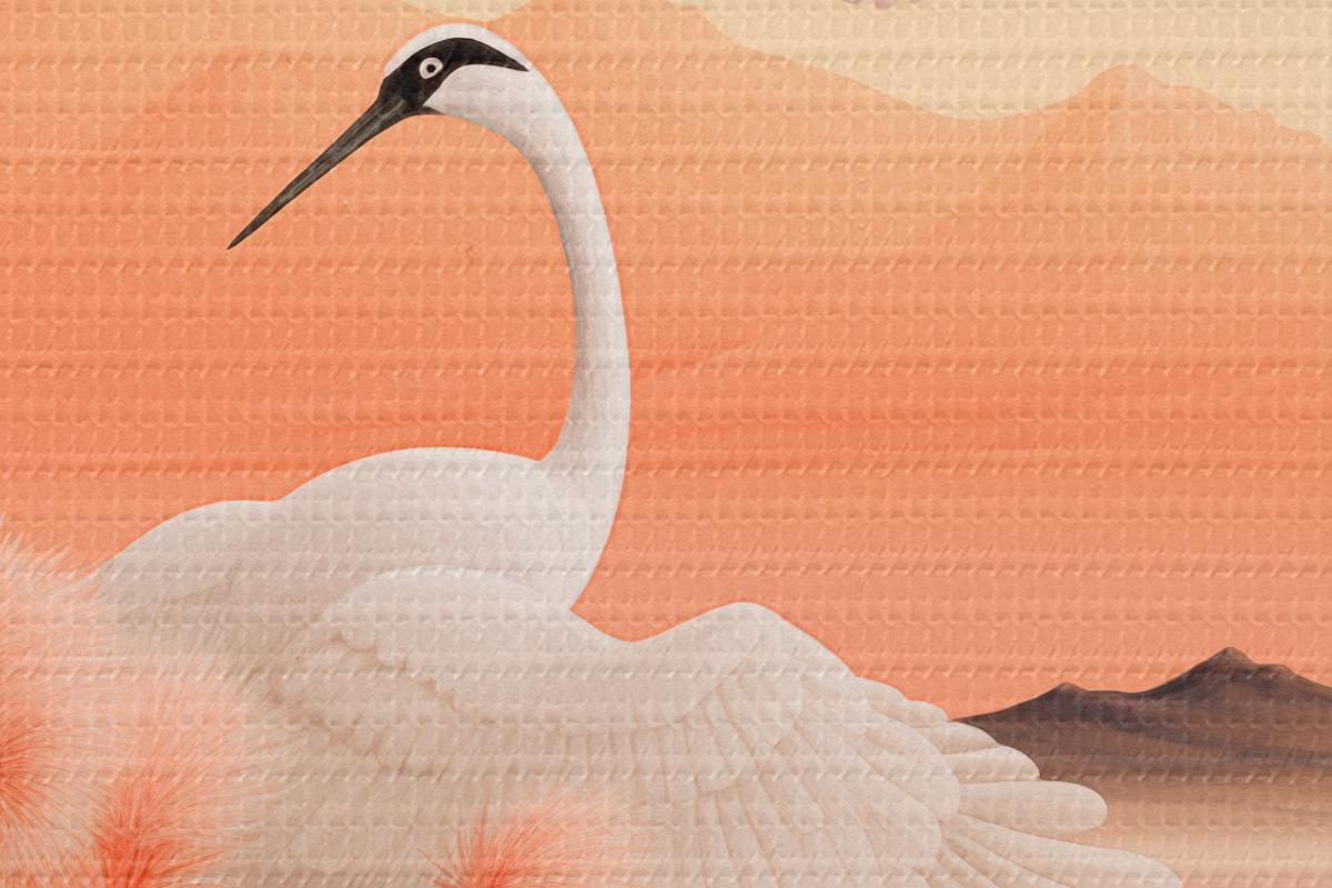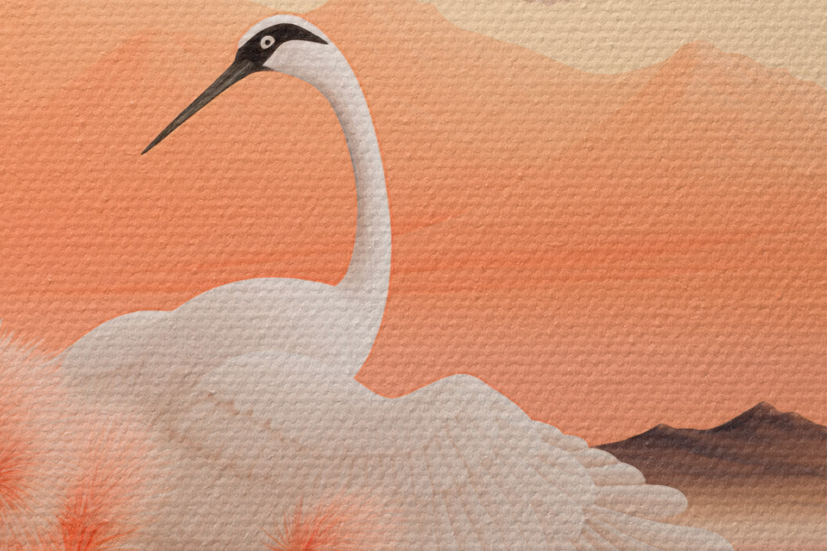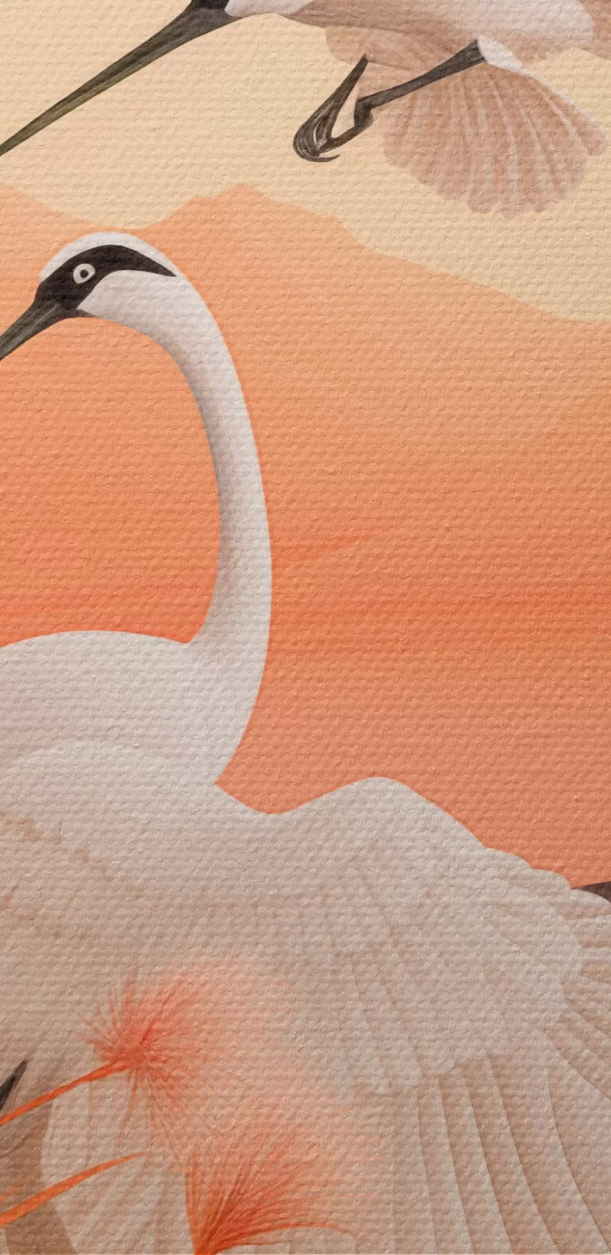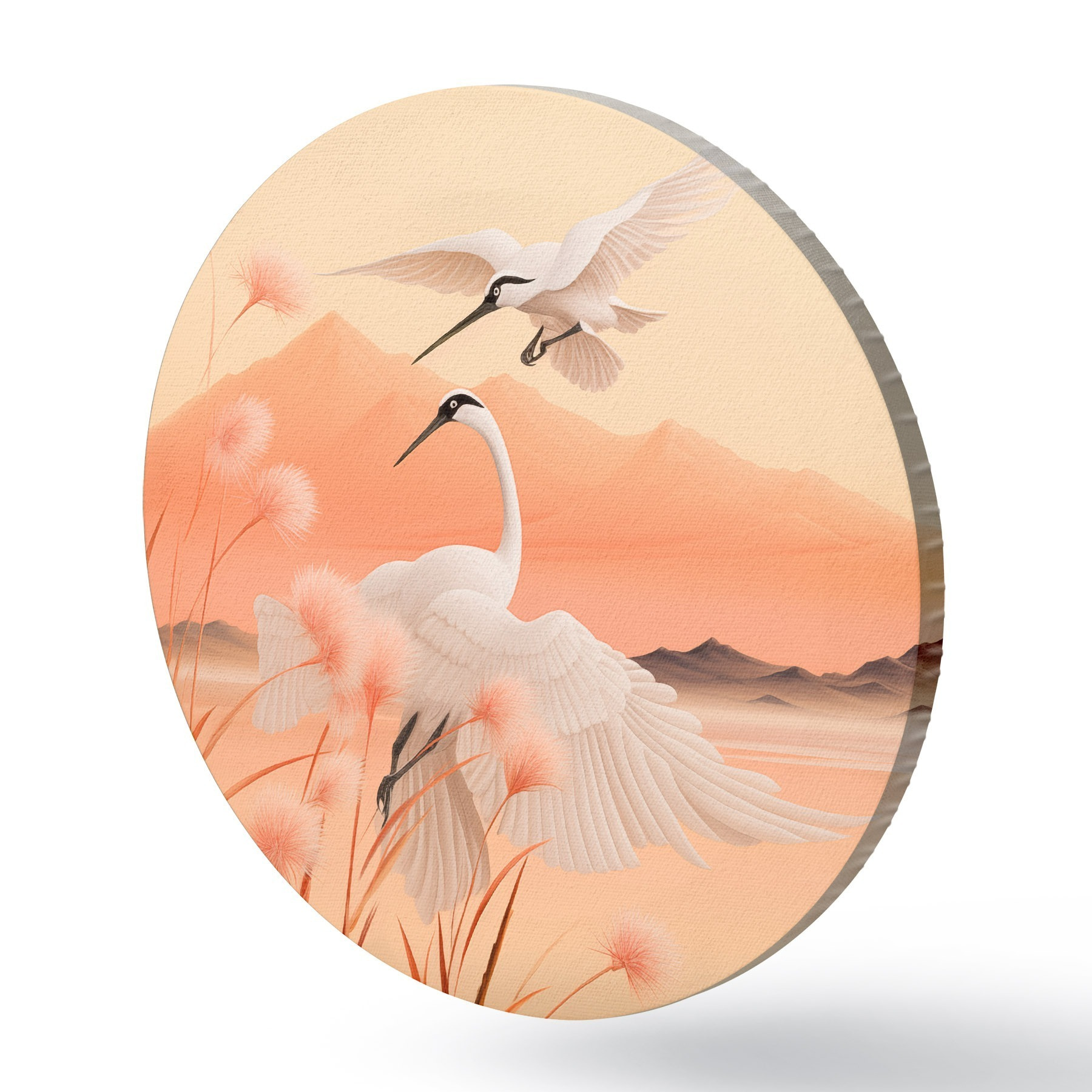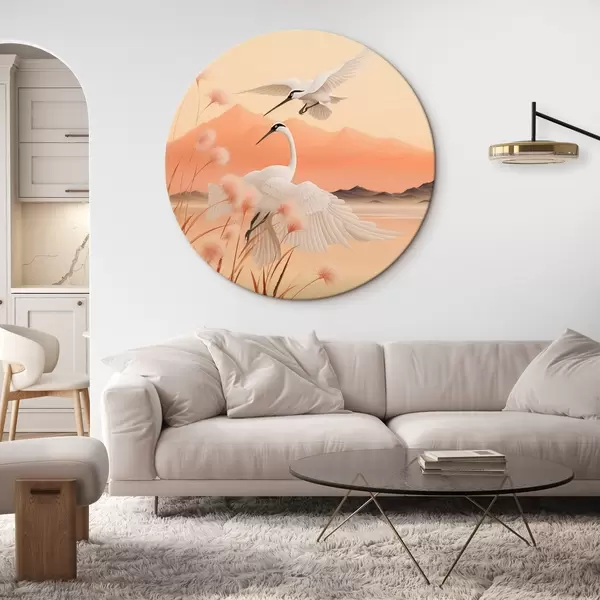 Apaļas gleznas Baltas dzērves ar rozā niedrēm priekšplānā, kalni un ezers fonā, maiga oranža gaisma r44925