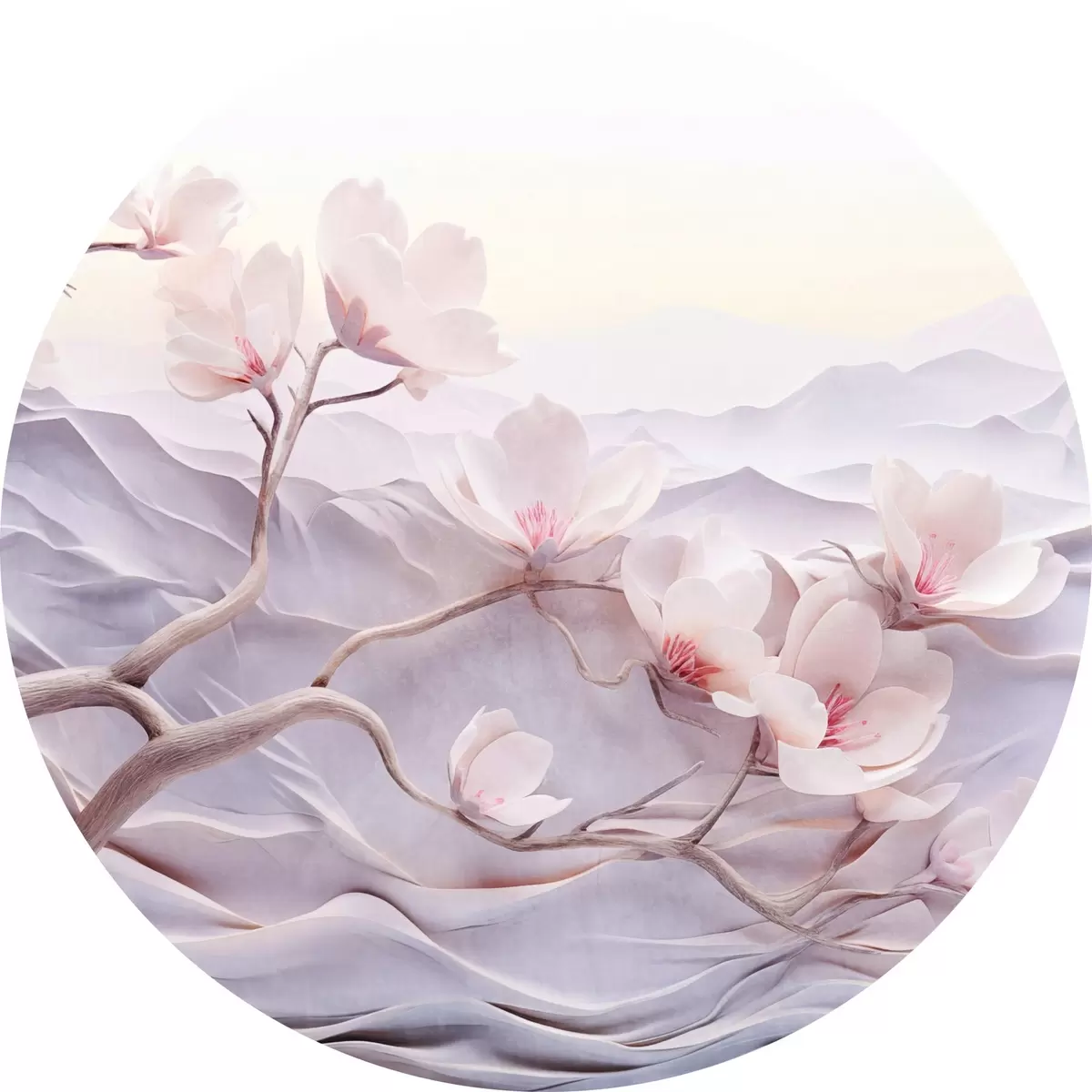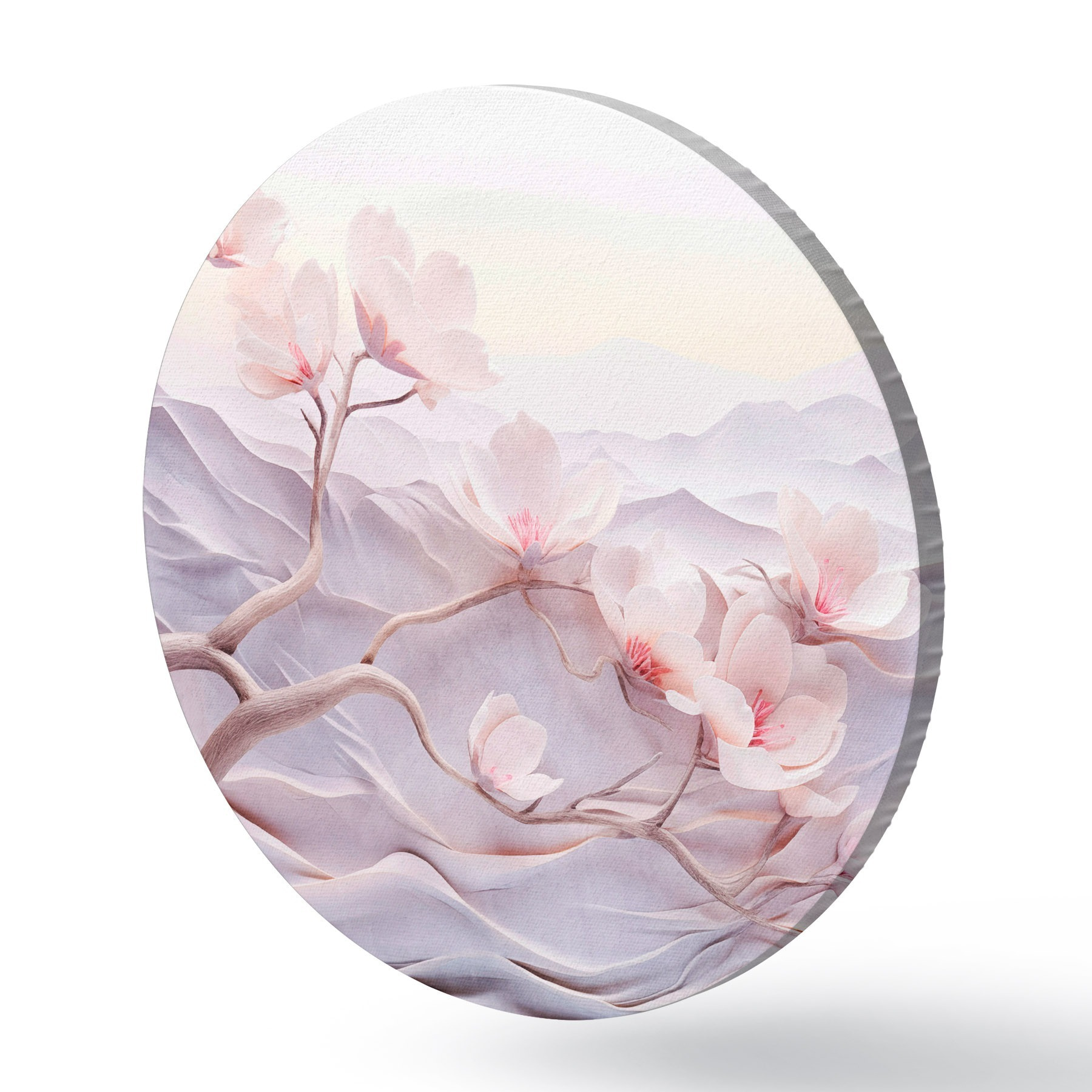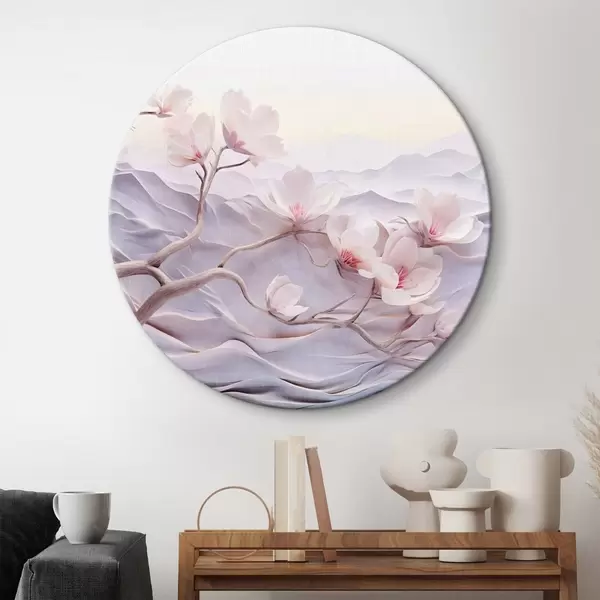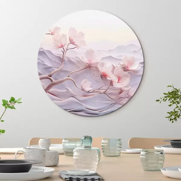 Apaļas gleznas Ziedu zars ar rozā ziediem, kalni fonā, maigas pasteļkrāsas, japāņu tekstūras māksla r44930