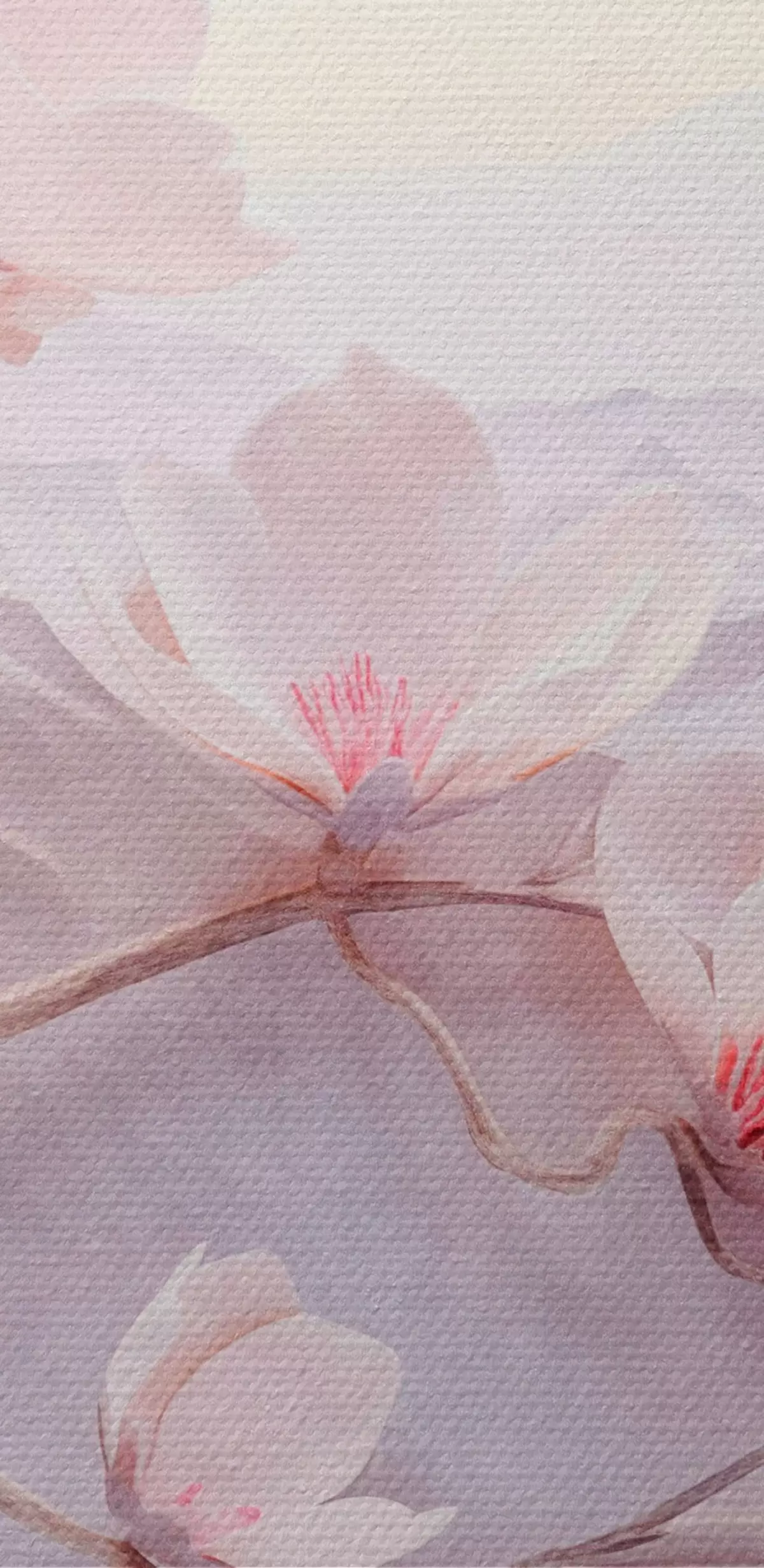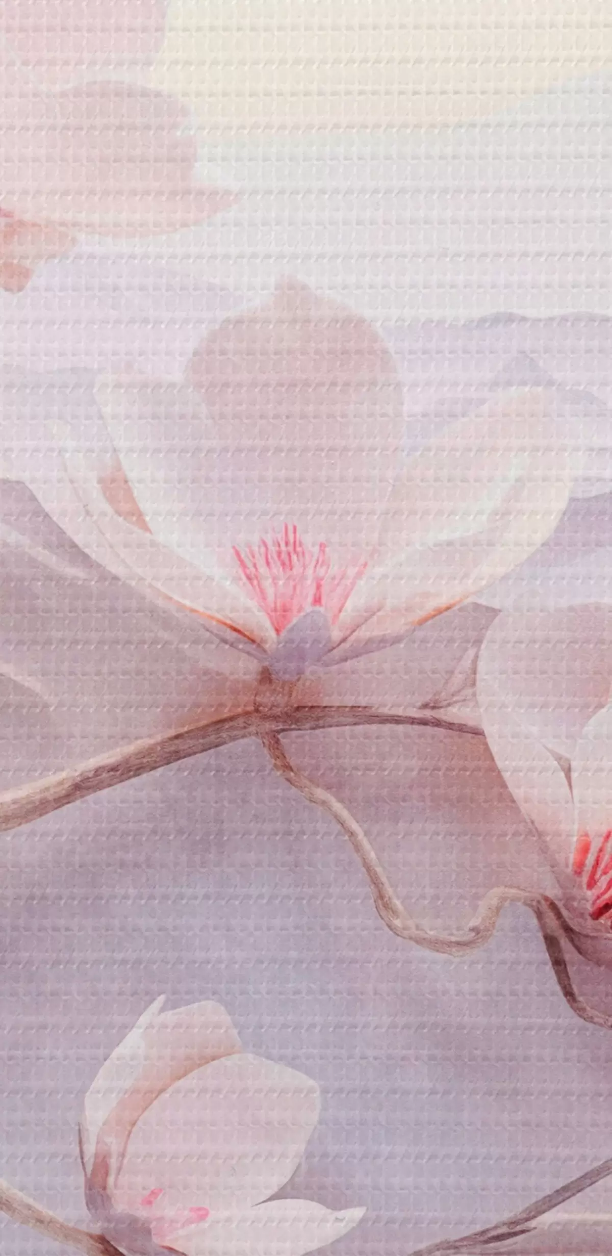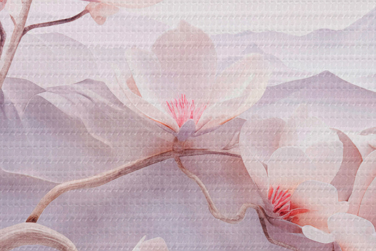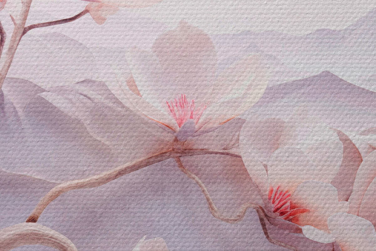 Attēls Ziedu zars ar rozā ziediem, kalni fonā, maigas pasteļkrāsas, japāņu tekstūras māksla Nr r44930