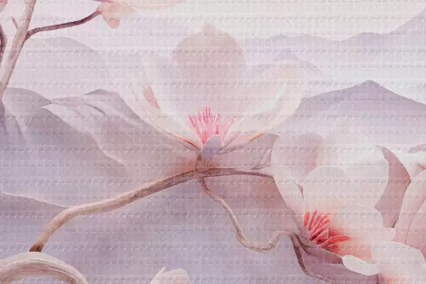 Attēls Ziedu zars ar rozā ziediem, kalni fonā, maigas pasteļkrāsas, japāņu tekstūras māksla Nr r44930