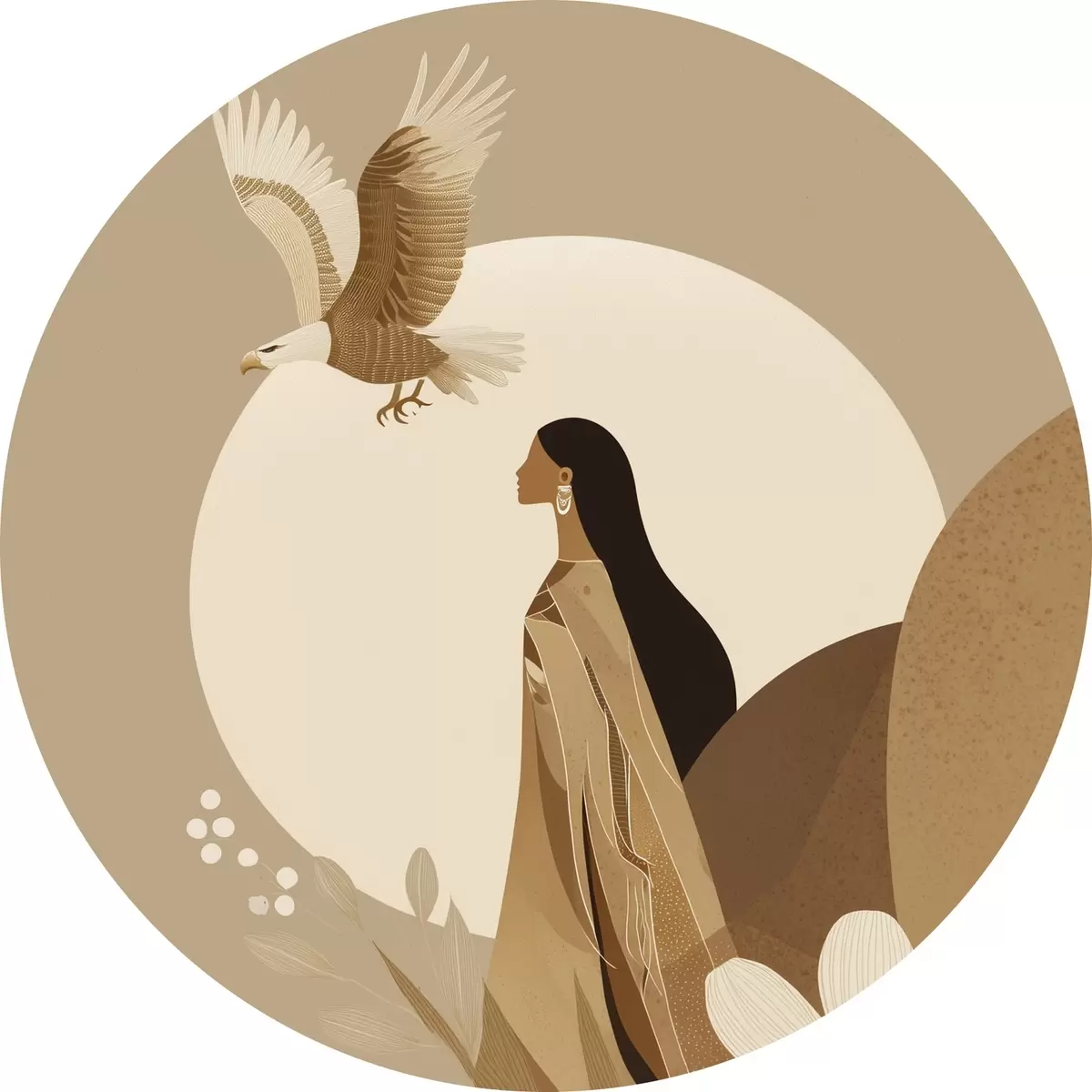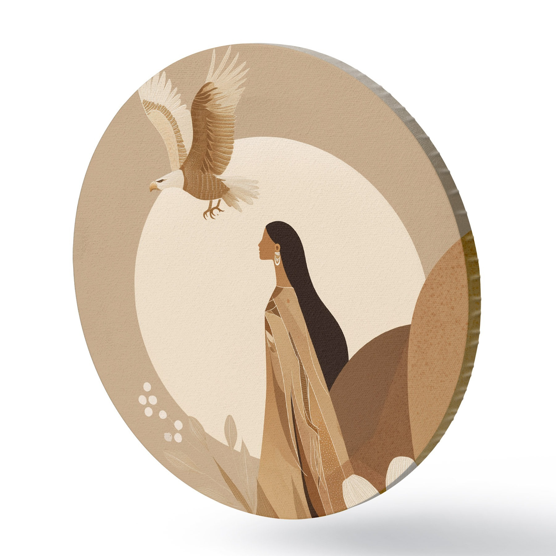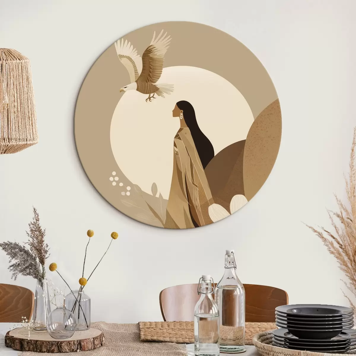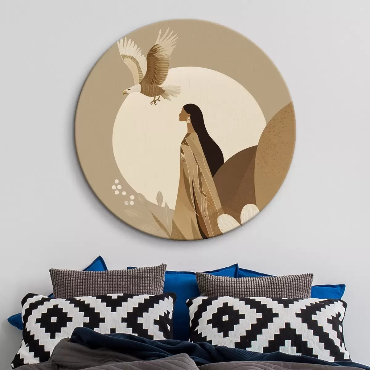 Apaļas gleznas Abstrakcija ar sievieti un ērgli debesīs, bēšas krāsas r44978