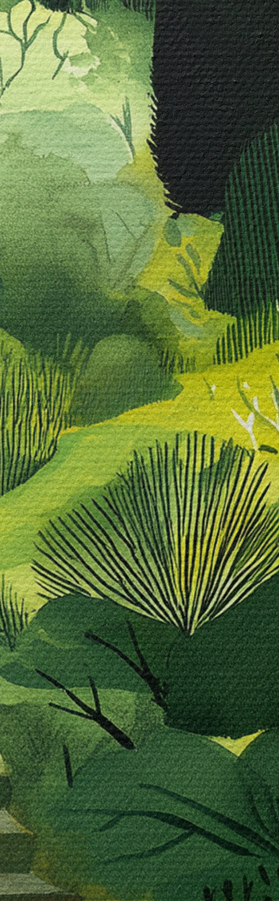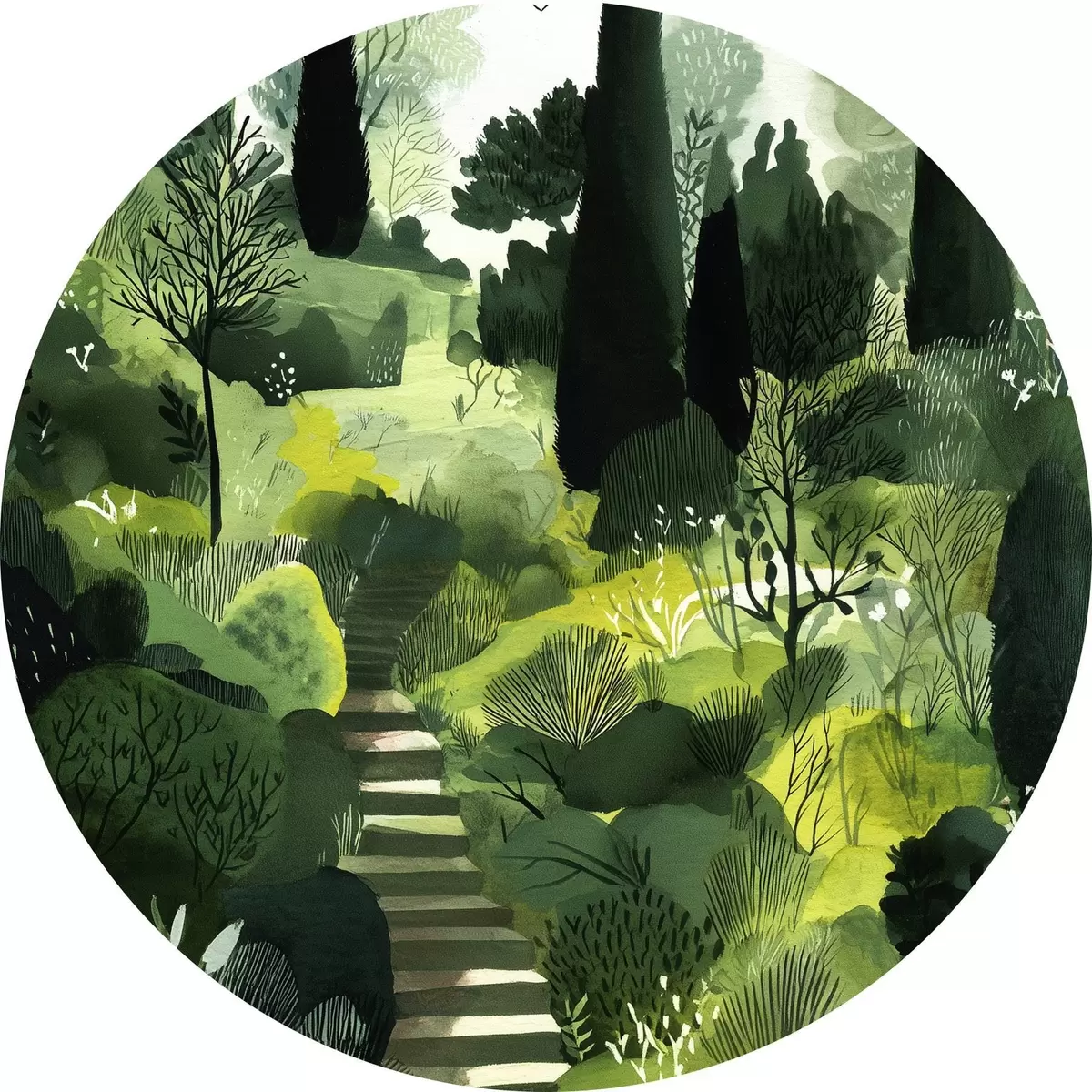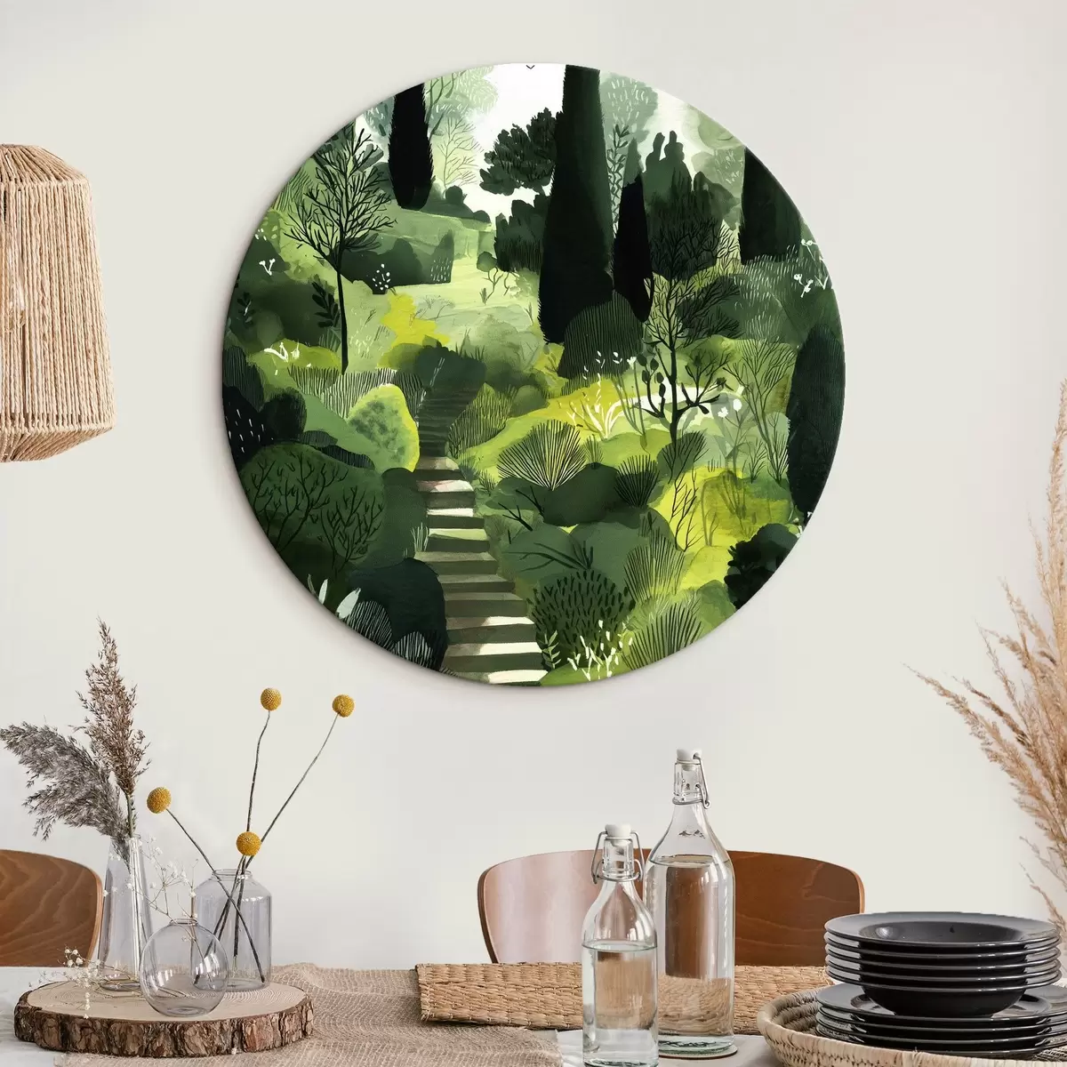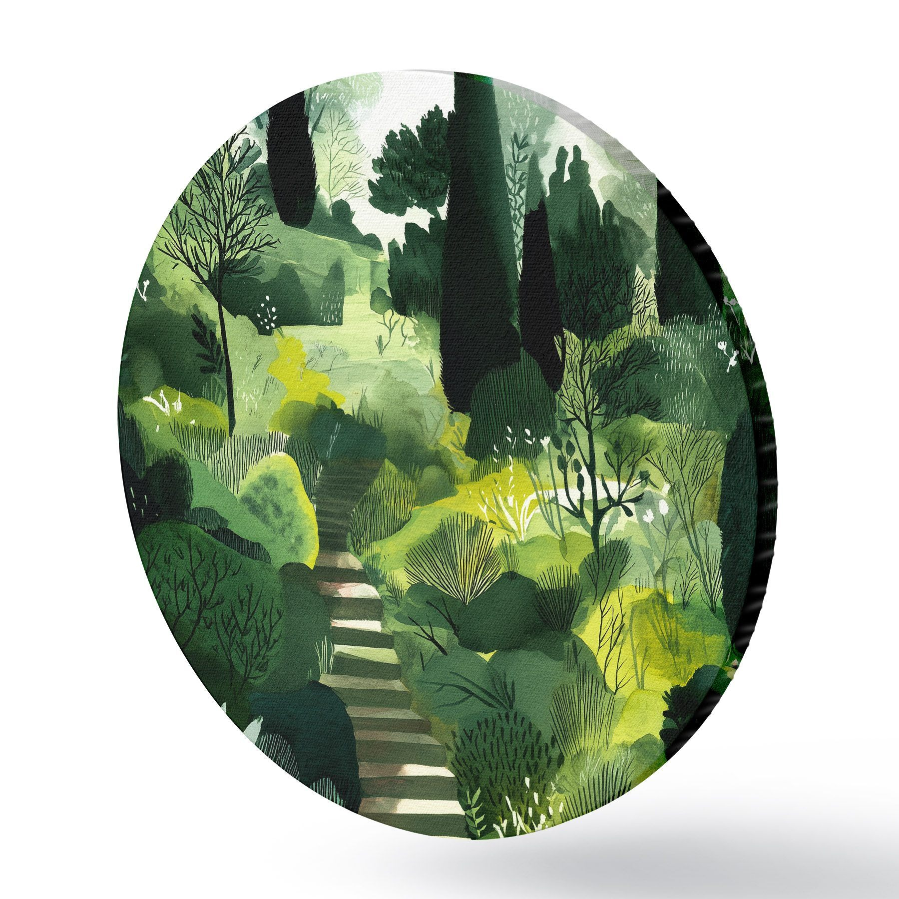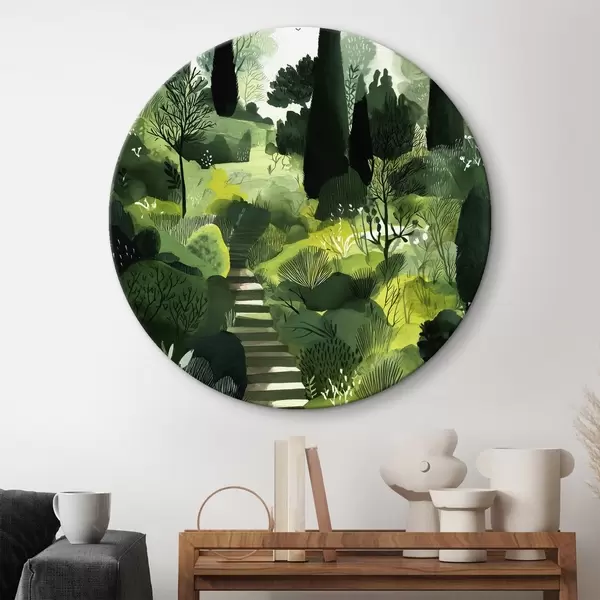 Apaļas gleznas Zaļie pakalni ar kokiem un krūmiem, betona kāpnes, sulīgas krāsas r44980