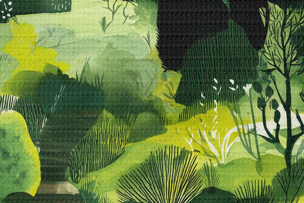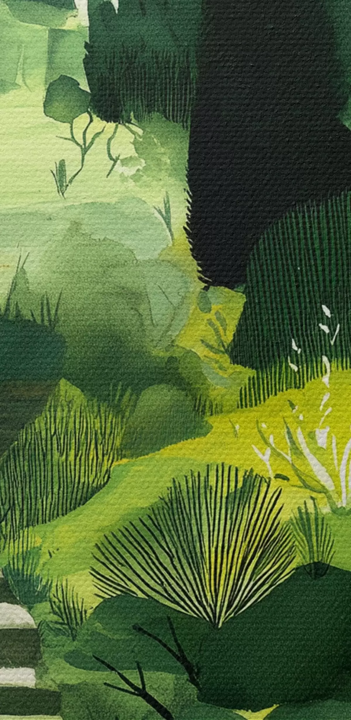 Attēls Zaļie pakalni ar kokiem un krūmiem, betona kāpnes, sulīgas krāsas Nr r44980