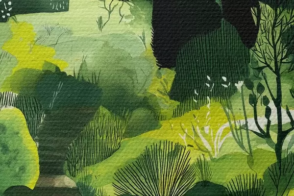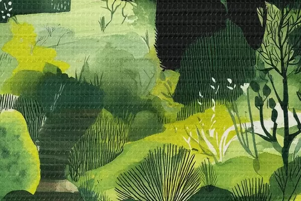 Attēls Zaļie pakalni ar kokiem un krūmiem, betona kāpnes, sulīgas krāsas Nr r44980