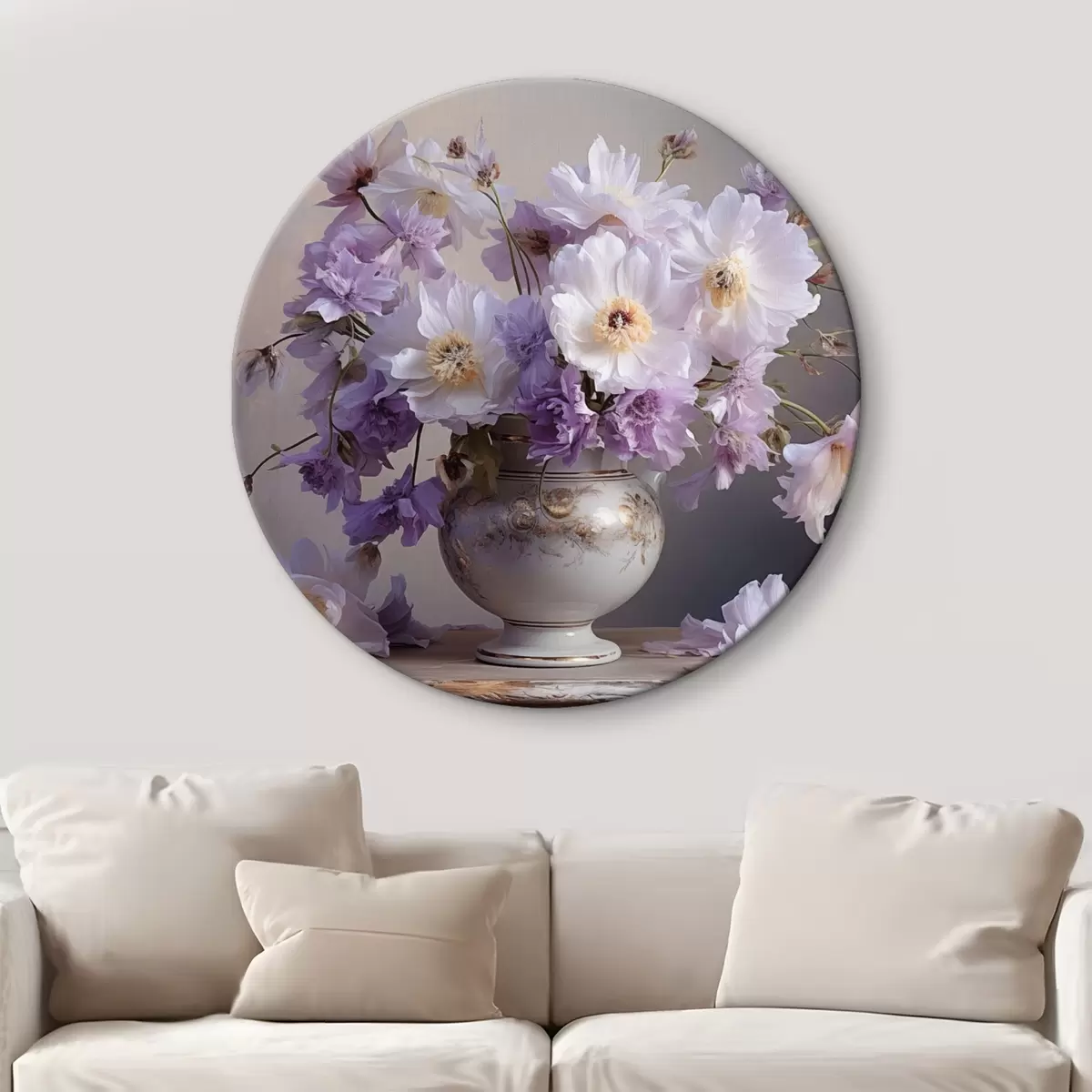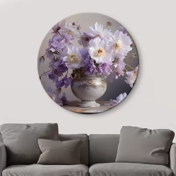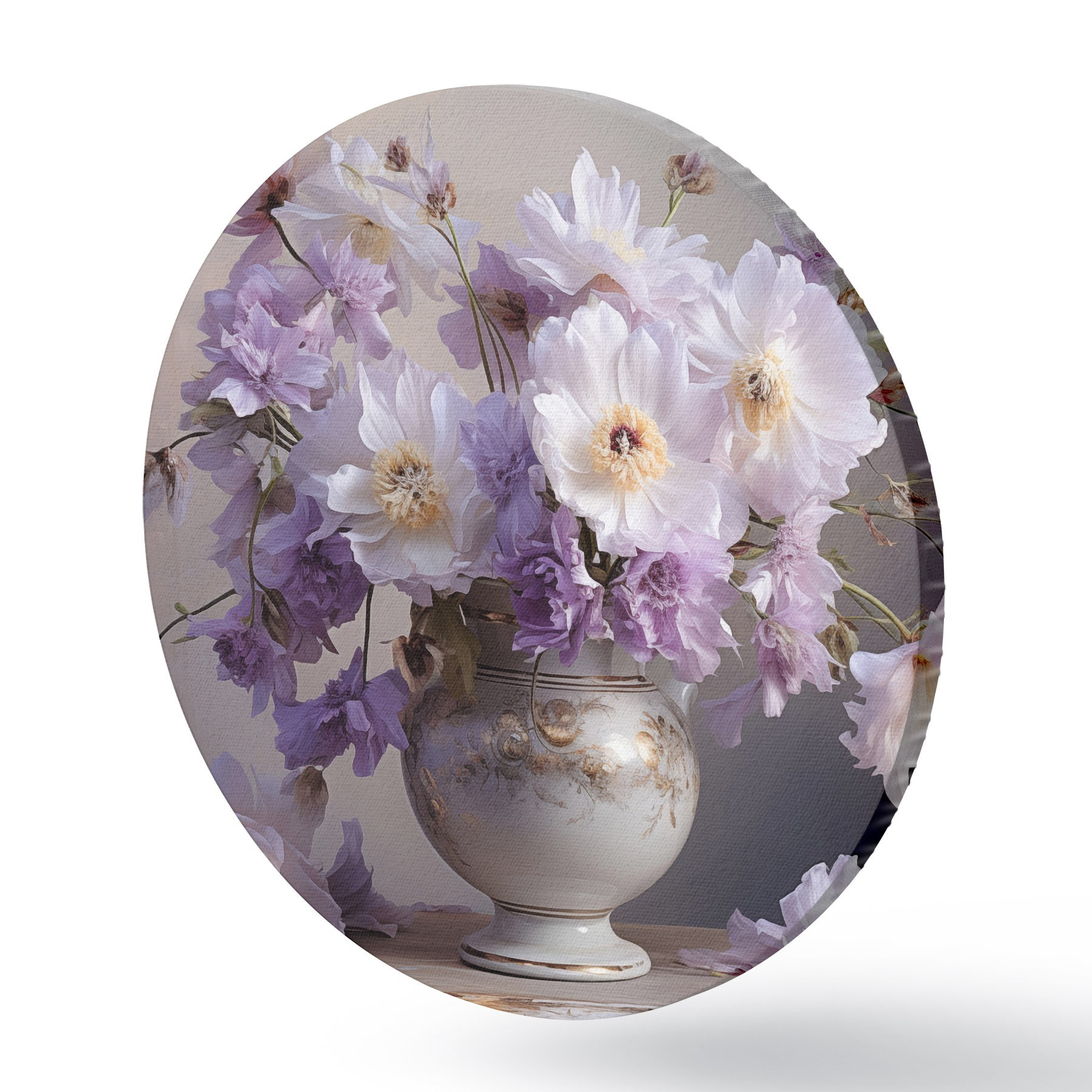 Apaļas gleznas Ziedu klusā daba: balti un violeti ziedi mākslinieciskā stilā r45058