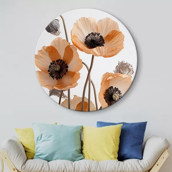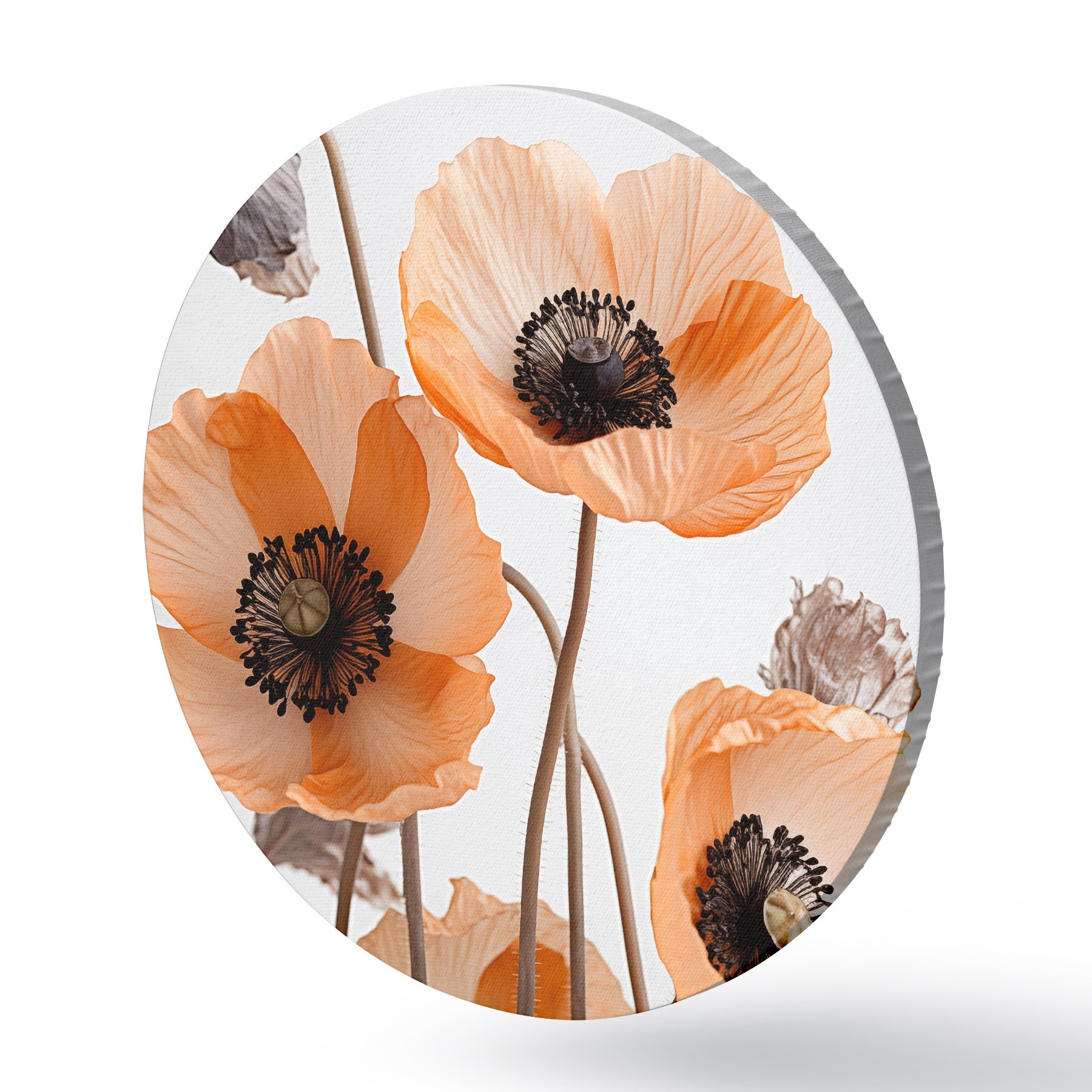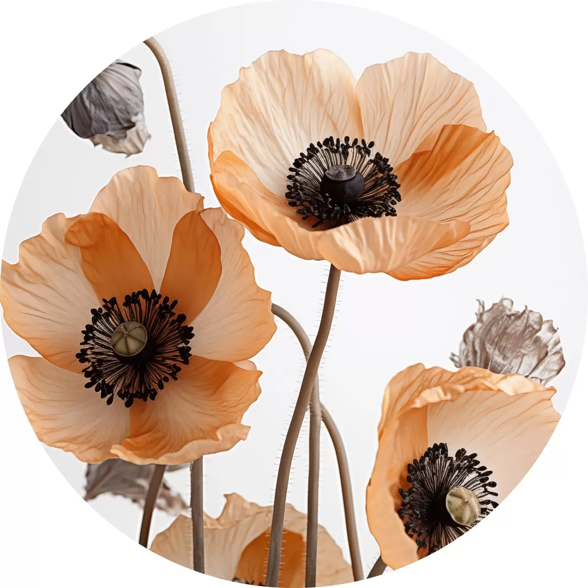 Apaļas gleznas Oranžās magones, kaltēti ziedi uz gaiša fona, maigs apgaismojums, maigi ziedlapiņas, ziedu kompozīcija r45167