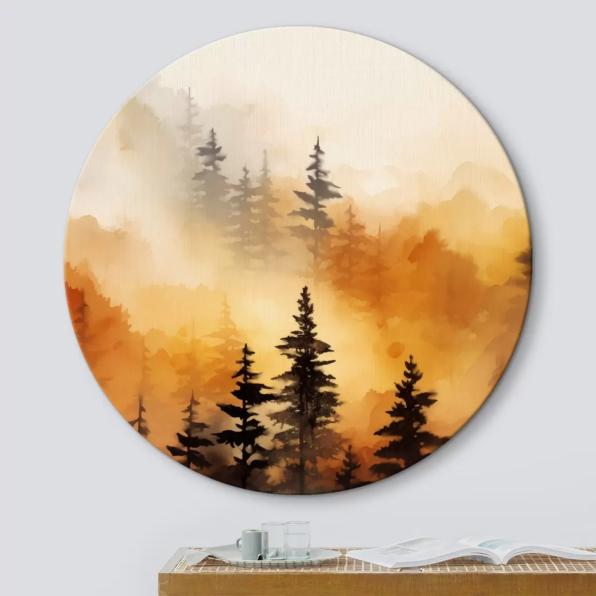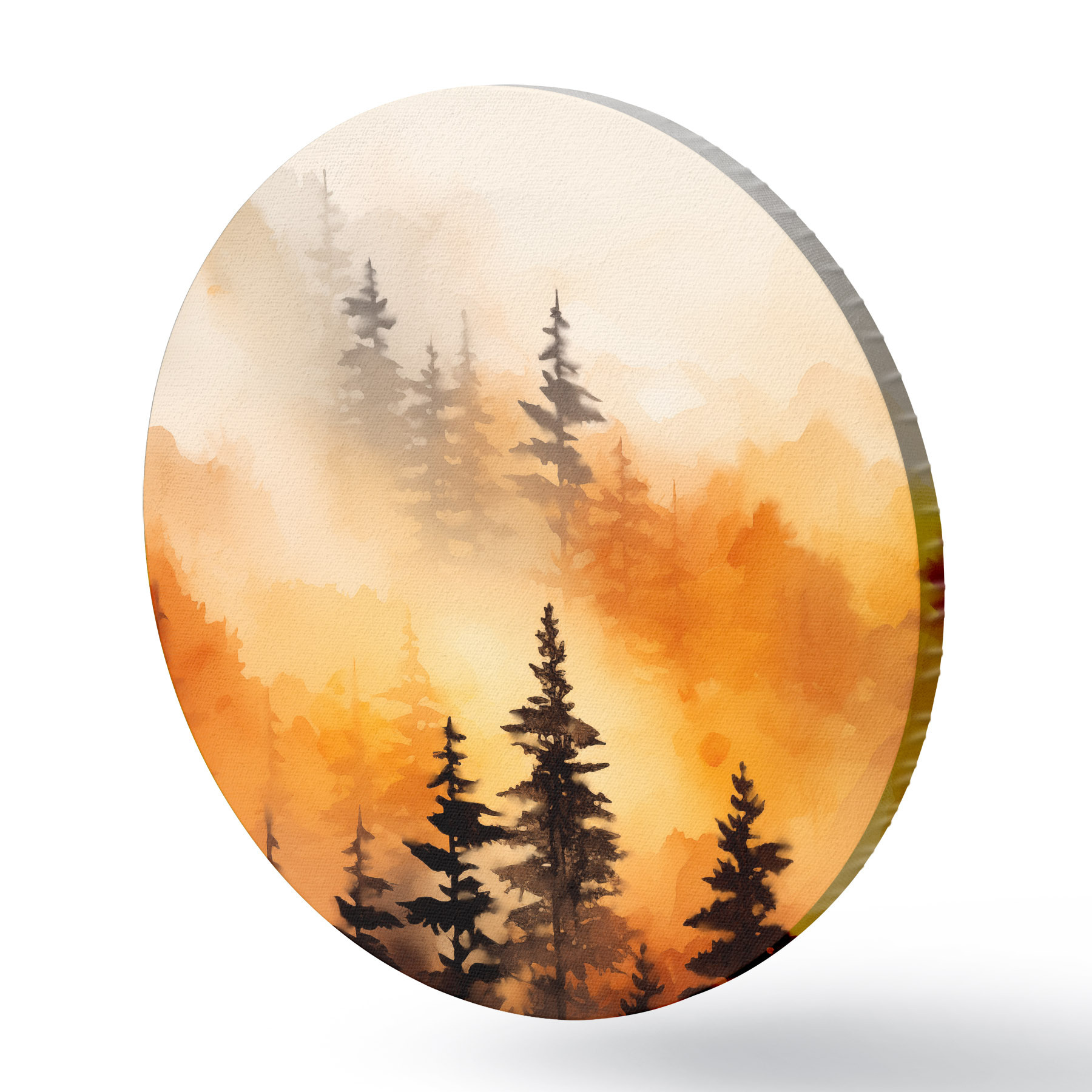Apaļas gleznas Ainavu akvareļglezniecība, kas imitē mežu ar augstām priedēm un kalniem fonā r45170