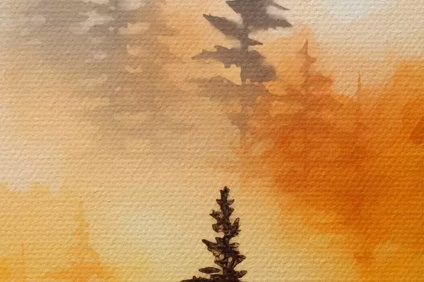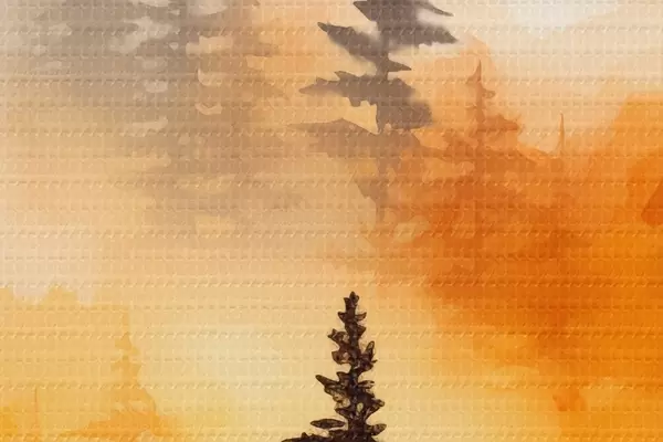 Attēls Ainavu akvareļglezniecība, kas imitē mežu ar augstām priedēm un kalniem fonā Nr r45170