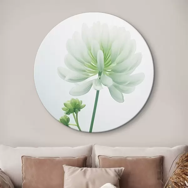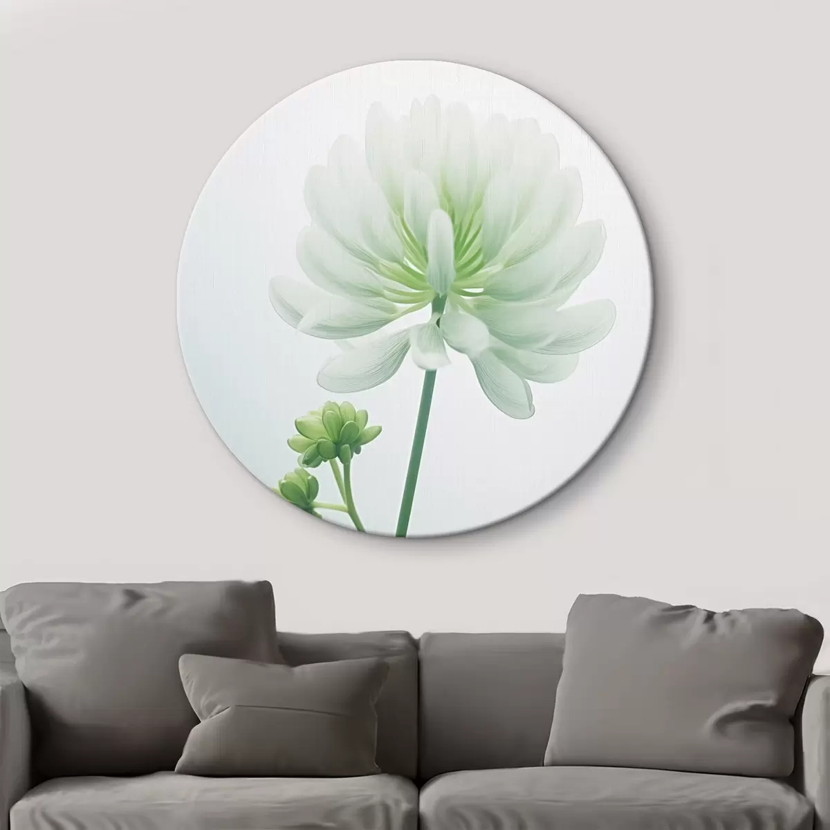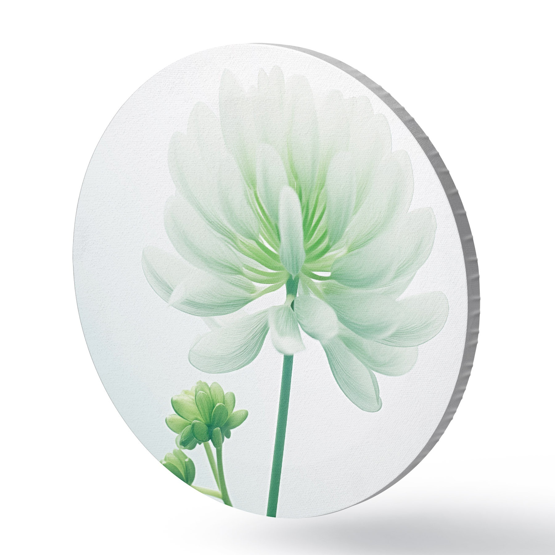 Apaļas gleznas Balts āboliņa zieds ar zaļu stublāju un lapām, maigs apgaismojums, tīrs fons, minimālisma kompozīcija, botānisks r45171