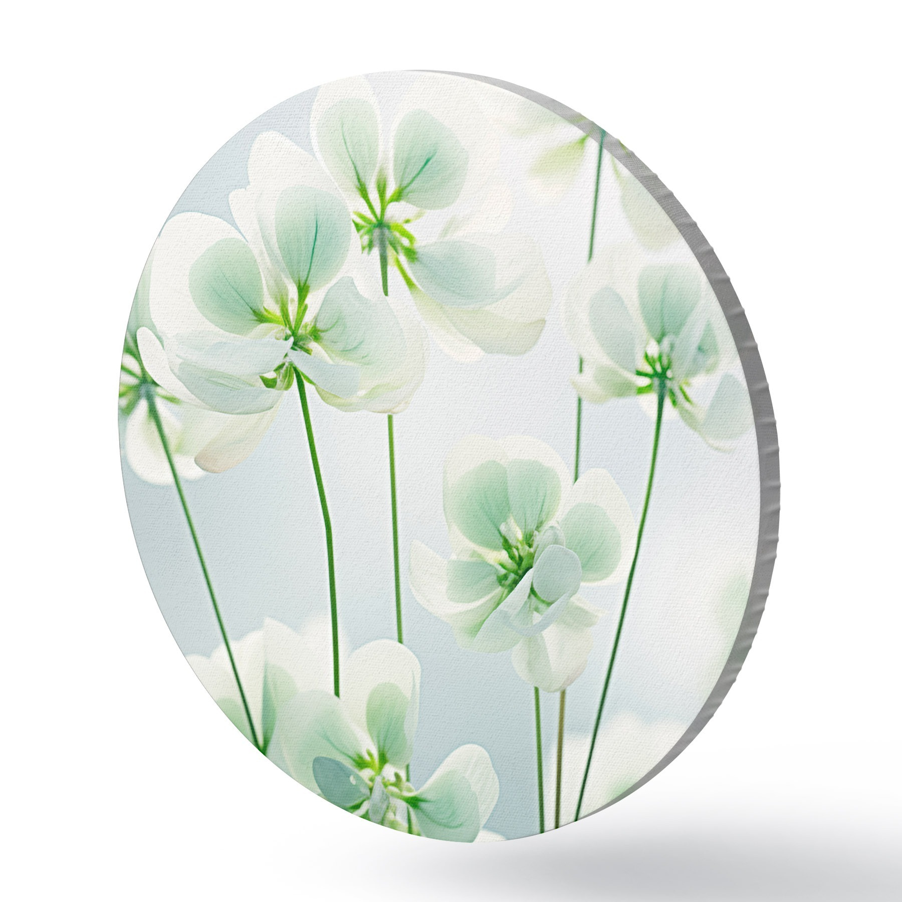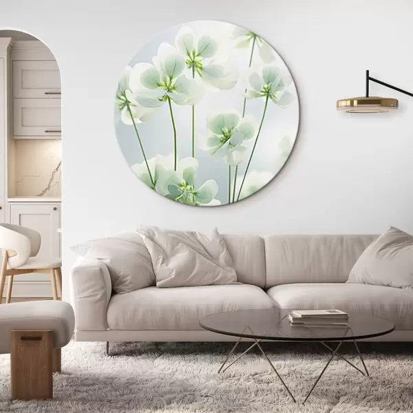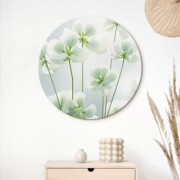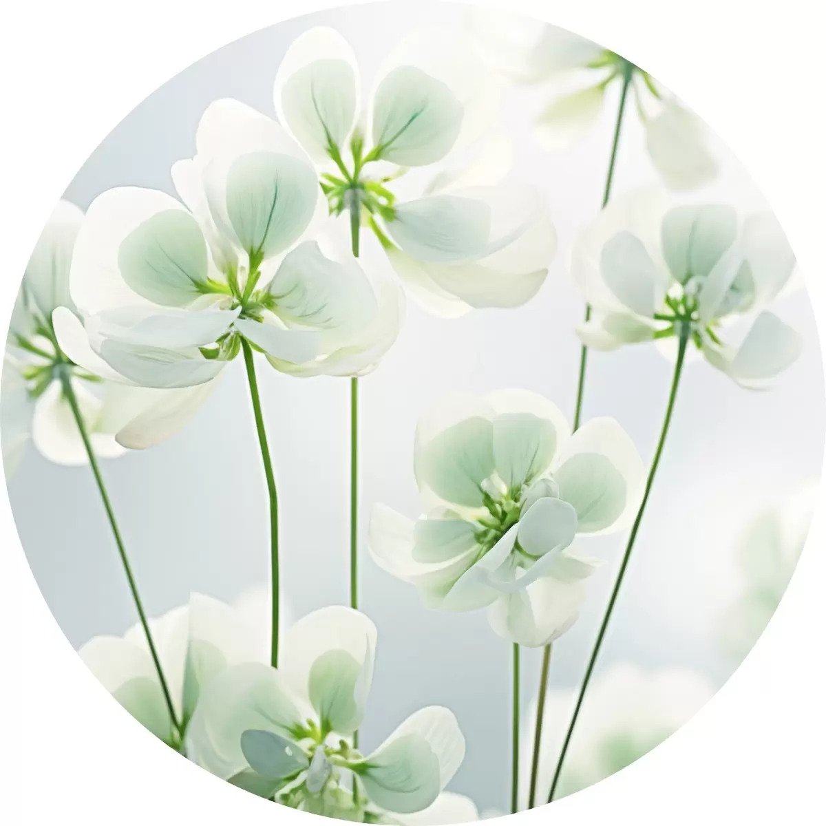 Apaļas gleznas Balti āboliņa ziedi ar zaļu stublāju un lapām, maigs apgaismojums, tīrs fons, minimālisma kompozīcija, botānisks r45172